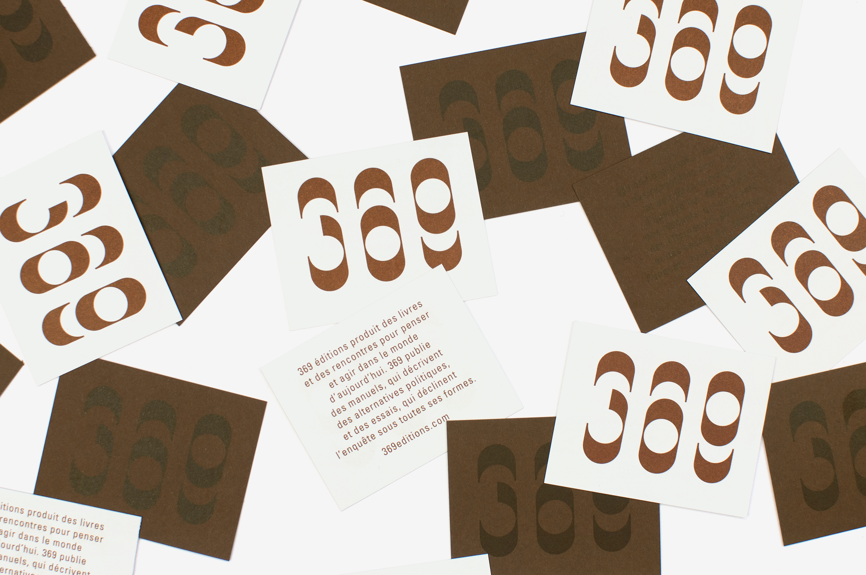 369 est une petite maison d’édition singulière qui publie des livres, des rencontres et du design. Le logotype, dans son dessin, affirme l’idée d’écho, d’ouverture et de modularité. La multiplication (3… 6… 9!) devient élan graphique, et autorise des jeux en termes de couleur et de déconstruction.