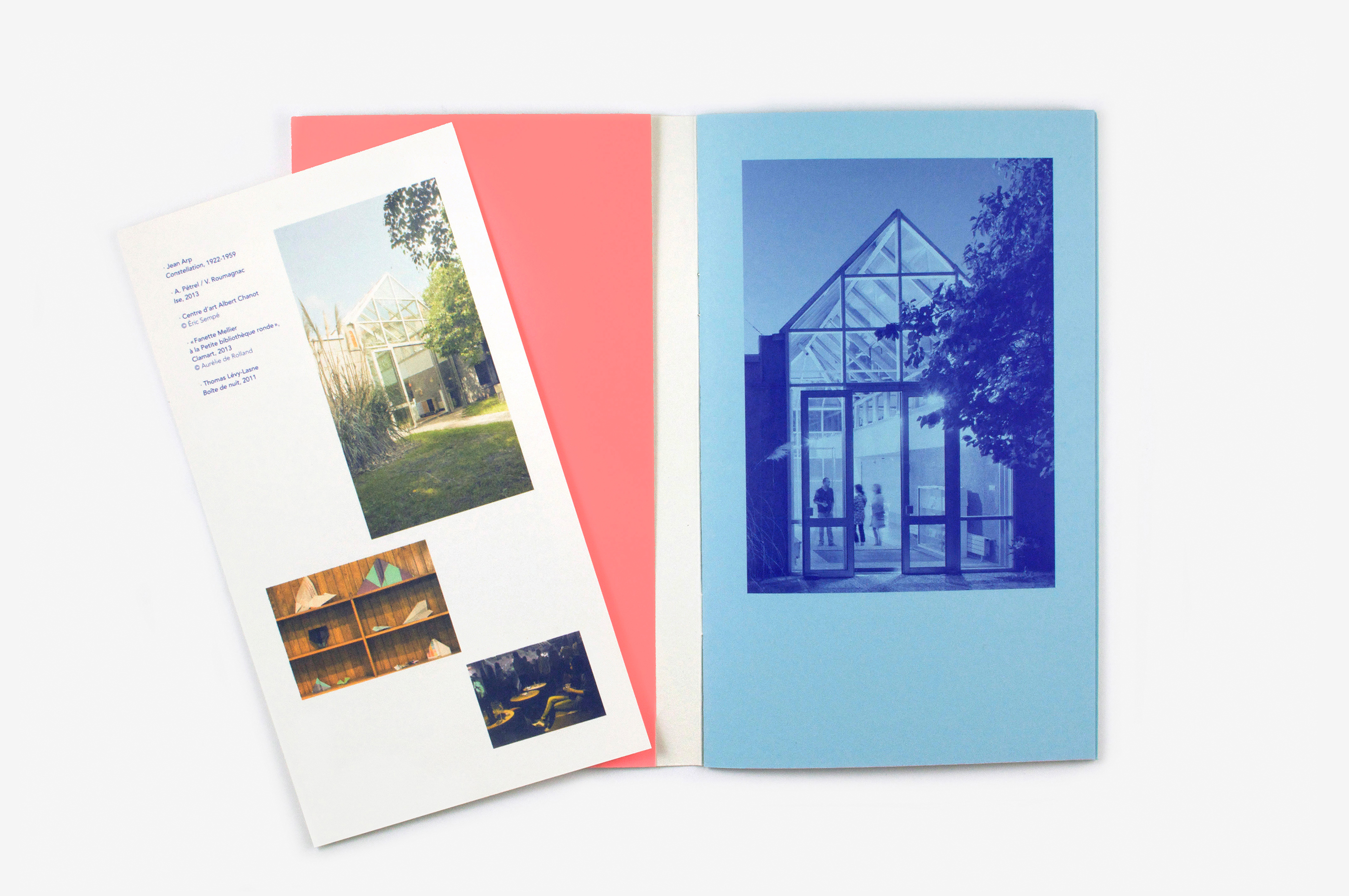 The structure of the Albert Chanot Art center building is the basis of the graphic conception. The house’s characteristic form (which is also used in the logo) was synthetically redesigned to provide a unifying symbol for all communication materials: booklet, invitations, posters. In the booklet, the sign is built and then deconstructed. Inside the front cover, flaps unfold to reveal a calendar, and inside the booklet, the program is presented blue on blue.