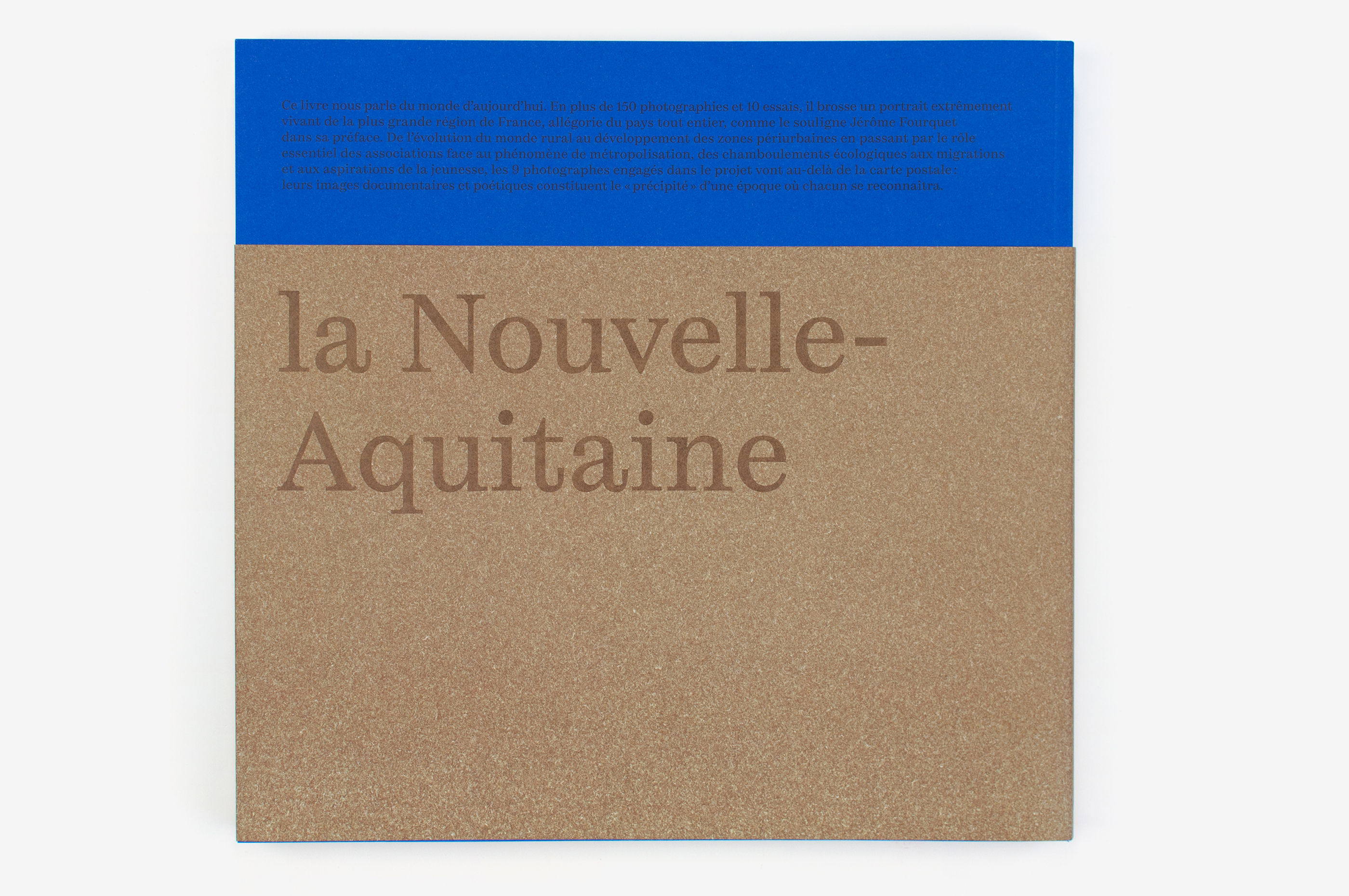 This work presents a collection of works, the result of a photographic commission initiated by the Bordeaux art centre, Frac MÉCA (Fonds régionaux d’art contemporain). The cover design expresses the idea of a territory and a horizon. The full title is debossed into the dust jacket, being an integral part of the dust jacket’s material of fibre paper (using thermochromic paper so that its colour can be changed). The colour grey (a synthesis of photography’s original black and white) structures the entire book, either in flat tints or mixed with the pure inks of the four-colour process, which thus gain in subtlety.