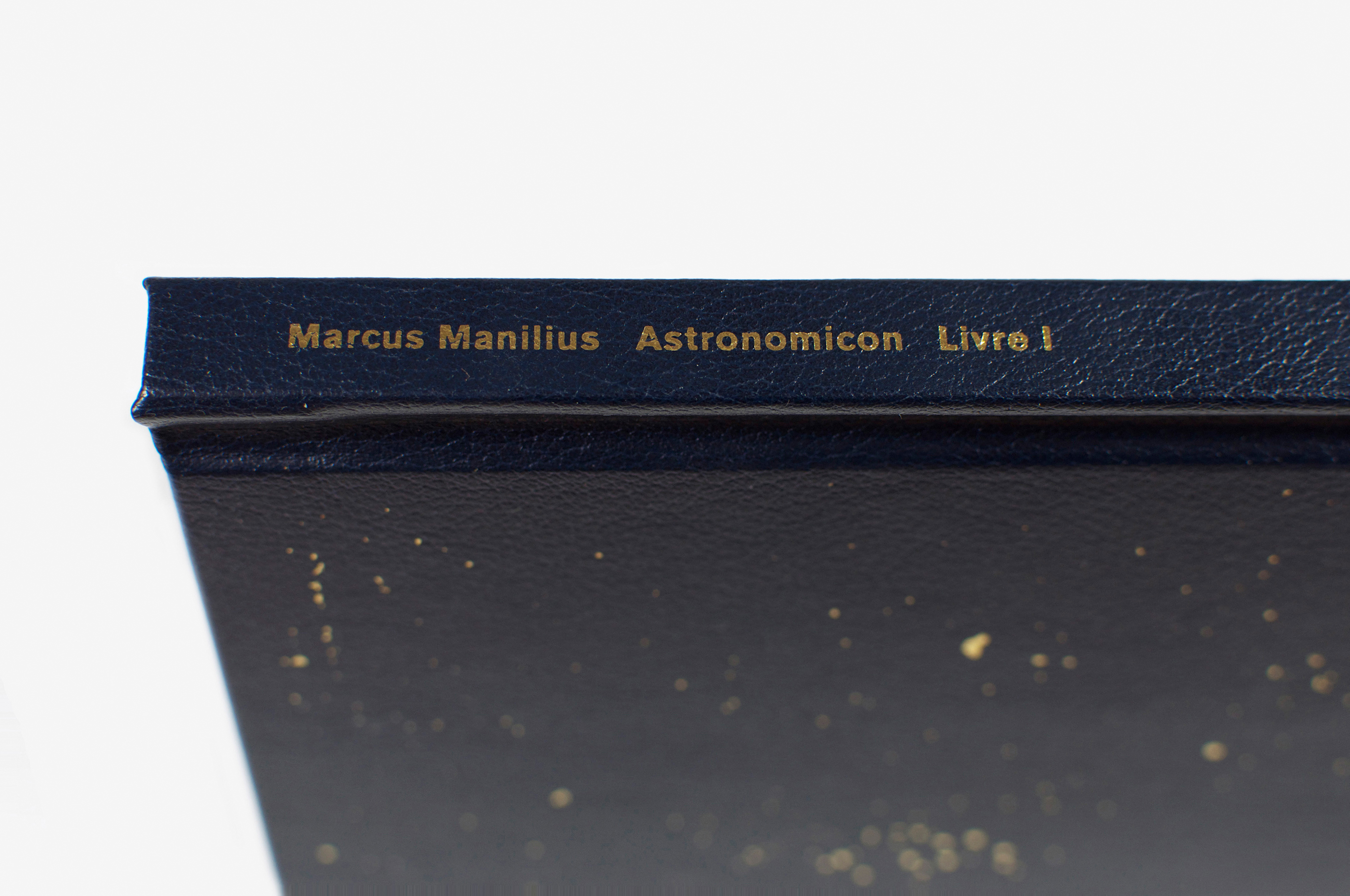 Le texte écrit par Marcus Manilius, un poète et astrologue de la Rome antique, d’origine syrienne, Les astrologiques ou la science sacrée du ciel, est un long poème en cinq livres traitant d’astrologie et d’astronomie. À la lumière de la science moderne, les propos de Marcus Manilius peuvent sembler fantaisistes, mais il se dégage une dimension allégorique universelle de ses interprétations insolites de phénomènes physiques et météorologiques. Le livre I de l’Astronomicon est basé sur la première édition imprimée de ce texte, préparée par Joseph Juste Scaliger, un érudit passionné d’astronomie. Cette édition en latin est conservée dans de rares bibliothèques en Europe. Fac-similé à l’échelle 1 de la version originale numérisée, l’édition est plongée dans une mystérieuse «nuit», en écho à l’oubli dans lequel est tombé ce texte. La traduction du texte en français datant du XVIIIe siècle, se trouve sur l’envers des pages reliées à la japonaise: libre au lecteur de laisser l’ouvrage dans sa «nuit» éditoriale, ou d’en lire la traduction, pour cela il faudra déchirer les pages. La même logique a été appliquée à la couverture de l’ouvrage, rembordée de cuir bleu-noir, sur laquelle les petites poussières sont dorées à chaud. Les pages de garde présentent une image photographique de la voute étoilée, imprimée en noir sur papier toilé, en vis-à-vis de la poussière stellaire du fac-similé.