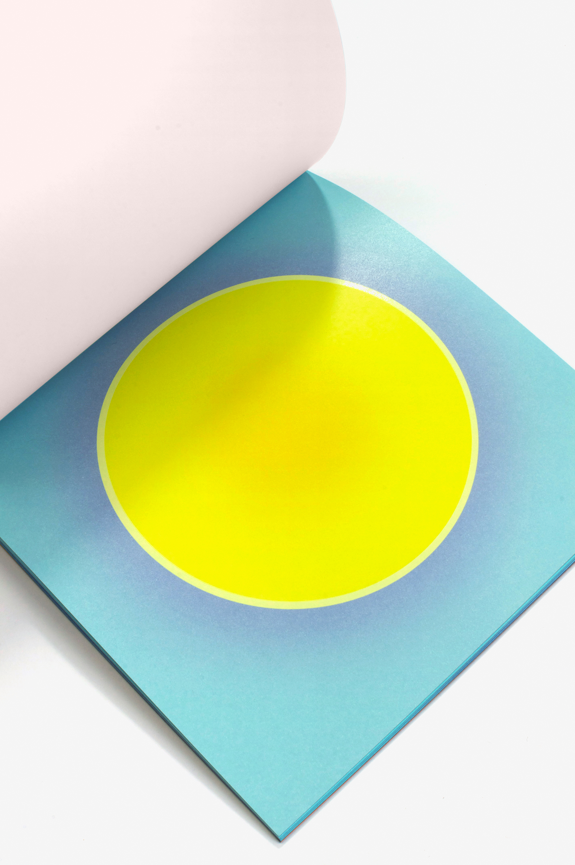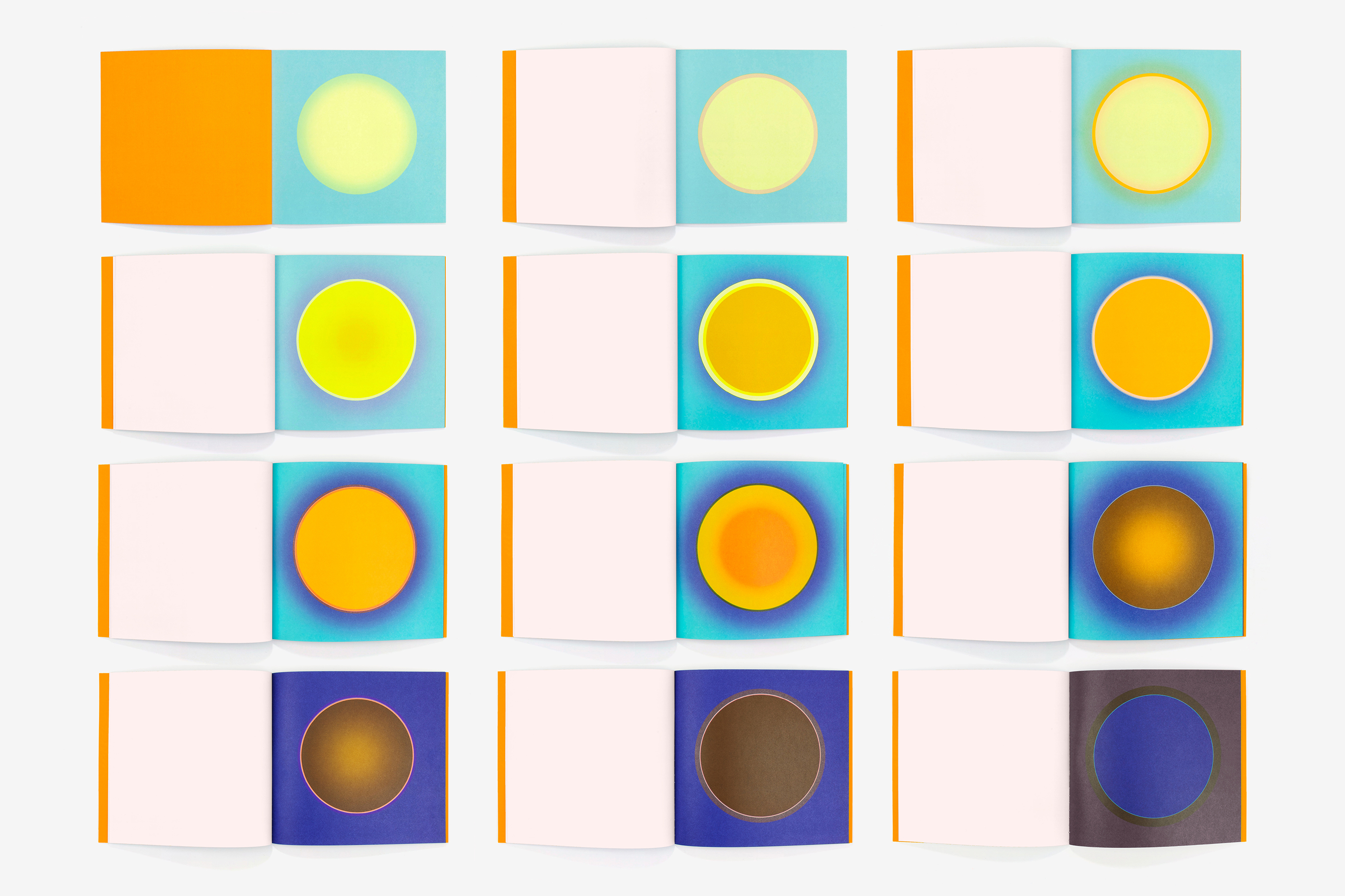 Au Soleil was dreamed up (literally) as a published twin of the book Dans la lune. Some characteristics of the books are identical (format, printing technique …). Others are different and emphasise the uniqueness of each book: number of pages, binding, paper, arrangement of forms and subjects… The simple illustration of the cycle of daylight hours in the book serves (as does the cycle in the moon book) as a pretext for a chromatic exploration within the confines of the book. The colour is diffused through a series of haloes between the sun and the sky that run into one another in an almost immaterial way. The subtle and vibrant light emanating from it tells us a story, that of a book “in itself”.