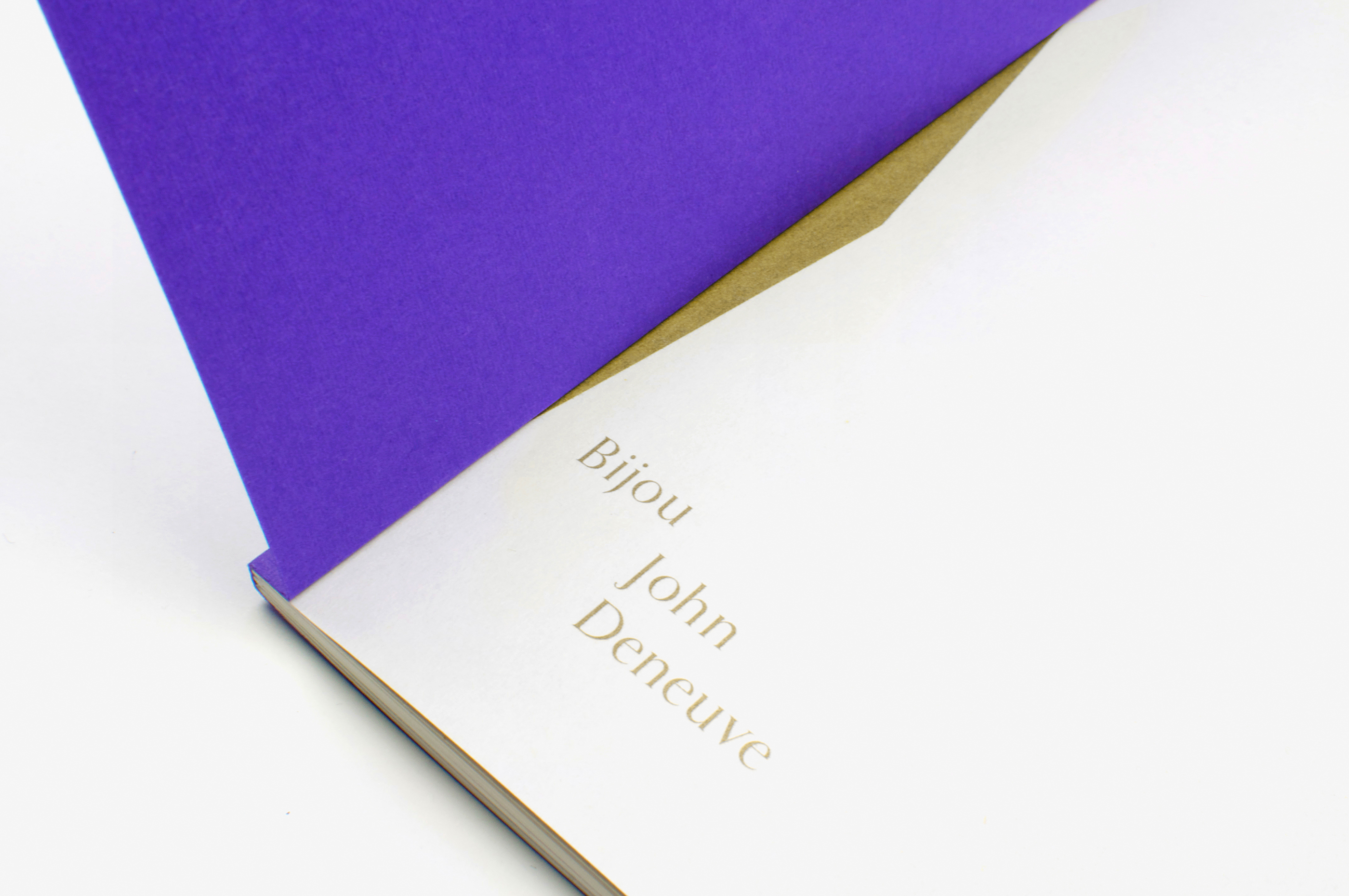 Le premier recueil poétique de l’artiste visuelle et musicale John Deneuve, est mis en page de façon classique. La typographie, l’encre dorée et la présence d’une forme incisive nichée dans le pli central, traduisent une préciosité qui contraste avec l’irrévérence de ses poèmes.