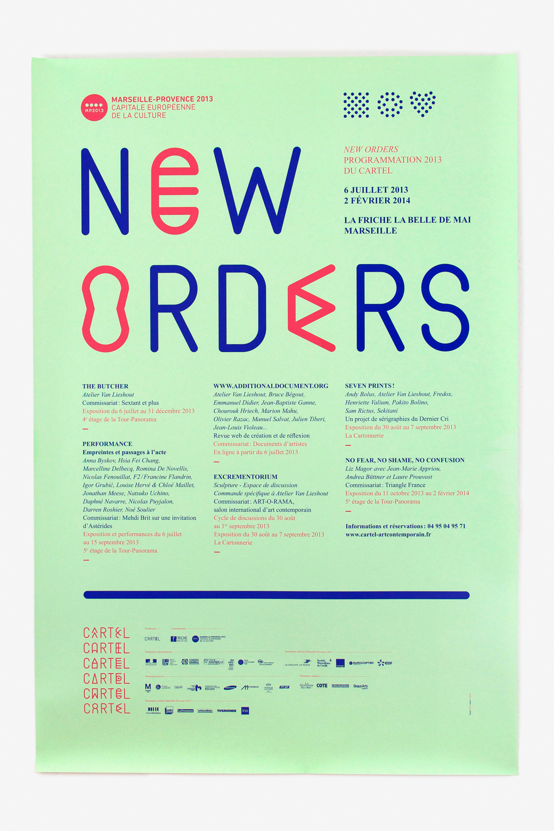 Cartel regroupe des associations (situées à la Friche la Belle de mai, à Marseille) qui agissent dans le champ de l’art contemporain. Chaque membre a une démarche singulière et possède son identité visuelle propre. La simplicité du système graphique reflète cette identité composite. Toute la communication est basée sur un alphabet original, dont les consonnes sont communes à tous les membres du Cartel. Les voyelles sont en revanche spécifiques à chacune des six structures, qui possède sa propre version de l’alphabet. Le dessin peu conventionnel de ces voyelles, davantage graphique que typographique, rend la lecture possible uniquement dans le flux du texte composé. La multiplicité des couleurs, papiers et matières des supports fait aussi écho à cette diversité.