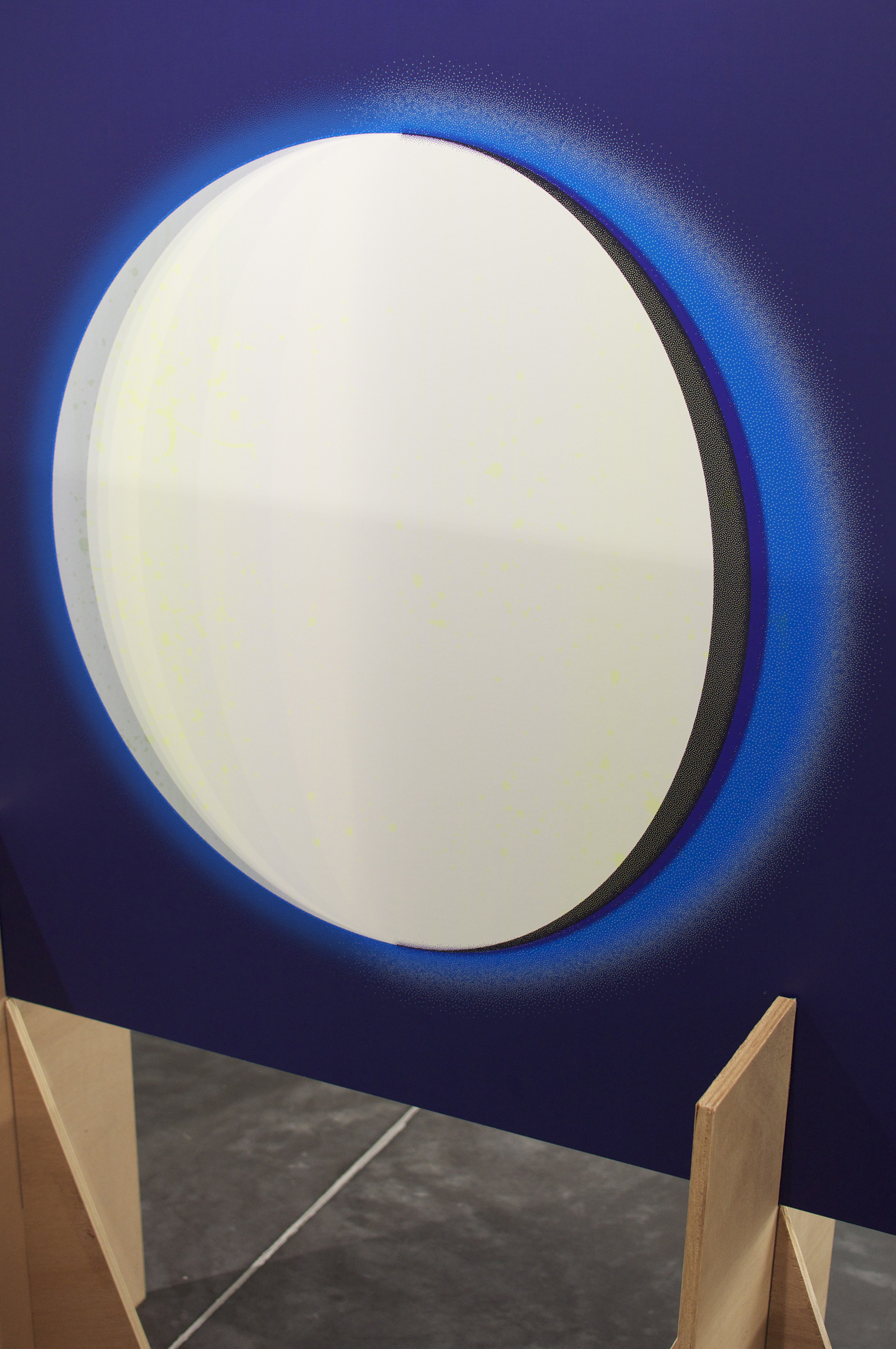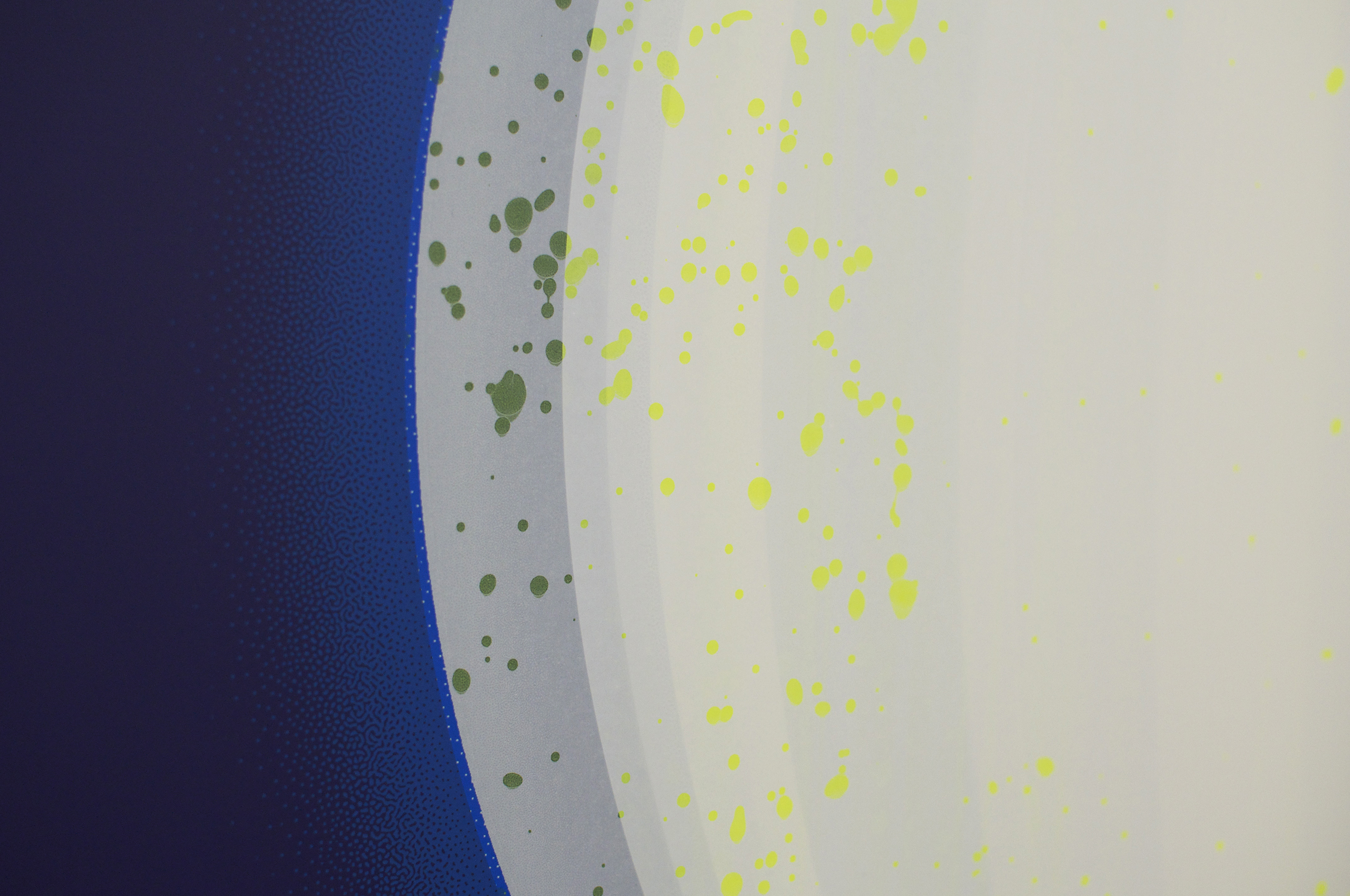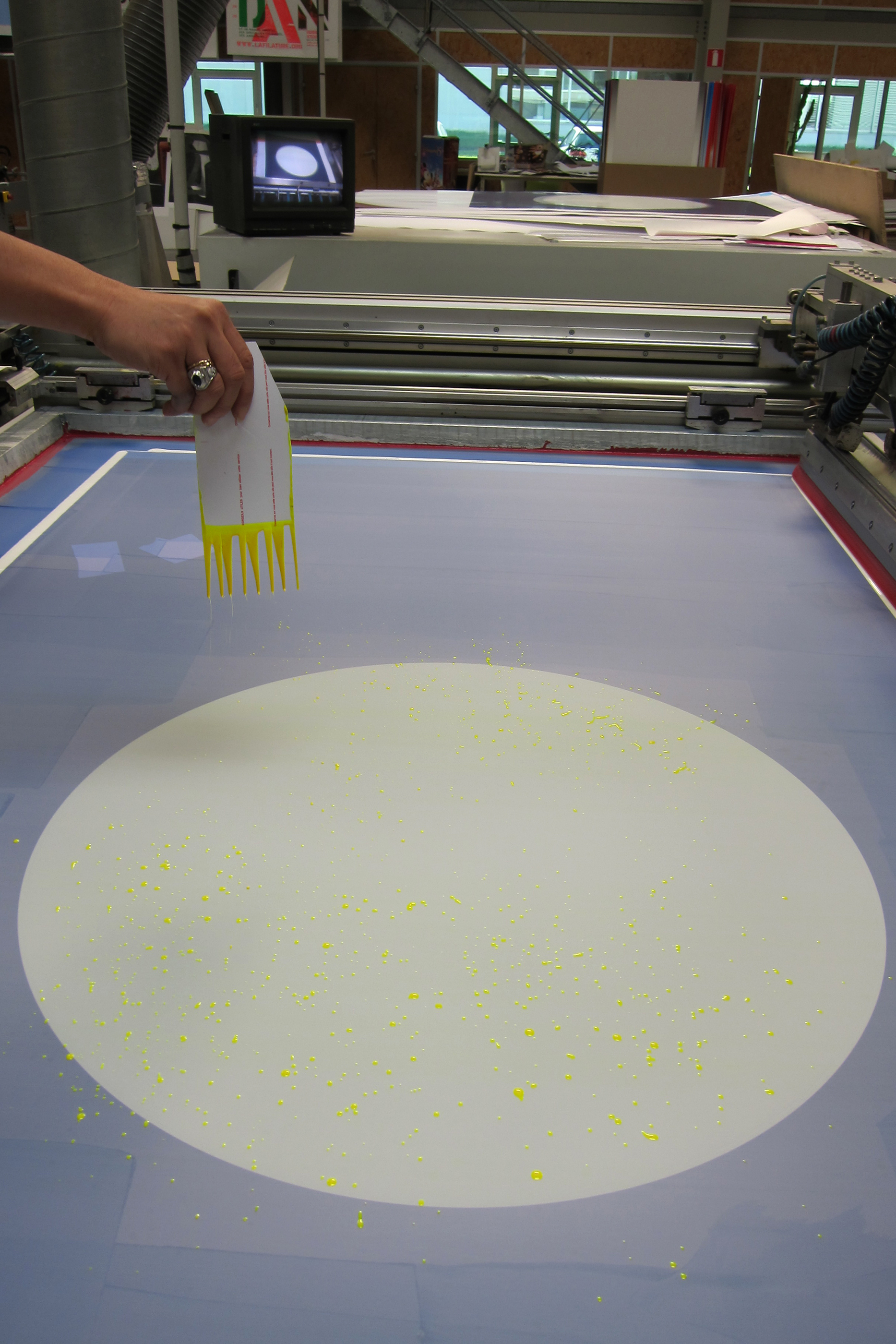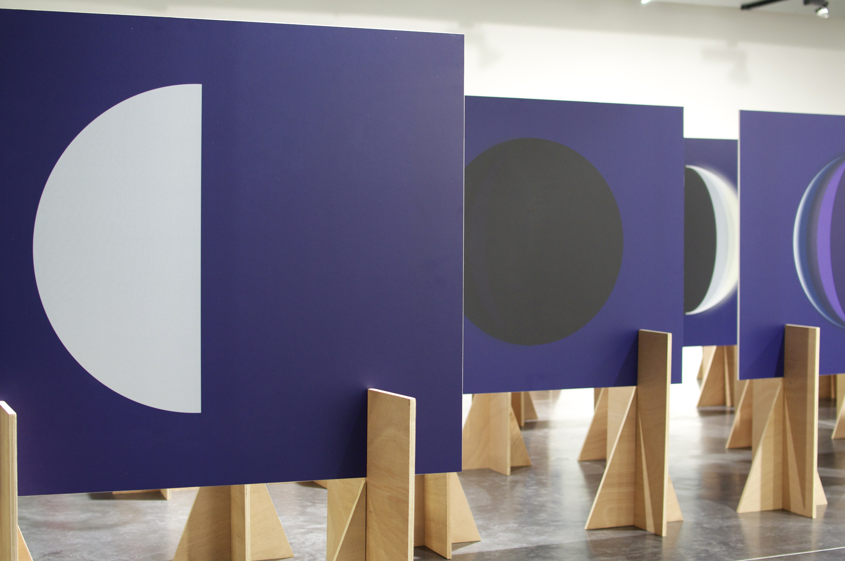 L’exposition présente un cycle lunaire en sérigraphie, dans lequel chaque lune est surimprimée à la précédente. Ainsi, au début du cycle, la lune est formée d’une seule couche de couleur. À la fin du cycle, la lune est surimprimée aux 30 couches précédentes. Les aléas colorés, les jeux d’opacité, la sensualité des encres et les coulures aléatoires ont dicté l’évolution du cycle. L’expérimentation de la plasticité sérigraphique est au cœur du projet. La thématique se situe à mi-chemin entre science et pure poésie: sa matérialisation oscille entre contrainte technique et expérimentation. La scénographie prend en compte cette dimension didactique et rêveuse, avec la création d’un mobilier original du scénographe Grégoire Romanet. Les lunes, enchâssées dans un support en bois et disposées selon la logique calendaire, ont été mises à l’horizontale au fil des jours. À la fin de l’exposition, l’ensemble compose une immense planche didactique. La question de la déambulation est au cœur de ce dispositif scénographique.