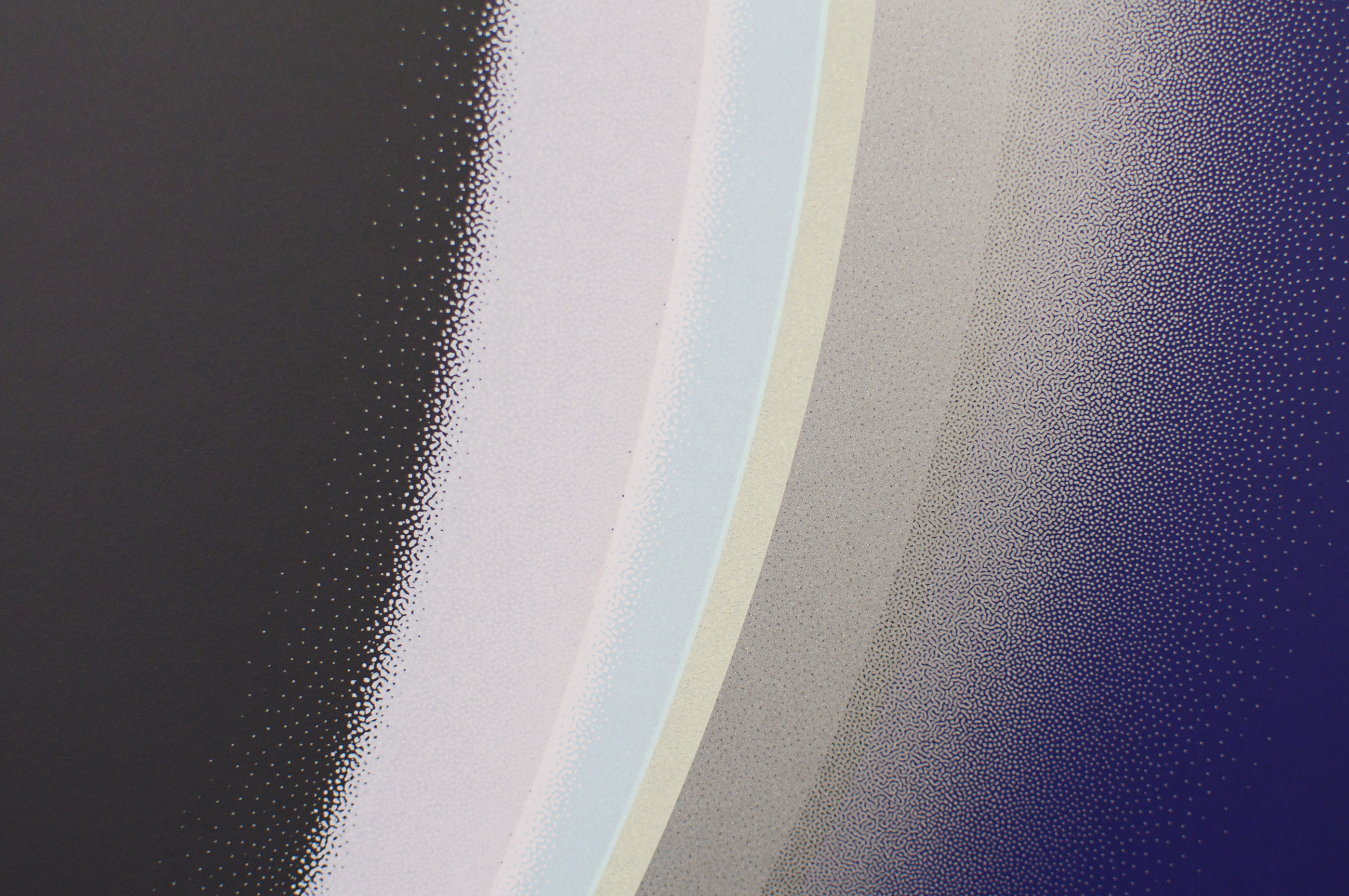 The exhibition features a screen printed lunar cycle, in which each moon is superimposed to the previous one. Therefore, at the beginning of the cycle, the moon is made out of a single layer of ink. At the end of the cycle, the moon is superimposed to the 30 previous layers. The colorful hazards, opacity tricks, ink sensualities and random streaks dictated the evolution of the cycle. Experimenting with the plasticity of screen printing is at the heart of the project. The theme is halfway between science and pure poetry: its materialization oscillates between technical constraints and experimentation. The set design works around this educational and dreamy aspect thanks to the creation of an original furniture by the designer Grégoire Romanet. The moons embedded in a wooden stand and arranged according to the calendar logic, were displayed horizontally day after day. At the end of the exhibition, they all formed a massive didactic board. The act of wandering in a space is at the heart of this set design.
