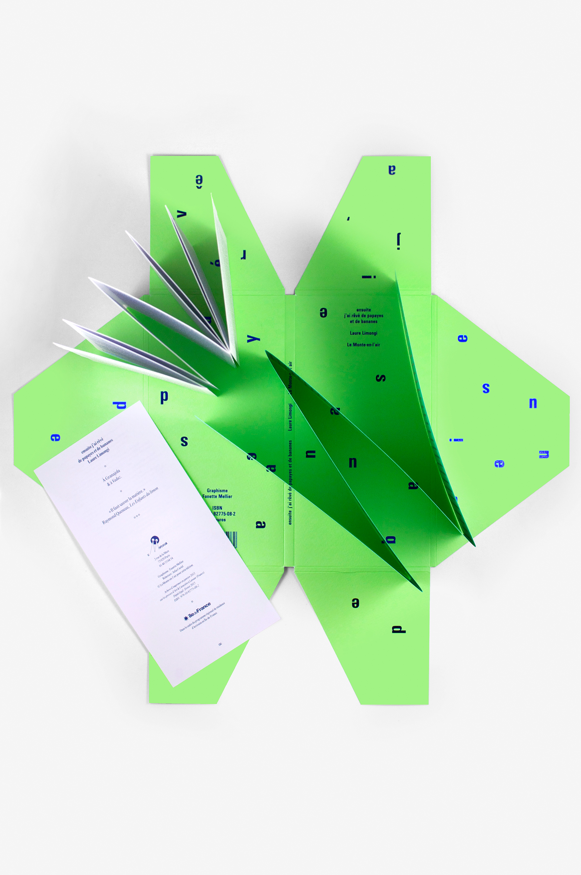 In this text written by Laure Limongi, humans coexist with intelligent androids. One of these, Silvio, through contact with a woman who seems to be a double of the writer, decides to memorise the existing data on extinct languages, to save those languages on the road to extinction and also to create a language… As if to echo this story, this book is not bound. It takes substance, nevertheless, from the magic of its folds, folded and unfolded, and can be opened up in space. It invites us to a different kind of reading, resistance reading. In loudly proclaiming its iconoclastic materiality, it gives echo to languages that are disappearing. The six flaps of the covering jacket prompt a game of composition/decomposition with the mysterious title of the book. The body of the book (the inner pages) is a concertina-like horizontal leaflet, the text laid out on a zigzag pagination. A list of recently extinct languages is given as an appendix. Arranged on a vertical concertina leaflet the list can be viewed as a continuous loop… The whole book can be flattened out and then reconstructed, like a potential space.