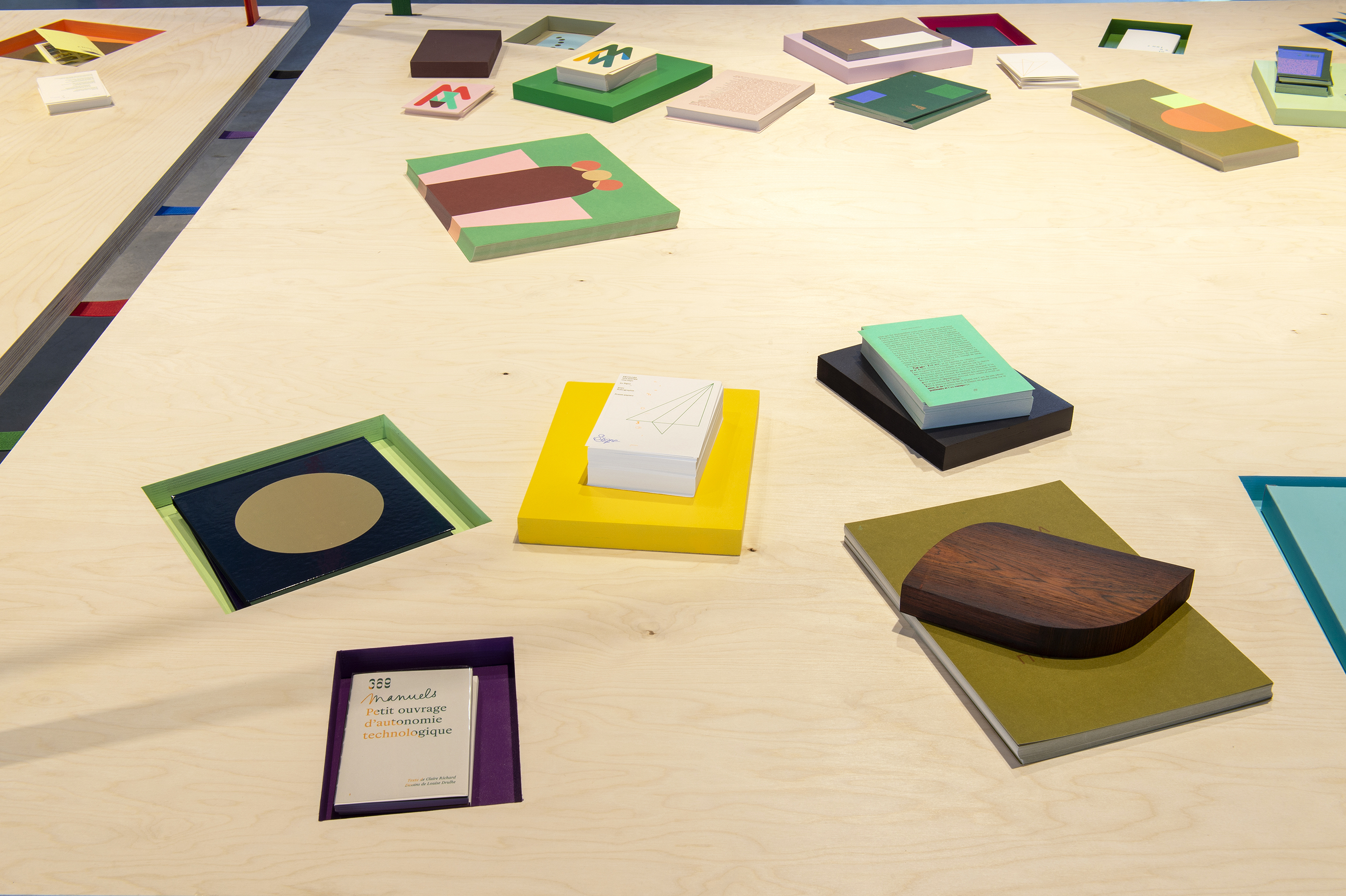 Les trente livres présentés dans mon exposition Feuilles volantes ont pour dénominateur commun mon implication dans leur conception éditoriale et graphique. Ils ont tous été investis de façon singulière, en dehors du cadre de la commande, en me positionnant tour à tour comme autrice, initiatrice, plasticienne ou accompagnatrice éditoriale. En plus d’incarner de façon métaphorique cette production éditoriale, les Feuilles volantes sont des pages littéralement échappées de chacun de ces trente ouvrages. Choisies soigneusement par mes soins, puis ré-imprimées à partir des fichiers archivés, mais dans des spectres chromatiques différents, elles en offrent une relecture dont la couleur est l’ingrédient essentiel. Mises à la disposition des visiteurs au fil de l’exposition, elles constituaient un paysage de papier mouvant, disposé en coup de vent pour former un nouveau projet éditorial, constellation à la reliure immatérielle. La scénographie ré-active une collaboration entamée avec Grégoire Romanet, il y a plus 15 ans, et dont Chaumont avait déjà été le théâtre avec l’exposition Encroyable. Il propose ici un ensemble de tables suspendues et boîtes à formes en mouvement perpétuel, faisant écho et servant de support à mes Feuilles volantes. Les presse-papiers dessinés et fabriqués par Pernelle Poyet apportent une touche ludique à cet ensemble polymorphe.