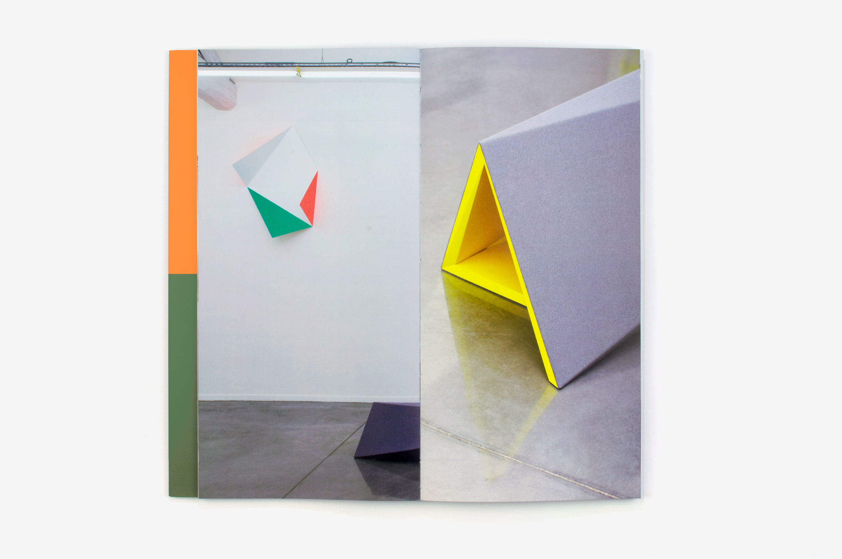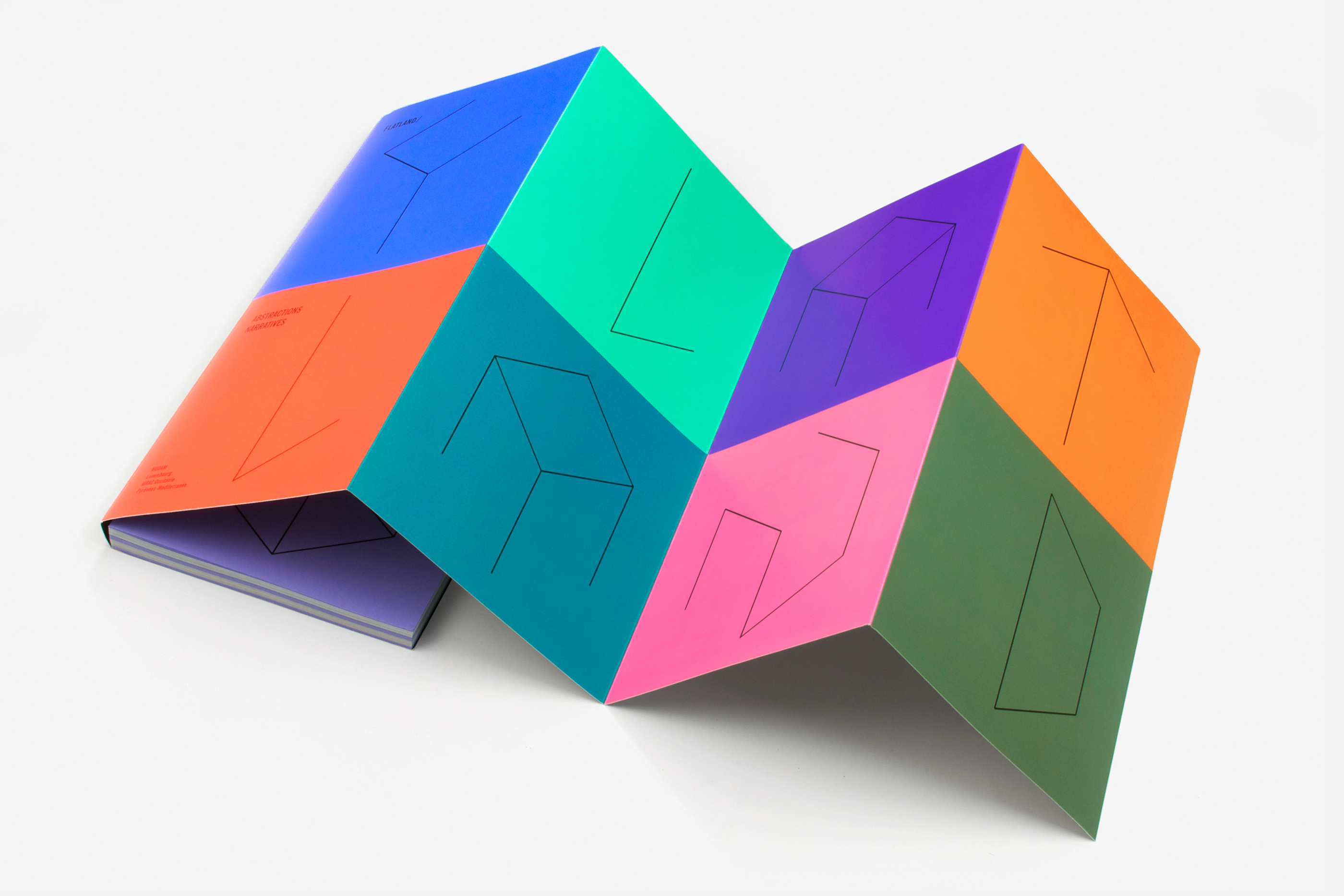 This catalogue was produced for the exhibition Flatland, Abstractions narratives curated by Marianne Derrien and Sarah Ihler-Meyer and consisting of two parts, the first at MRAC (Sérignan) and the second at MUDAM (Luxembourg). The works were inspired by the famous book Flatland by Edwin A. Abbott (the hero of which is a square) and put forward narratives based on abstract forms. The book seeks to offer a “spatial installation” of the content. The sections, in axonometric lettering, are physically indicated by the colours of the concertina folds. The format of the book is based on a square (our hero too!) as is the grid of the page layout. The Swiss binding, exposing the black threads and glue, makes it possible to open the book out flat. The two parts of the project are presented individually in the catalogue, the images taking us on a journey through the exhibition spaces. Different angles, reflections, multiple viewpoints and the handing of recto/verso accentuate the feeling of immersion.