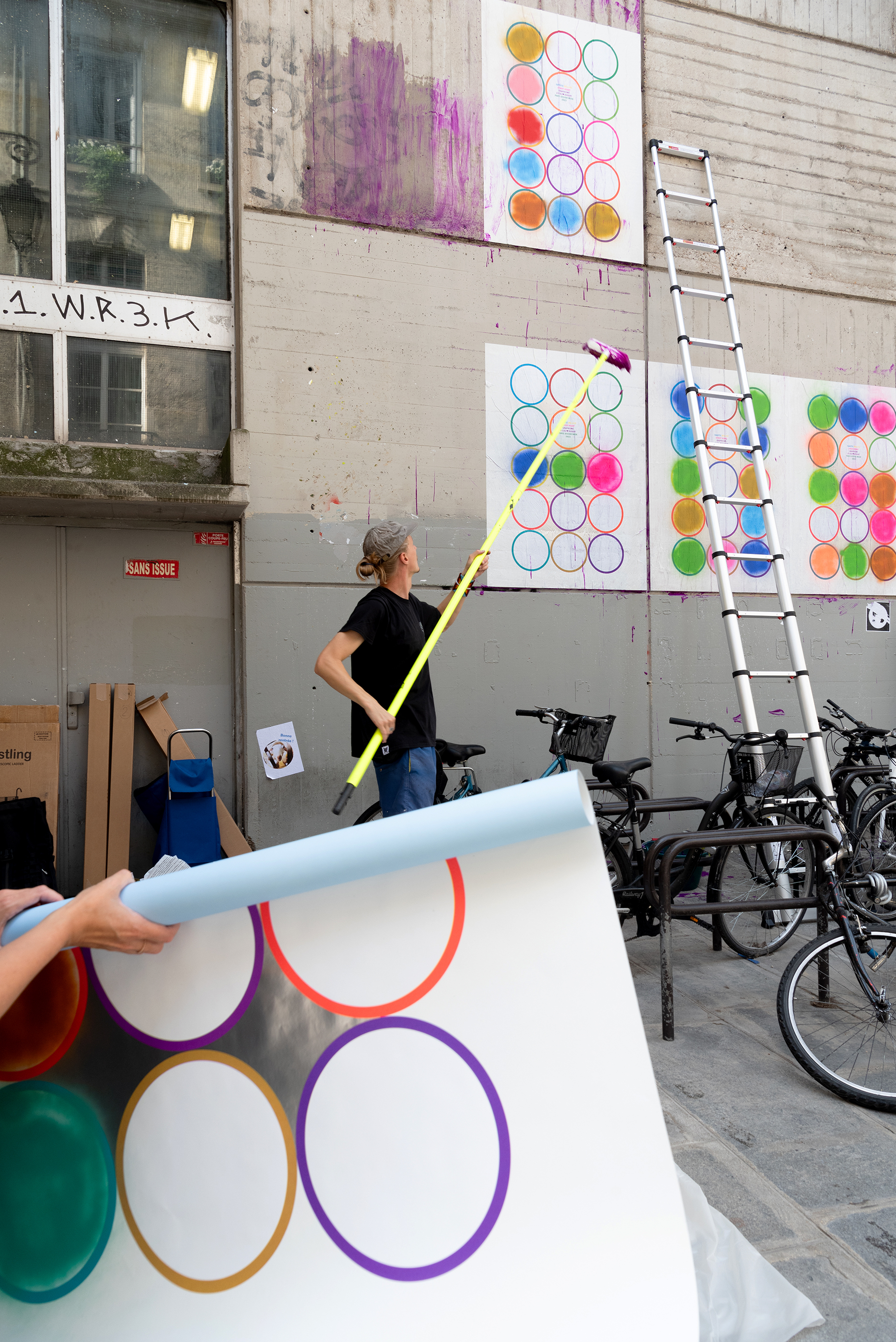 This installation was created on the wall of the Saint-Merri school for the Graphisme à ciel ouvert/Paris Design week festival. Ink from a spray can – a favourite street-art tool – is used here to fill in dots on a typographic grid. The word Flux-Us (the hyphenation leading us to read it in 2 stages) resonates with the urban flow and the utopian ideal of art for everyone, while including a nod to the Pompidou Centre located just round the corner!