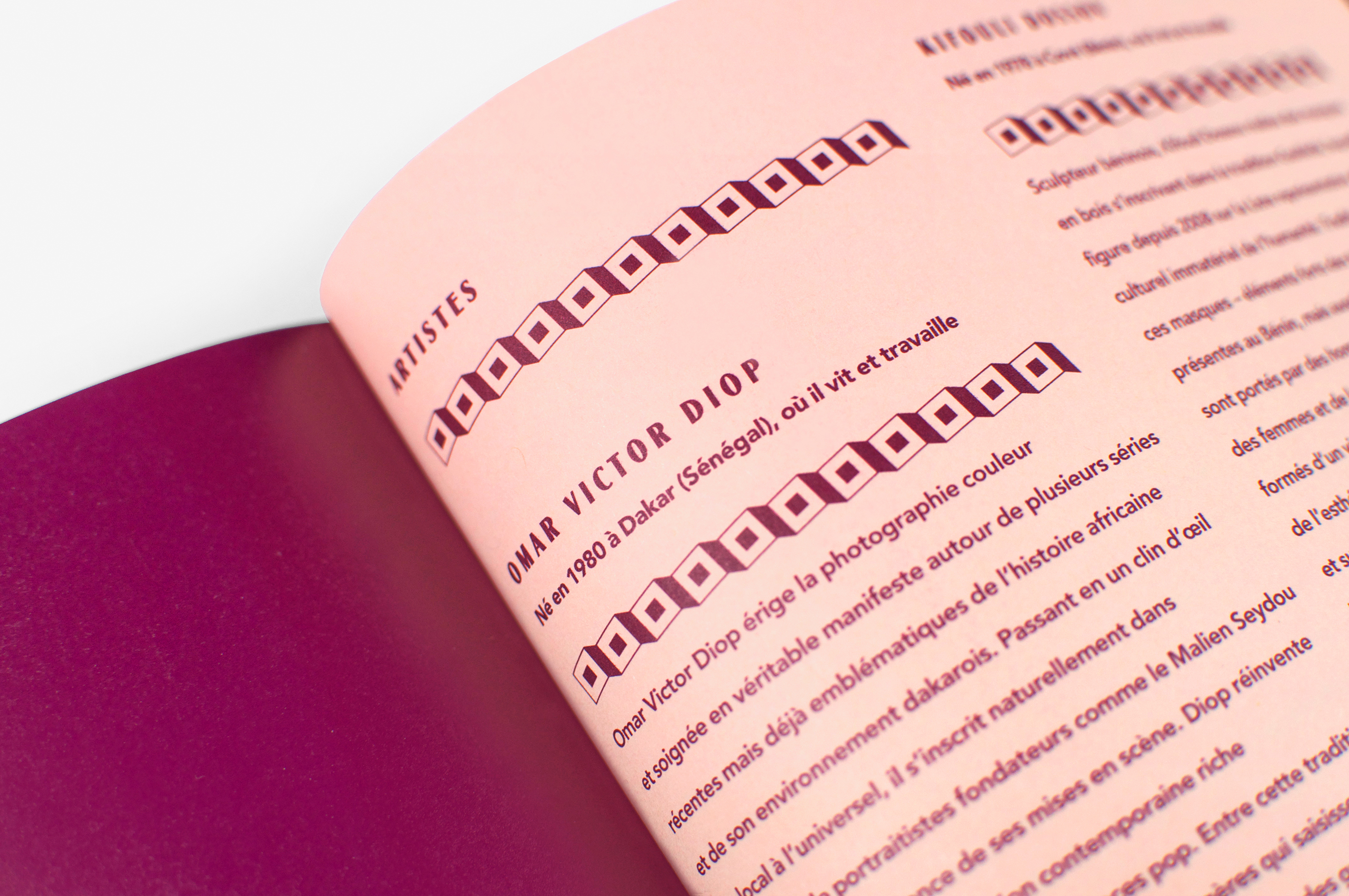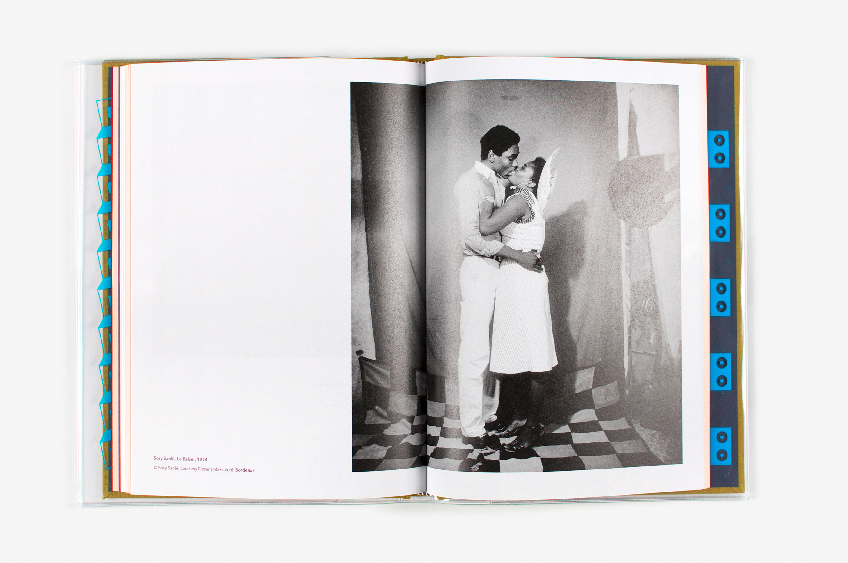 Cet ouvrage présente les travaux d’artistes contemporains africains dont les œuvres font écho aux cultures populaires de l’Afrique subsaharienne. Le contraste entre la matière plastique et la toile de la couverture évoque le métissage entre traditions et modernités. Des motifs inspirés de matières tissées folkloriques sont déployés sur la jaquette qui recouvre et protège le livre. Ils s’inscrivent dans un jeu de composition complémentaire avec la typographie, qui est dorée à chaud sur la couverture toilée. Cette idée de rythme et de tissage, qui structure la composition et la mise en page intérieure, est aussi présente dans la matière même de l’ouvrage: alternance ‘millefeuille’ des cahiers textes et images, tranchefile tissé noir et blanc…