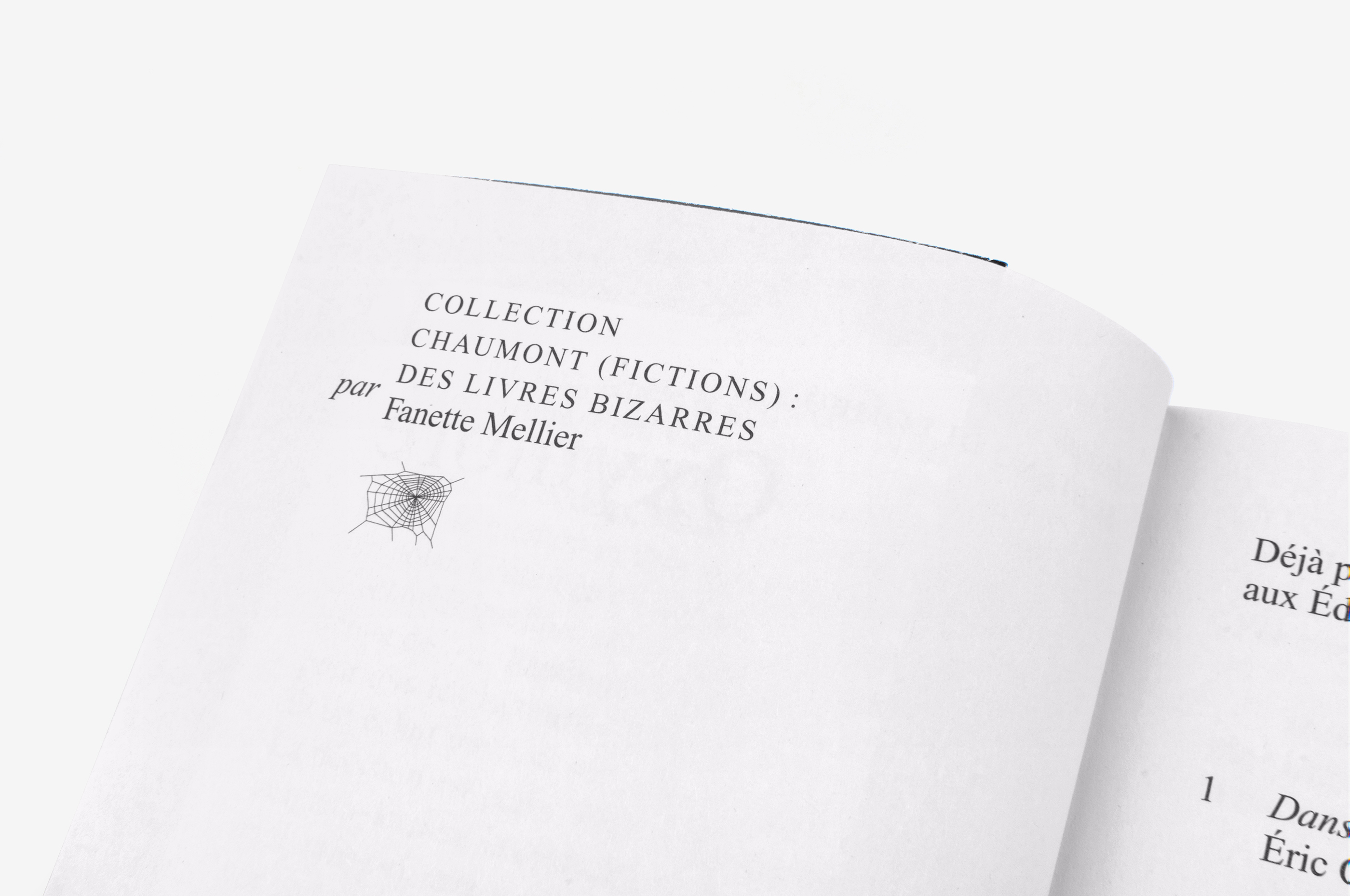 Ce livre est le cinquième ouvrage de la collection Chaumont: fictions. Des livres bizarres, initiée lors de ma résidence à Chaumont en 2007. Il a été écrit plus de dix ans après les quatre premiers ouvrages, par l’artiste pluridisciplinaire Joseph Schiano di Lombo dont c’est le premier roman. L’ouvrage vient clore ce projet éditorial, qui a ouvert la voie à beaucoup de projets d’édition personnels. Le livre, dans son graphisme, empreinte la forme archétypale du polar dans ce qu’elle a de plus mainstream. Néanmoins, le façonnage brouille bizarrement les pistes en conférant une dimension factice au livre. Tranche, dos, quatrième de couverture, sens de lecture… le lecteur est ici leurré par la mise en forme, tout autant que par le texte. La gamme colorée traditionnelle du roman policier est bien présente, mais rendue fébrile par des jeux de surimpression. Les lézardes, à l’intérieur du livre, sont réveillées par l’encre blanche. Des empreintes digitales dorées à chaud en couverture nous conduisent vers un coupable à quatre mains!