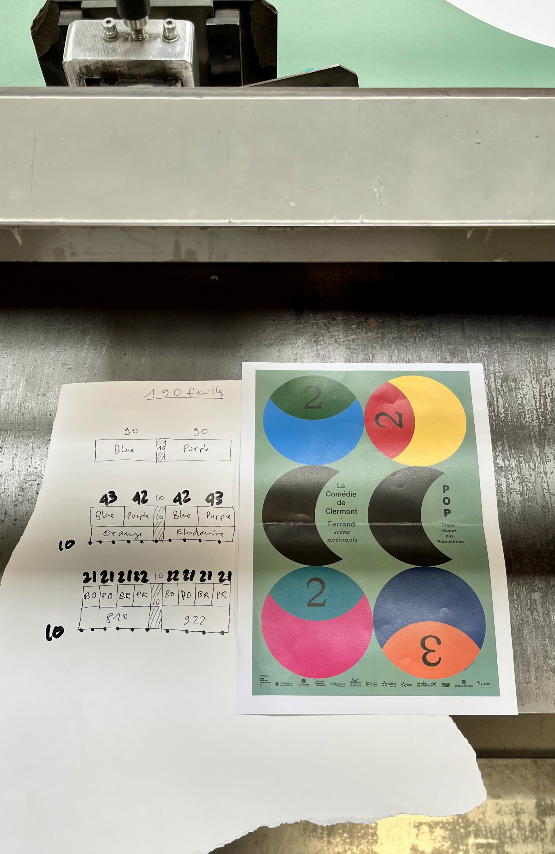 Two Cs, like two open parentheses… The circular shape of the stage, and the oculus in its entrance hall naturally led me to design these two open moons for the Comédie de Clermont’s logo. Their shape and arrangement suggest the idea of a “counterform”: metaphorically, this (inclusive) counterform is represented by the audience. The shape also represents night, eclipse, spotlight, stage and wings: the visible and the non-visible. In its form it evokes the roundness of the word “pop” and the idea of an eye. It moves over time like a caterpillar, drawing a frame, a frieze or a series of objects, according to the needs and the context. It is in this way that the identity of the theatre takes shape from day to day, in a movement that is both linear and protean.