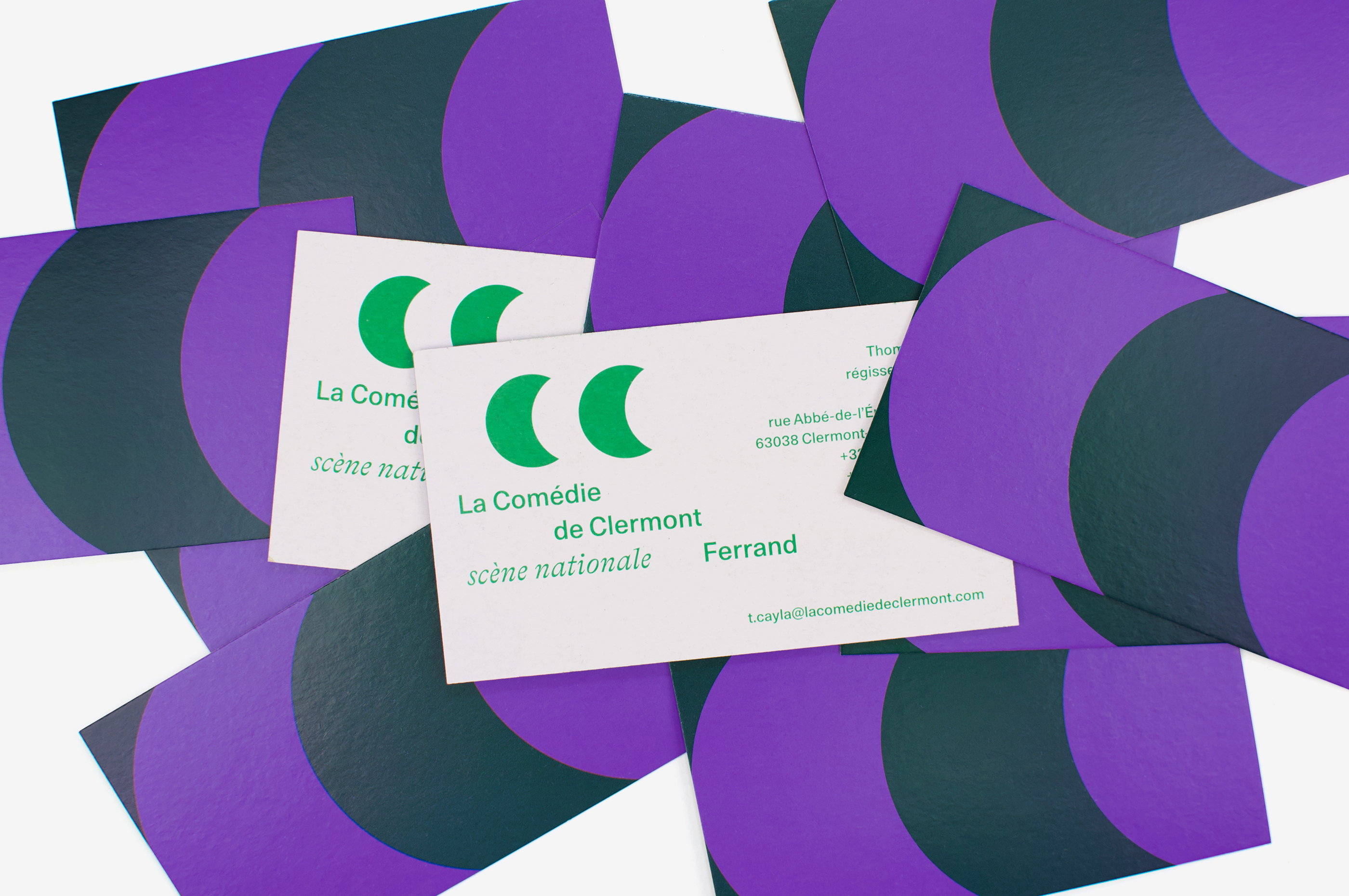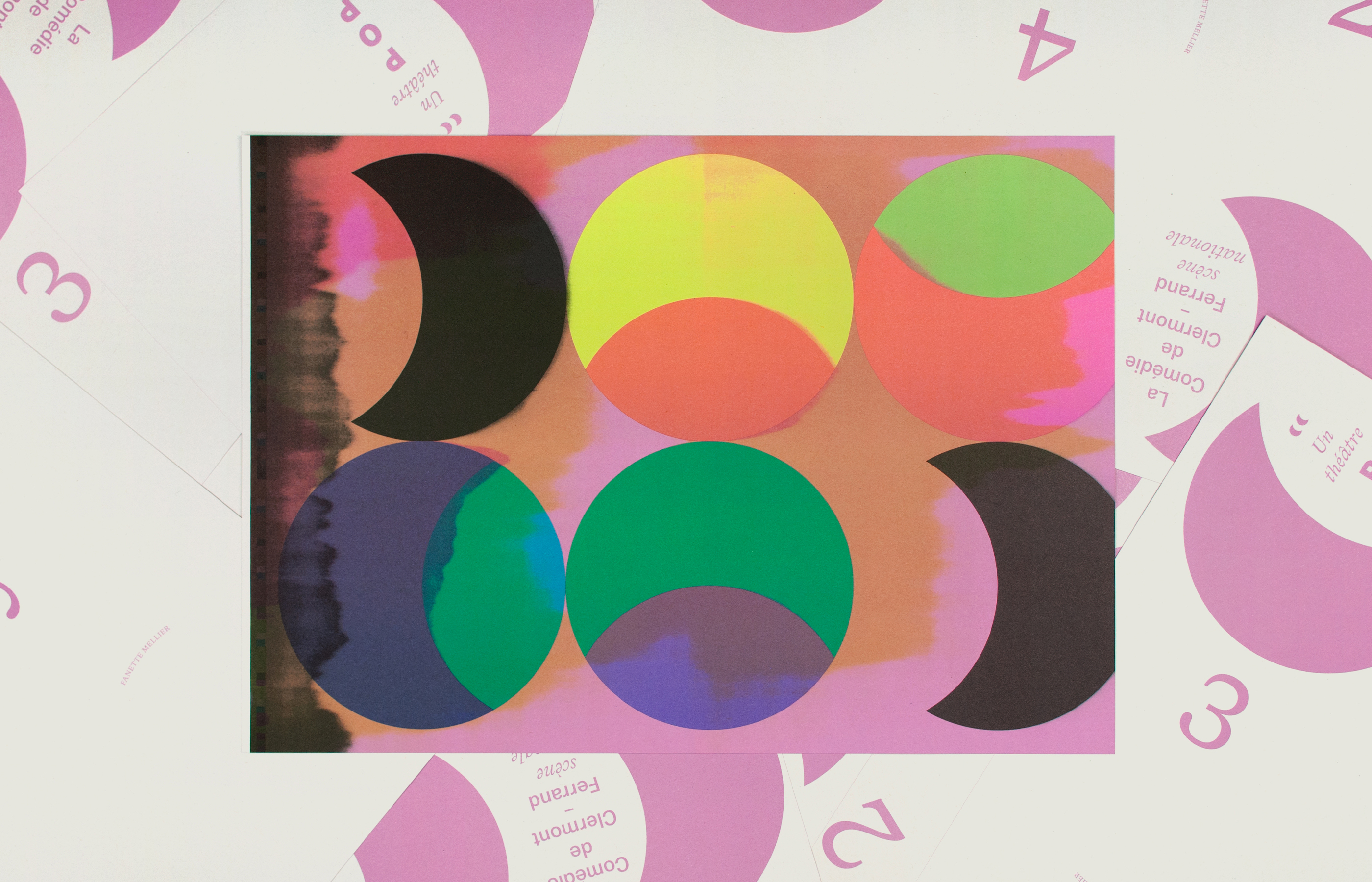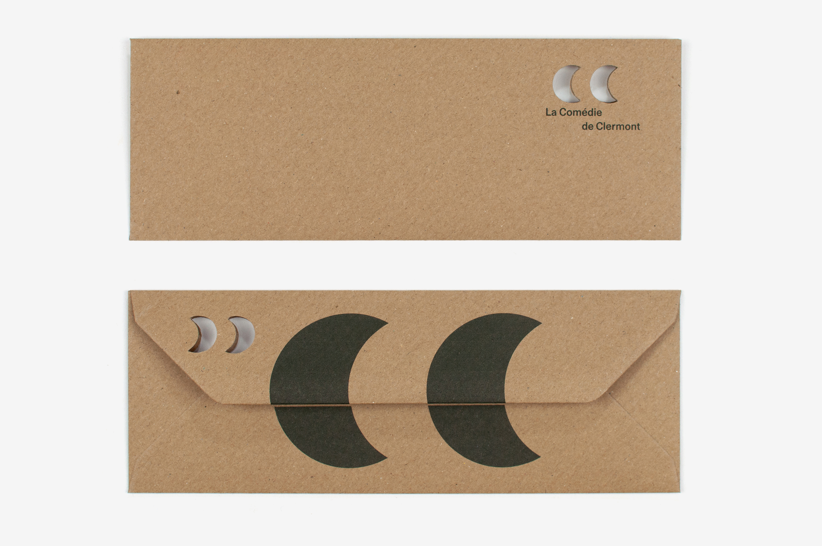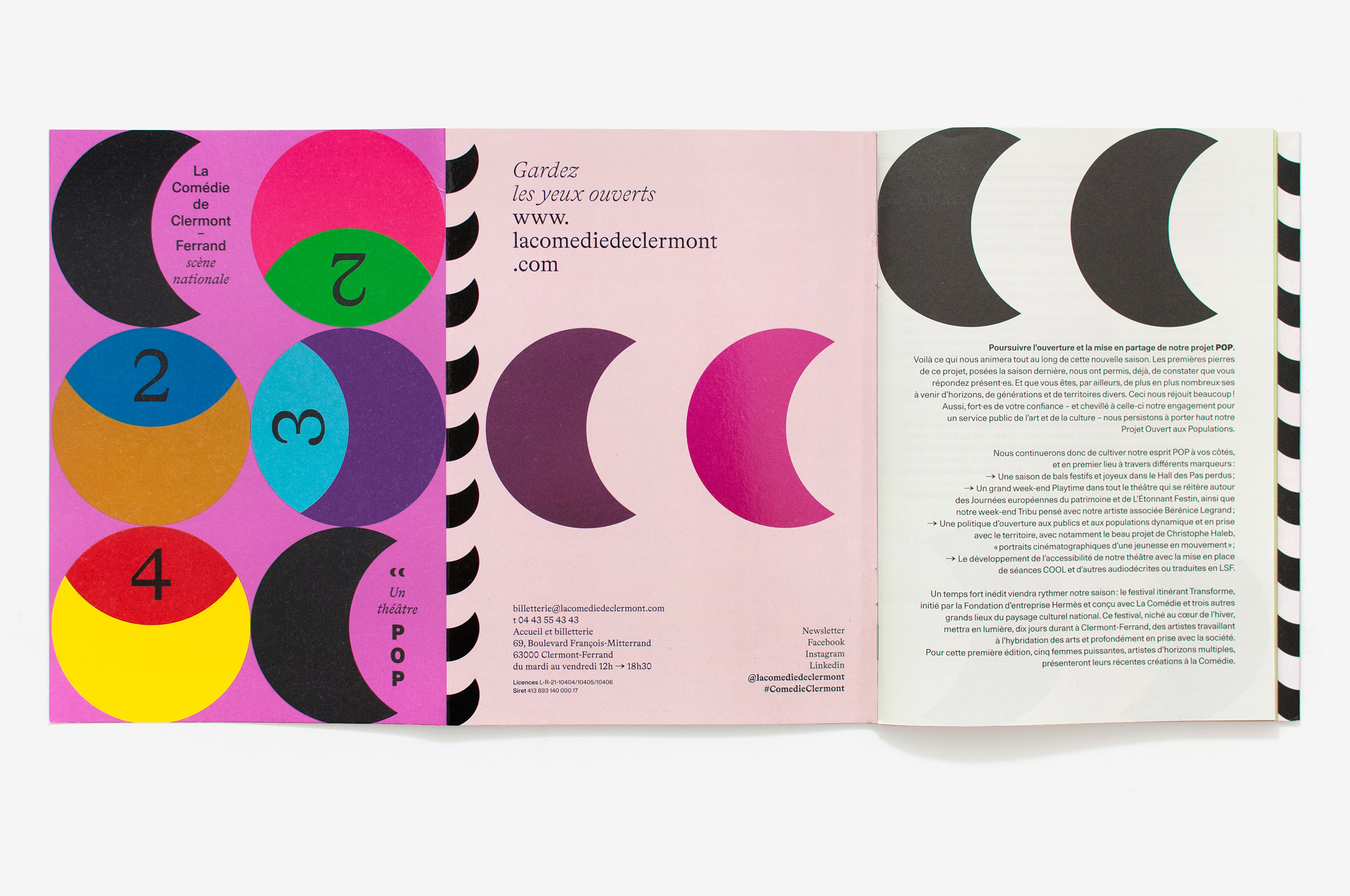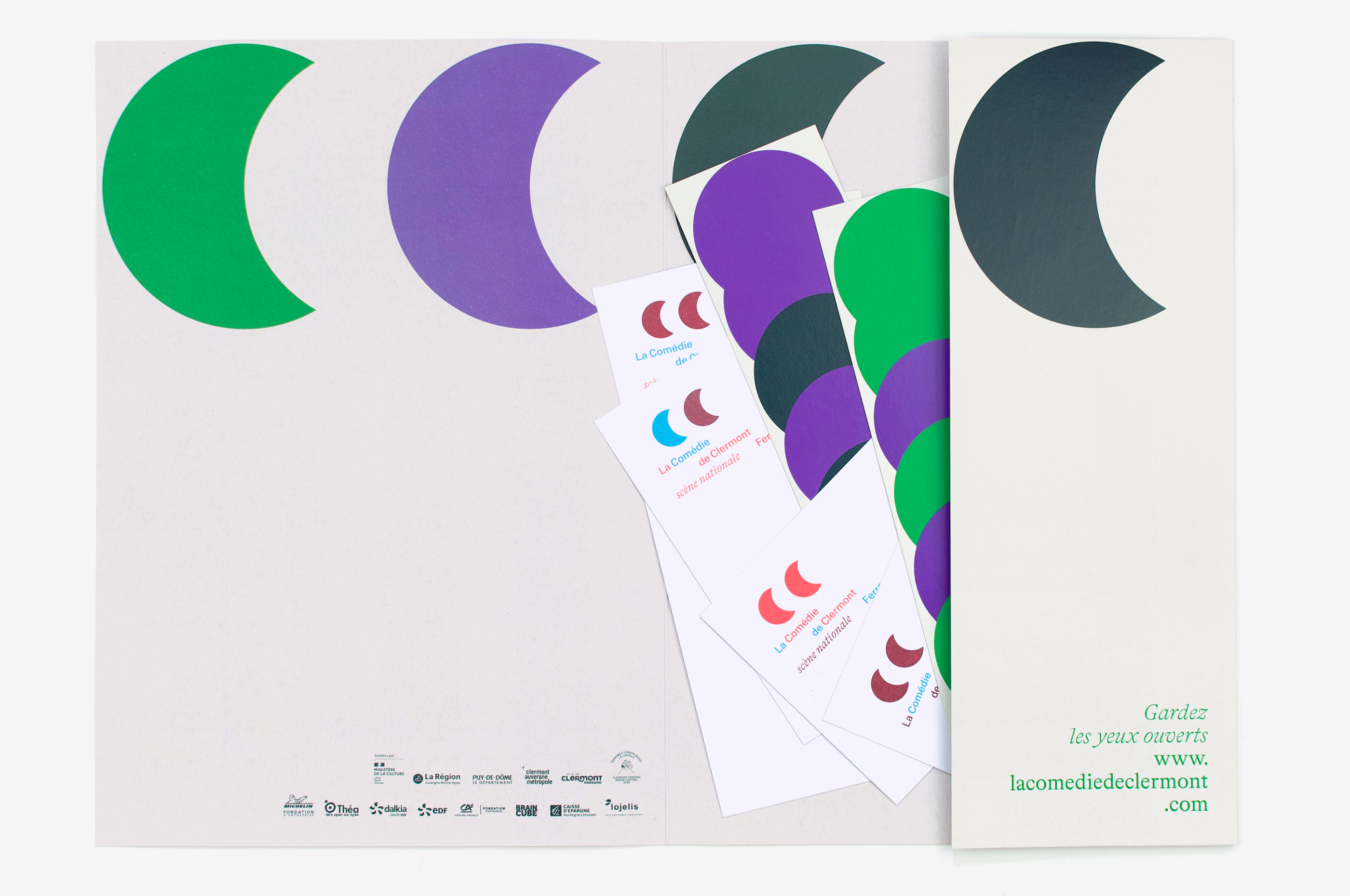 Two Cs, like two open parentheses… The circular shape of the stage, and the oculus in its entrance hall naturally led me to design these two open moons for the Comédie de Clermont’s logo. Their shape and arrangement suggest the idea of a “counterform”: metaphorically, this (inclusive) counterform is represented by the audience. The shape also represents night, eclipse, spotlight, stage and wings: the visible and the non-visible. In its form it evokes the roundness of the word “pop” and the idea of an eye. It moves over time like a caterpillar, drawing a frame, a frieze or a series of objects, according to the needs and the context. It is in this way that the identity of the theatre takes shape from day to day, in a movement that is both linear and protean.