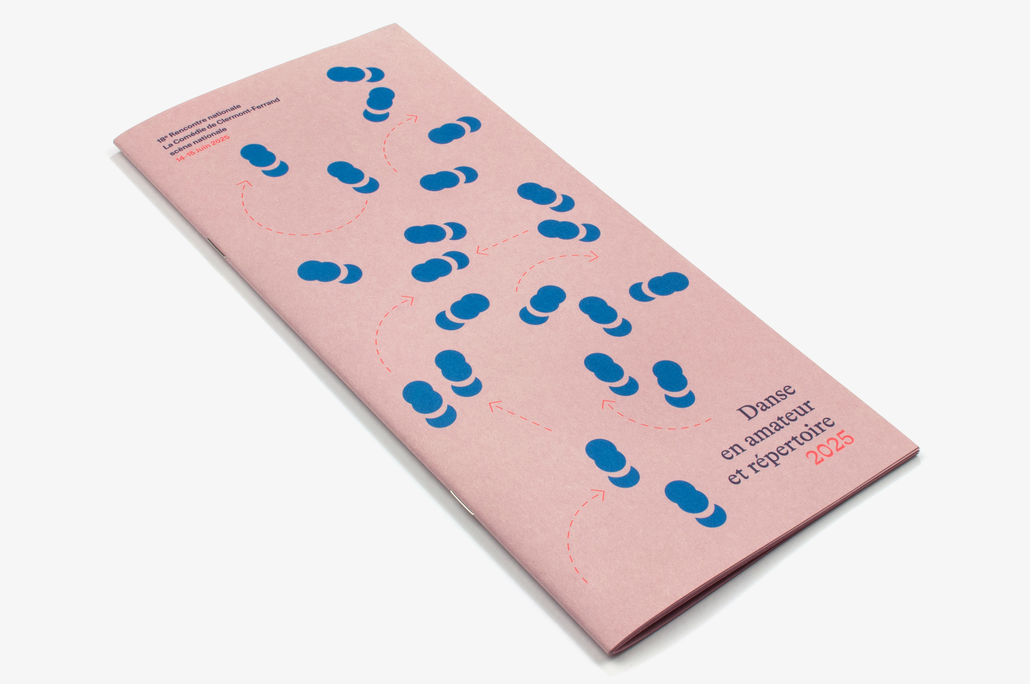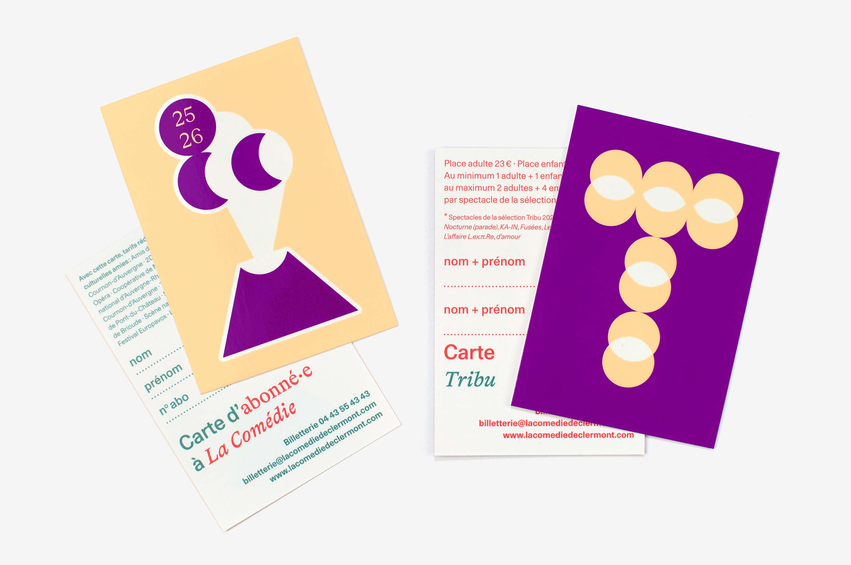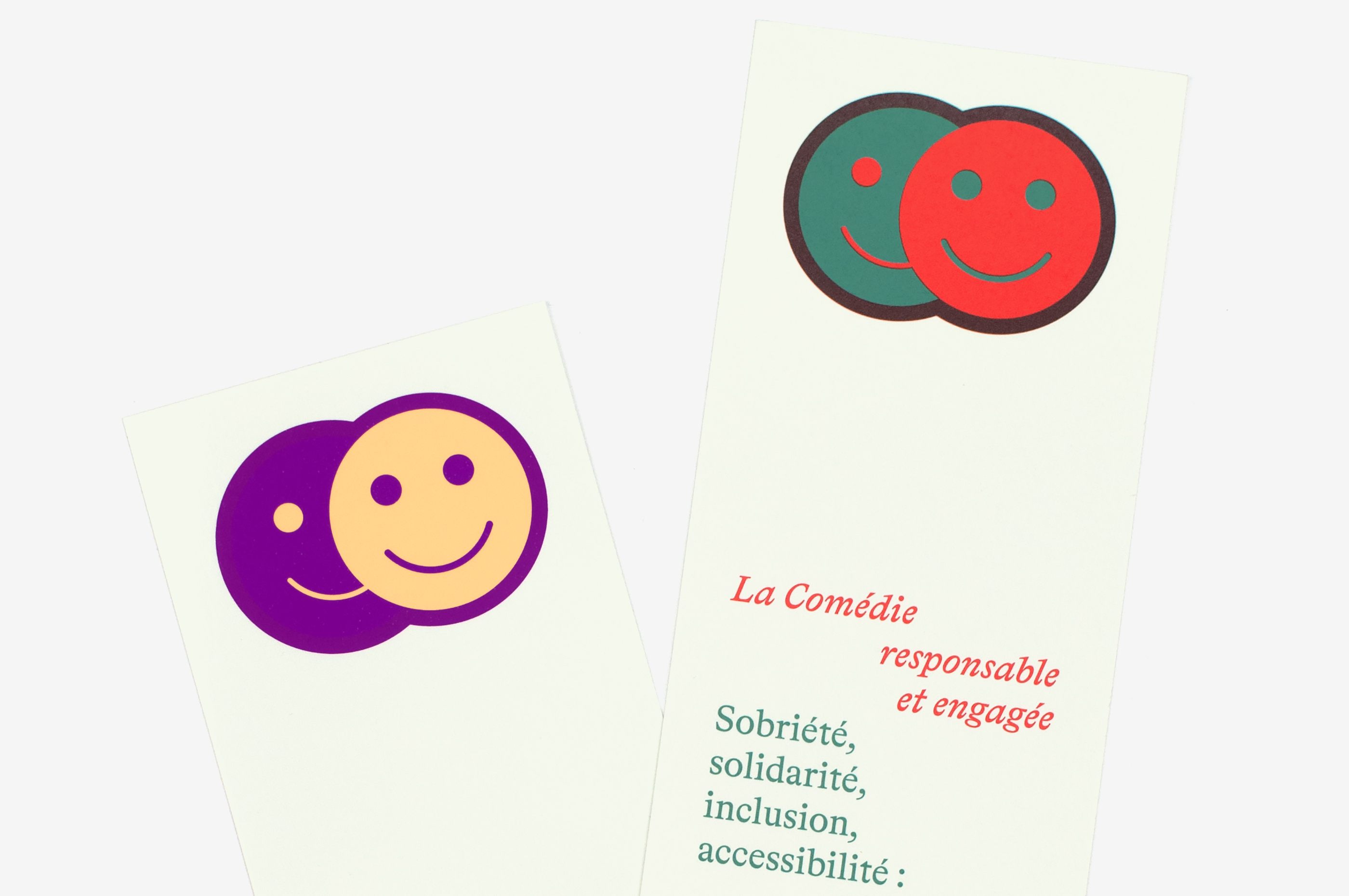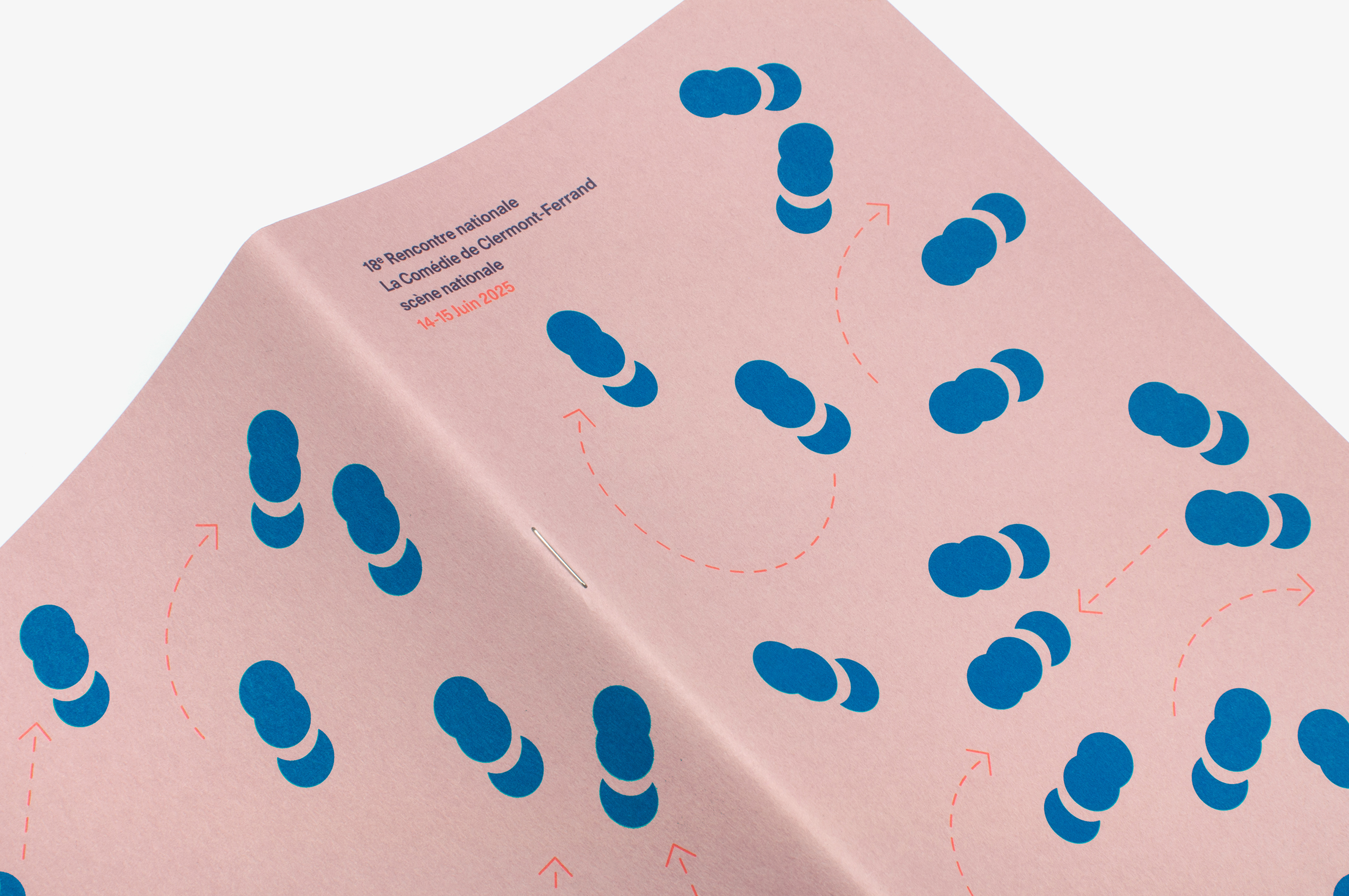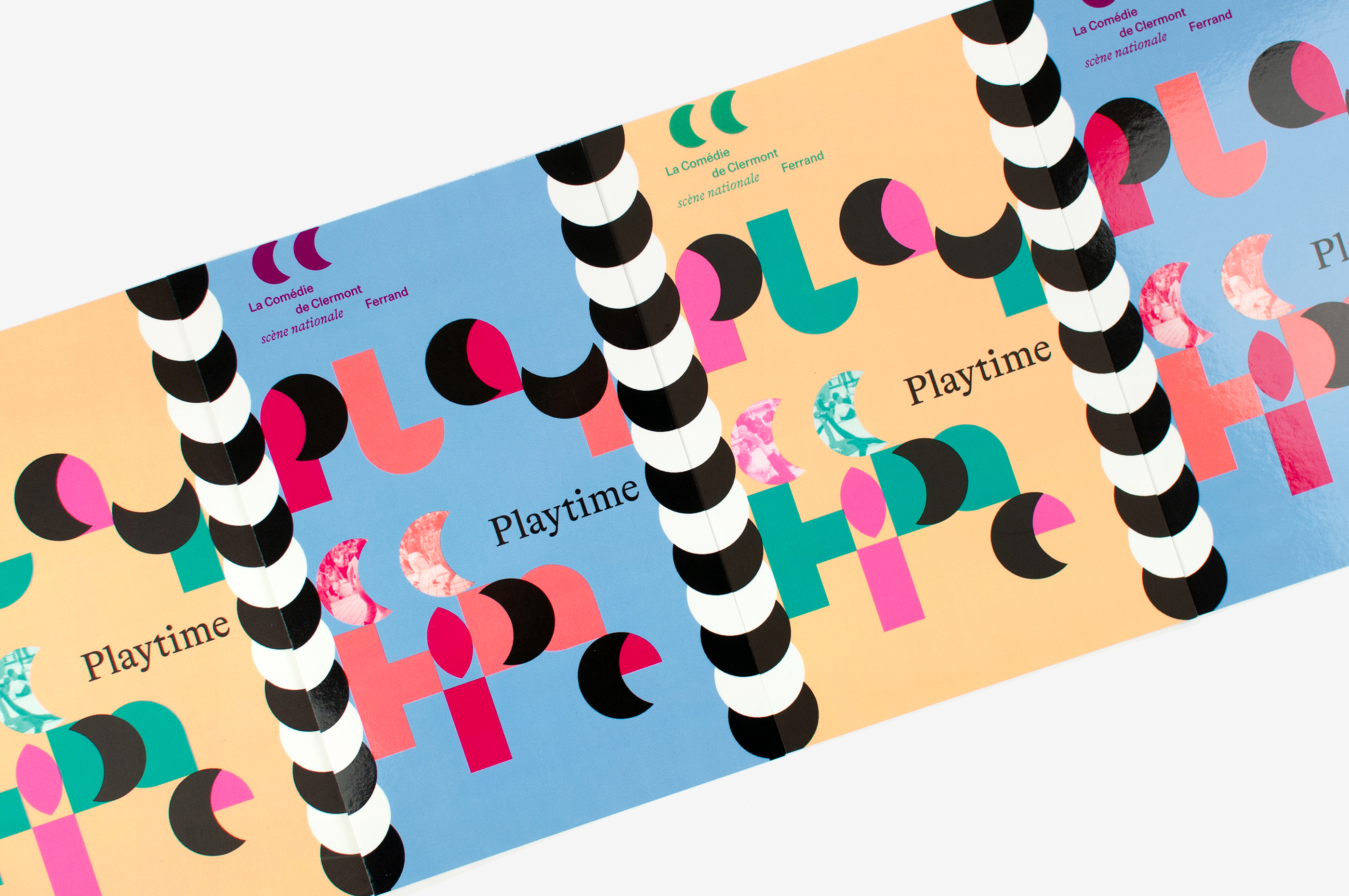 Two Cs, like two open parentheses… The circular shape of the stage, and the oculus in its entrance hall naturally led me to design these two open moons for the Comédie de Clermont’s logo. Their shape and arrangement suggest the idea of a “counterform”: metaphorically, this (inclusive) counterform is represented by the audience. The shape also represents night, eclipse, spotlight, stage and wings: the visible and the non-visible. In its form it evokes the roundness of the word “pop” and the idea of an eye. It moves over time like a caterpillar, drawing a frame, a frieze or a series of objects, according to the needs and the context. It is in this way that the identity of the theatre takes shape from day to day, in a movement that is both linear and protean.
