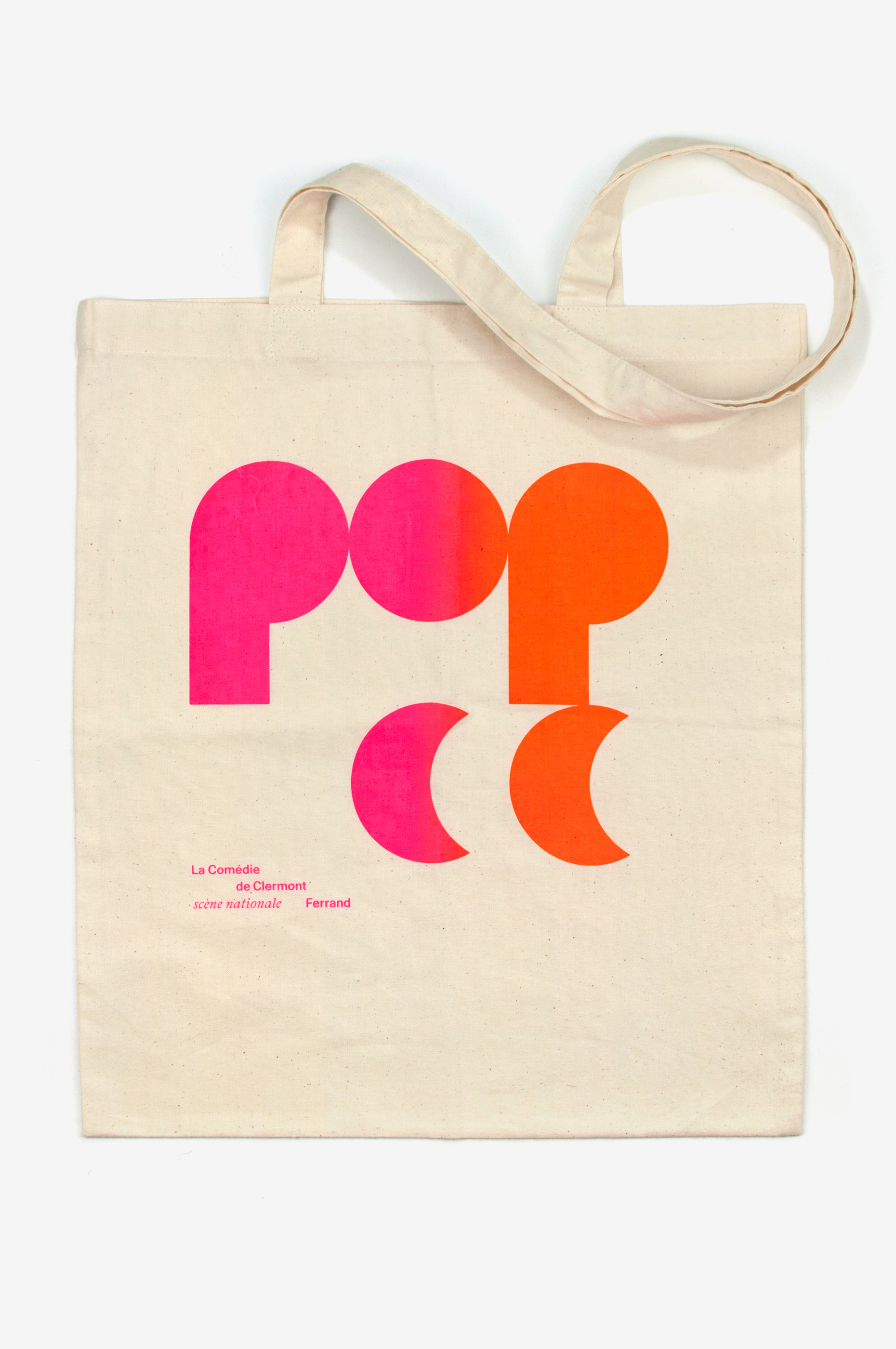 Two Cs, like two open parentheses… The circular shape of the stage, and the oculus in its entrance hall naturally led me to design these two open moons for the Comédie de Clermont’s logo. Their shape and arrangement suggest the idea of a “counterform”: metaphorically, this (inclusive) counterform is represented by the audience. The shape also represents night, eclipse, spotlight, stage and wings: the visible and the non-visible. In its form it evokes the roundness of the word “pop” and the idea of an eye. It moves over time like a caterpillar, drawing a frame, a frieze or a series of objects, according to the needs and the context. It is in this way that the identity of the theatre takes shape from day to day, in a movement that is both linear and protean.