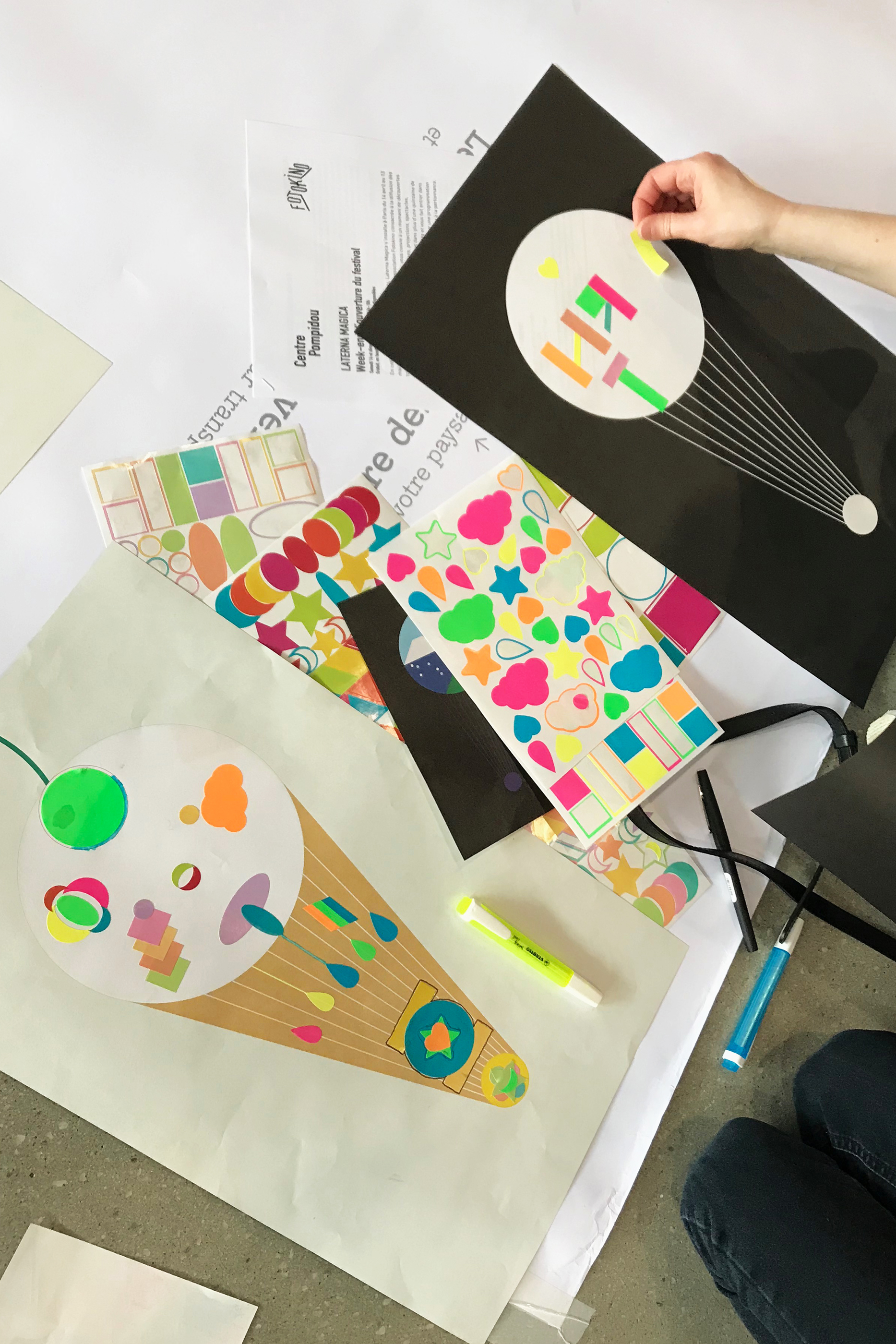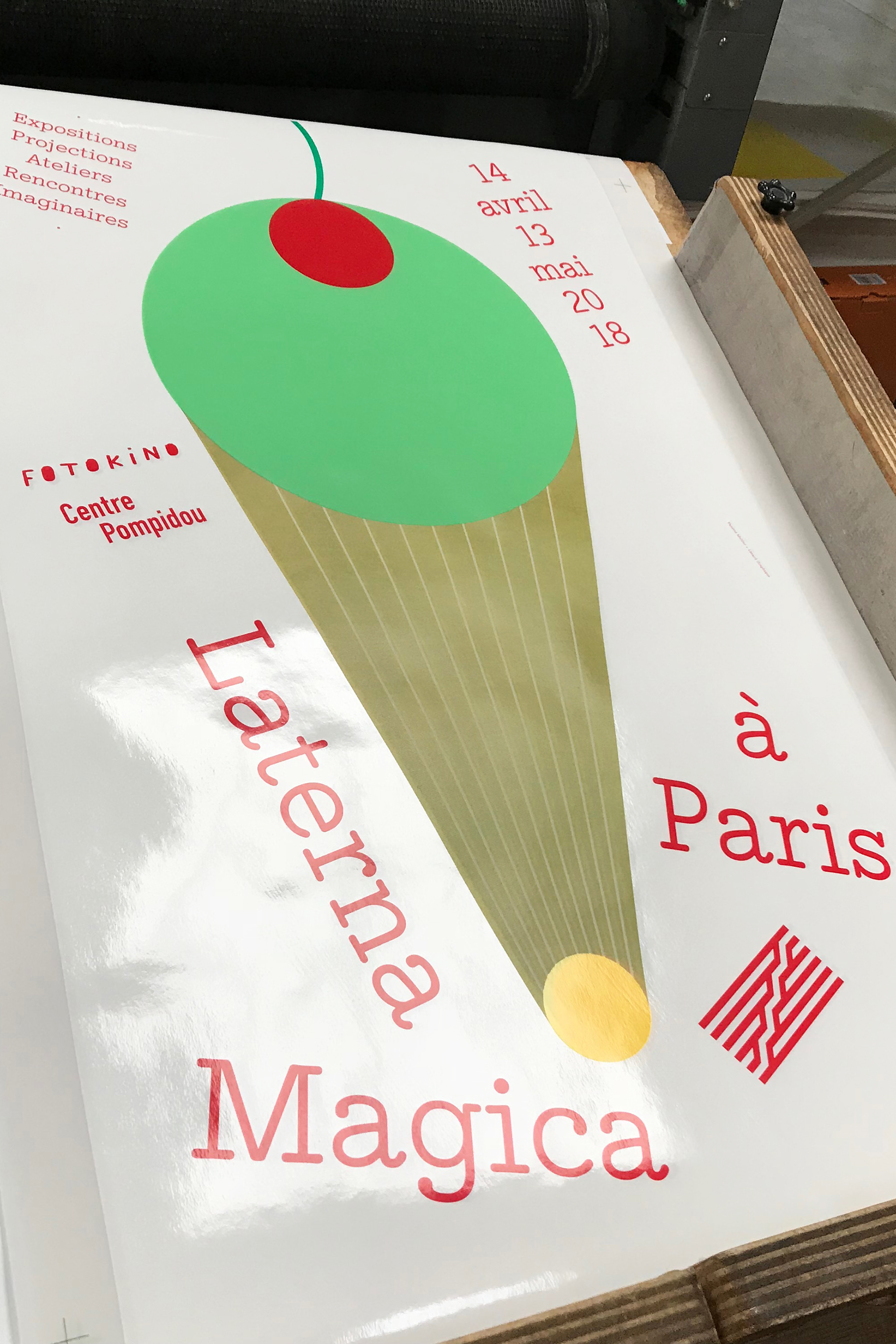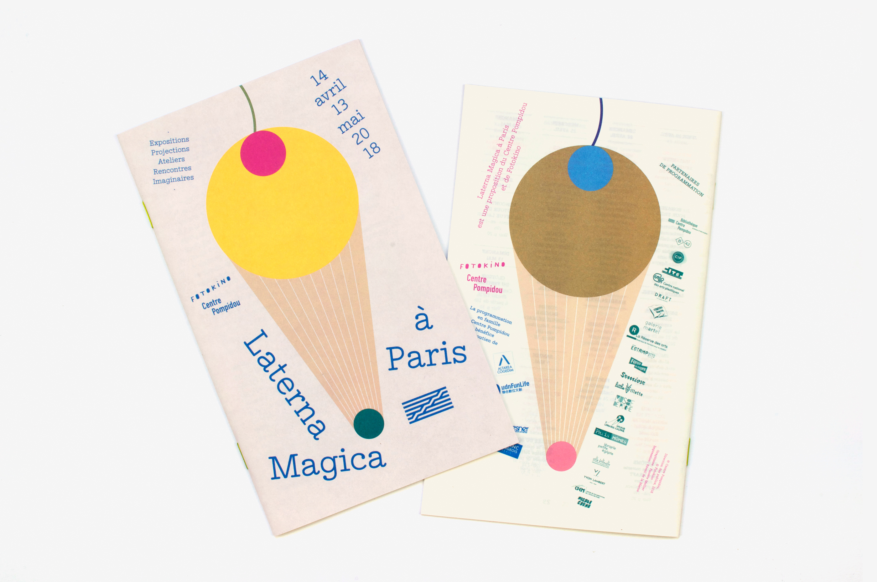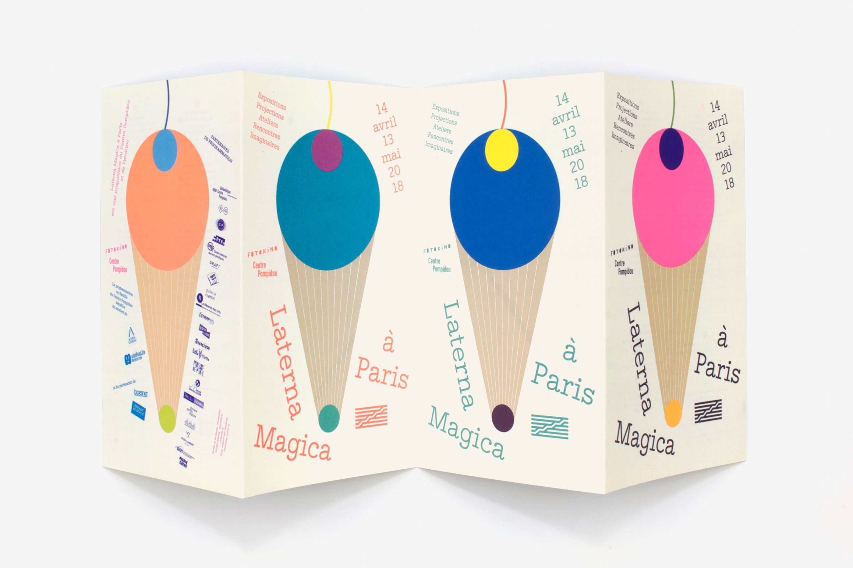Les outils de communication de l’édition parisienne du festival pour le jeune public Laterna Magica ont été pensés comme une version contemporaine de la lanterne magique. Une forme, à mi-chemin entre glace, faisceau lumineux et montgolfière, est devenue l’emblème du festival pour cette édition. Les nombreuses couleurs de faisceaux, telles un éventail de parfums de glaces, faisaient varier, en transparence, les différents paysages au verso des objets imprimés. L’installation des affiches sur la façade vitrée du Centre Pompidou et la distribution des flyers aux jeunes visiteurs ont permis de déployer ces jeux de transparence lumineuse tout au long du festival.