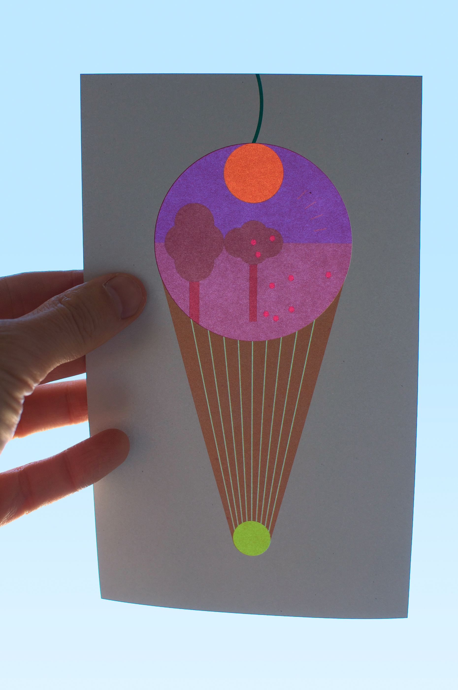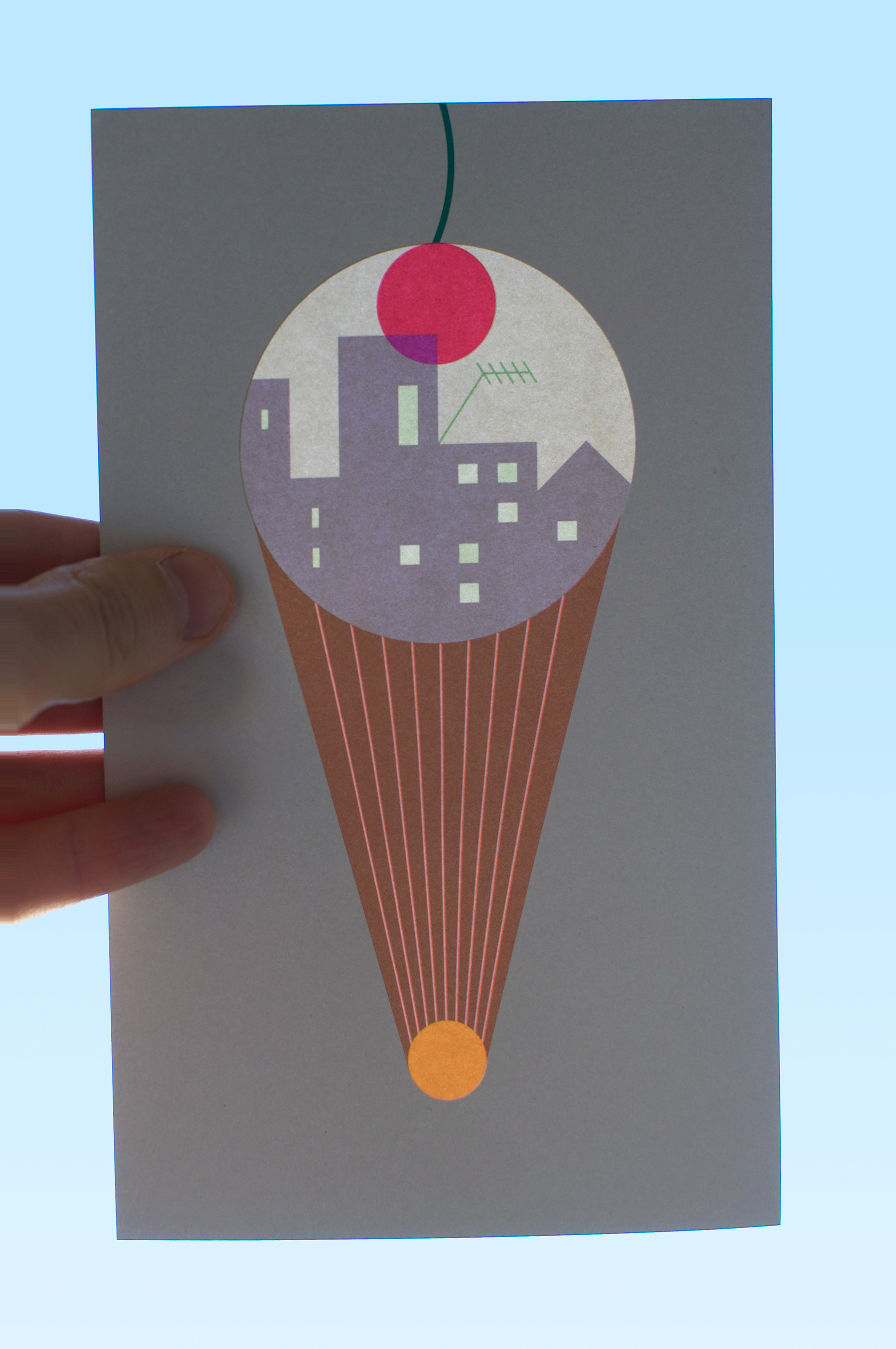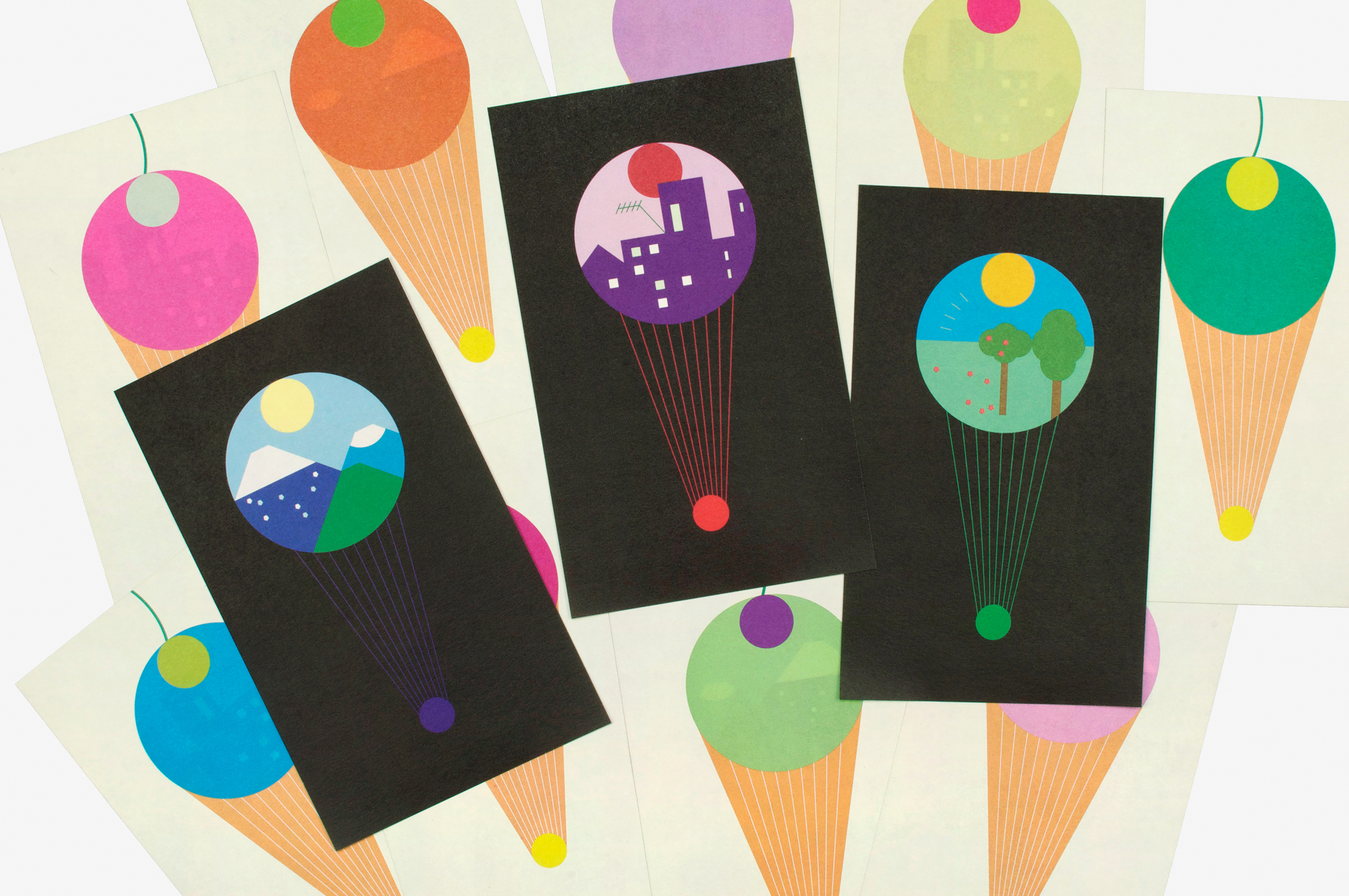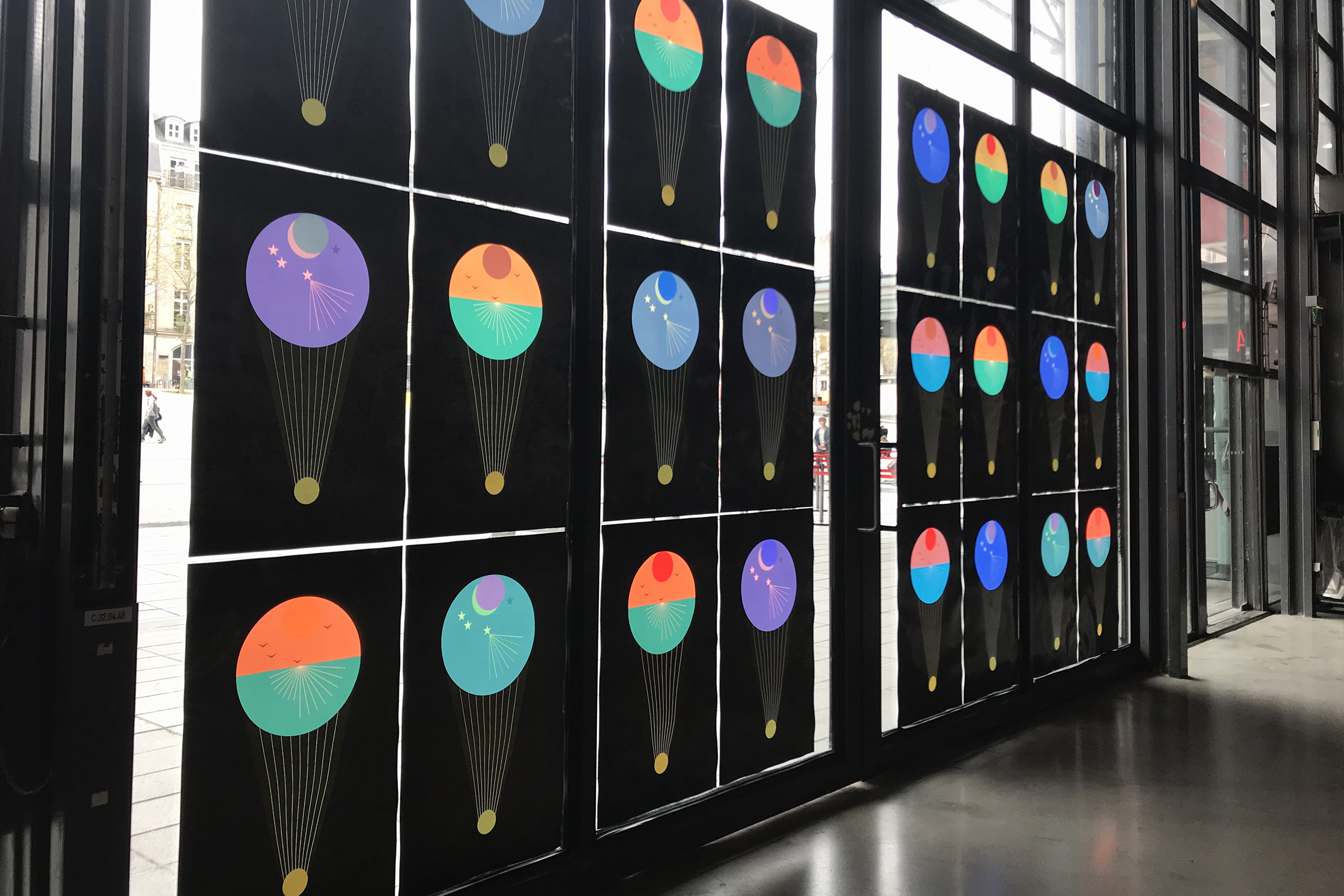 The communication tools for the Laterna Magica festival in Paris – aimed at a younger audience – were conceived as a contemporary version of the magic lantern. The emblem of the 2018 festival was a form resembling perhaps an ice cream cone, a flaming torch, or a hot air balloon. The array of colours, like a menu of ice cream flavours, when made transparent, had the effect of varying the different landscapes on the reverse side of the printed objects. These effects of luminous transparency could be enjoyed throughout the duration of the festival thanks to the installation of posters on the glass façade of the Pompidou Centre and the distribution of flyers to the young visitors.