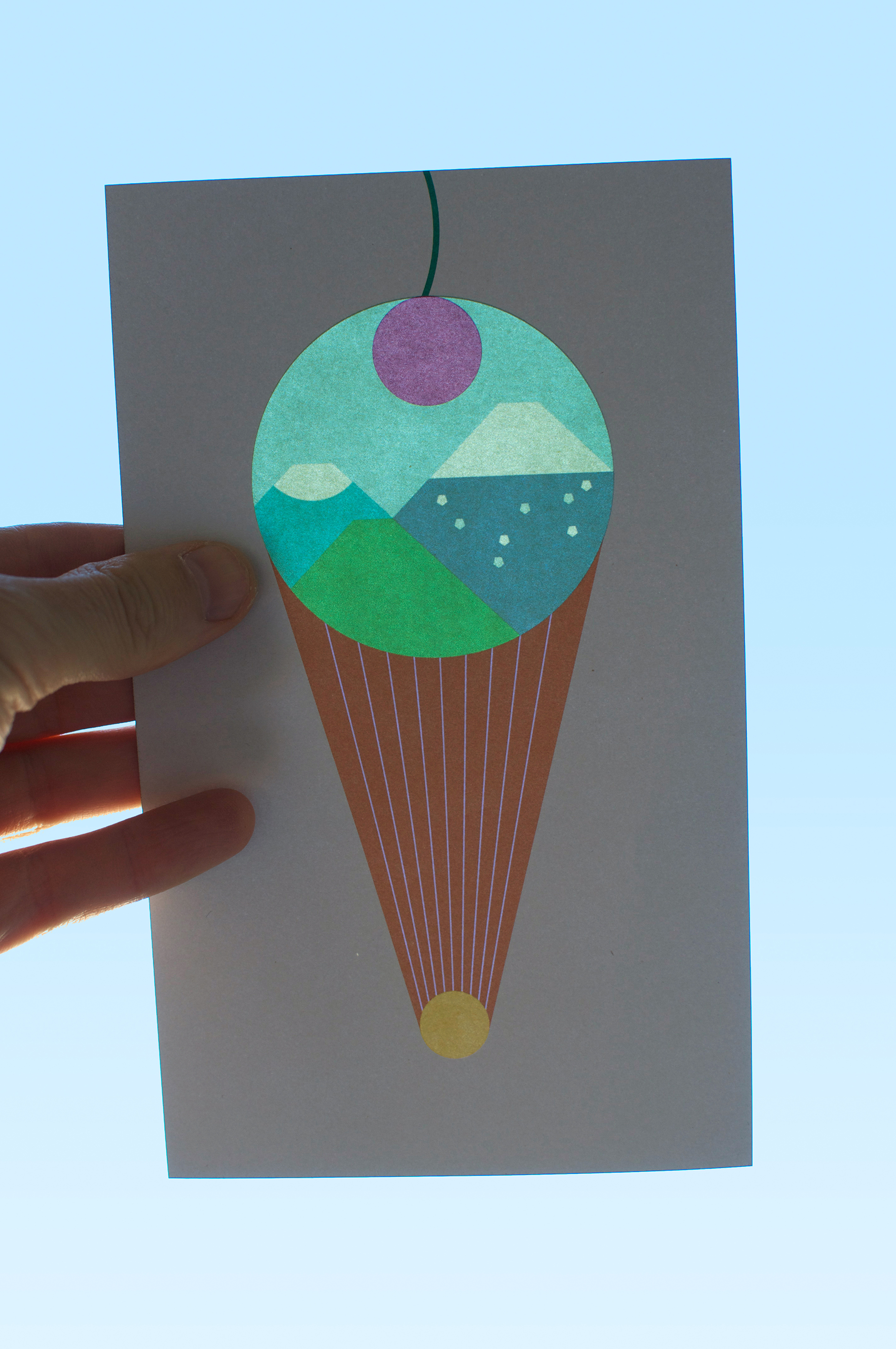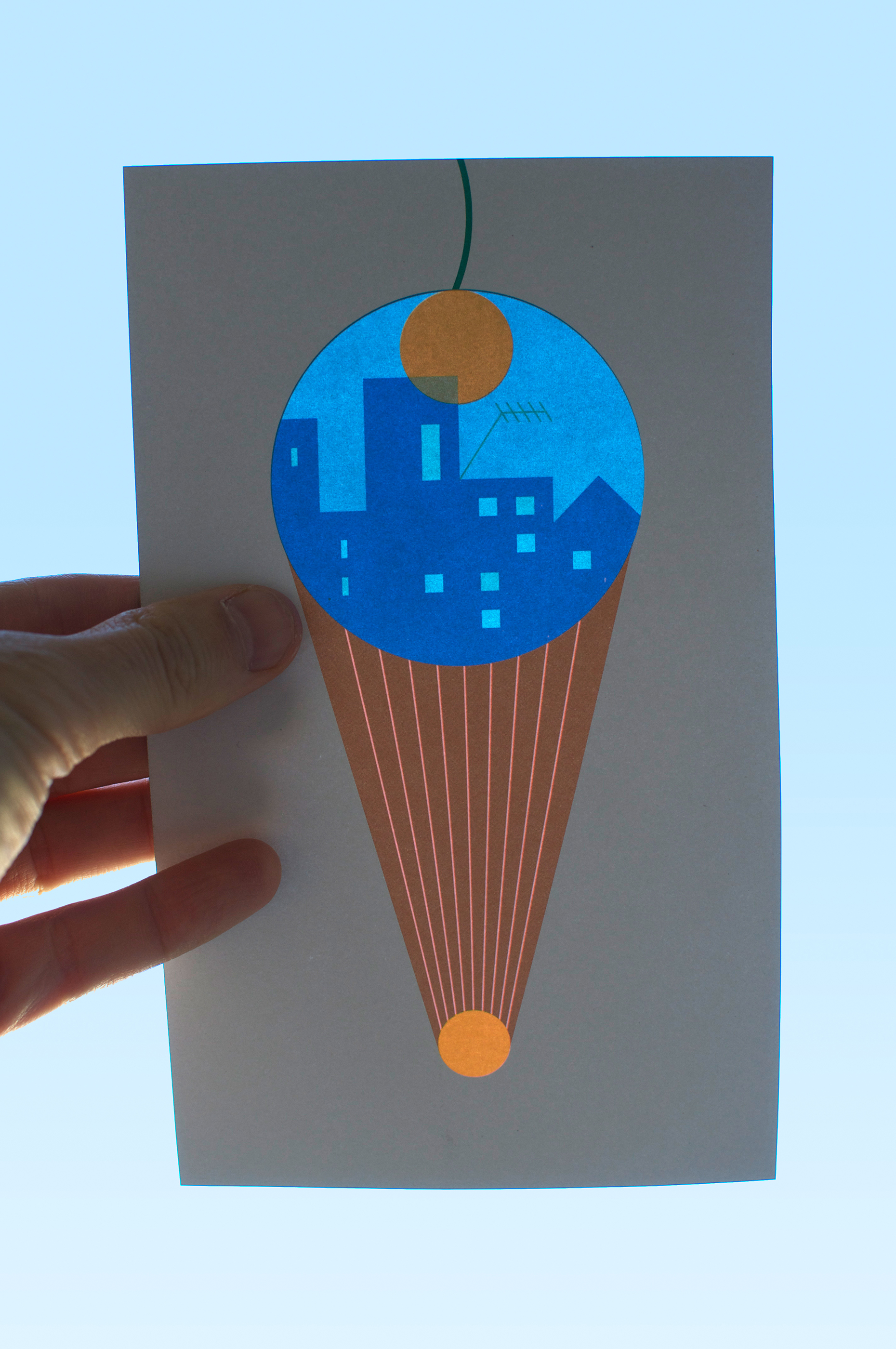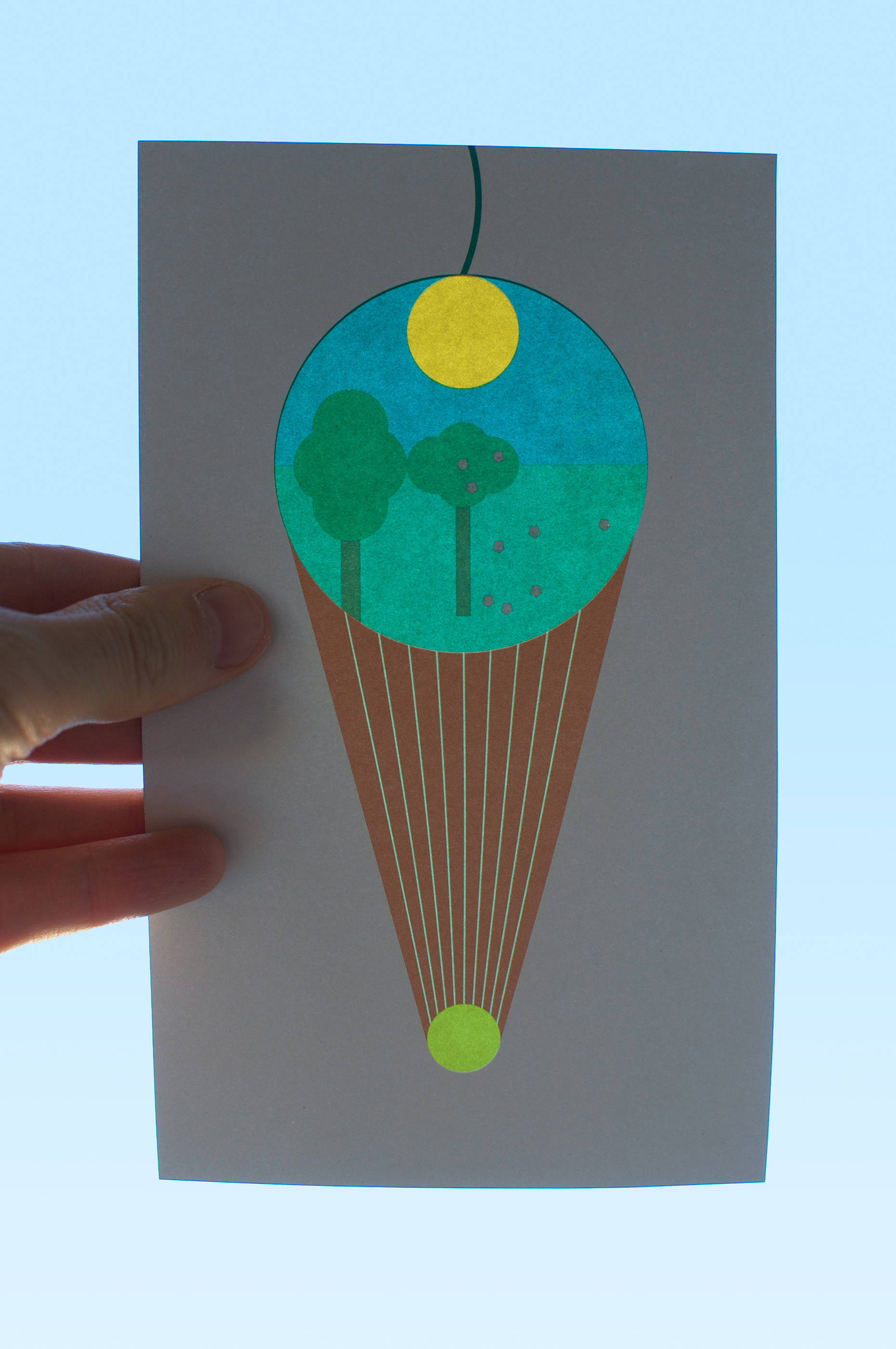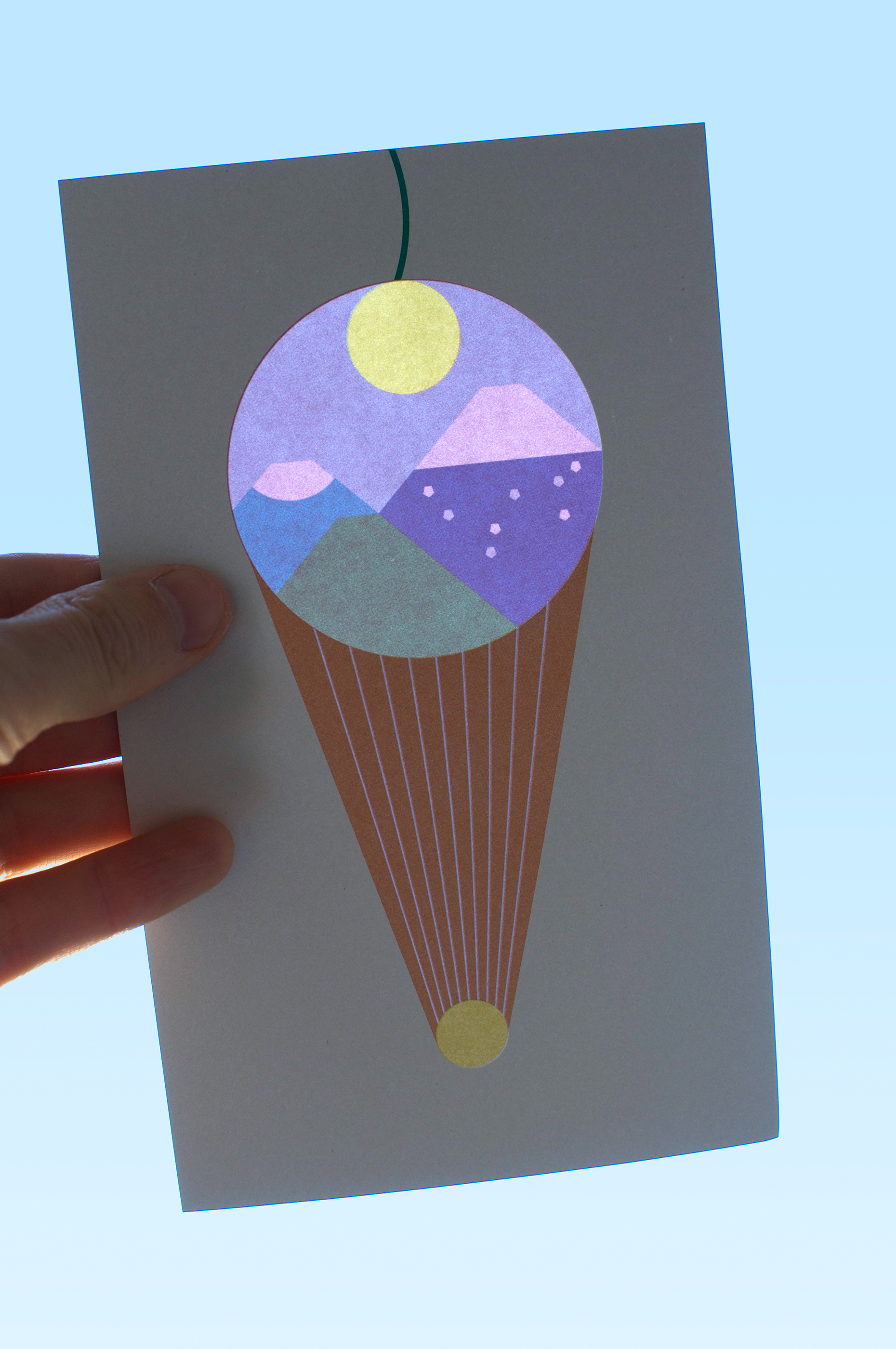 The communication tools for the Laterna Magica festival in Paris – aimed at a younger audience – were conceived as a contemporary version of the magic lantern. The emblem of the 2018 festival was a form resembling perhaps an ice cream cone, a flaming torch, or a hot air balloon. The array of colours, like a menu of ice cream flavours, when made transparent, had the effect of varying the different landscapes on the reverse side of the printed objects. These effects of luminous transparency could be enjoyed throughout the duration of the festival thanks to the installation of posters on the glass façade of the Pompidou Centre and the distribution of flyers to the young visitors.