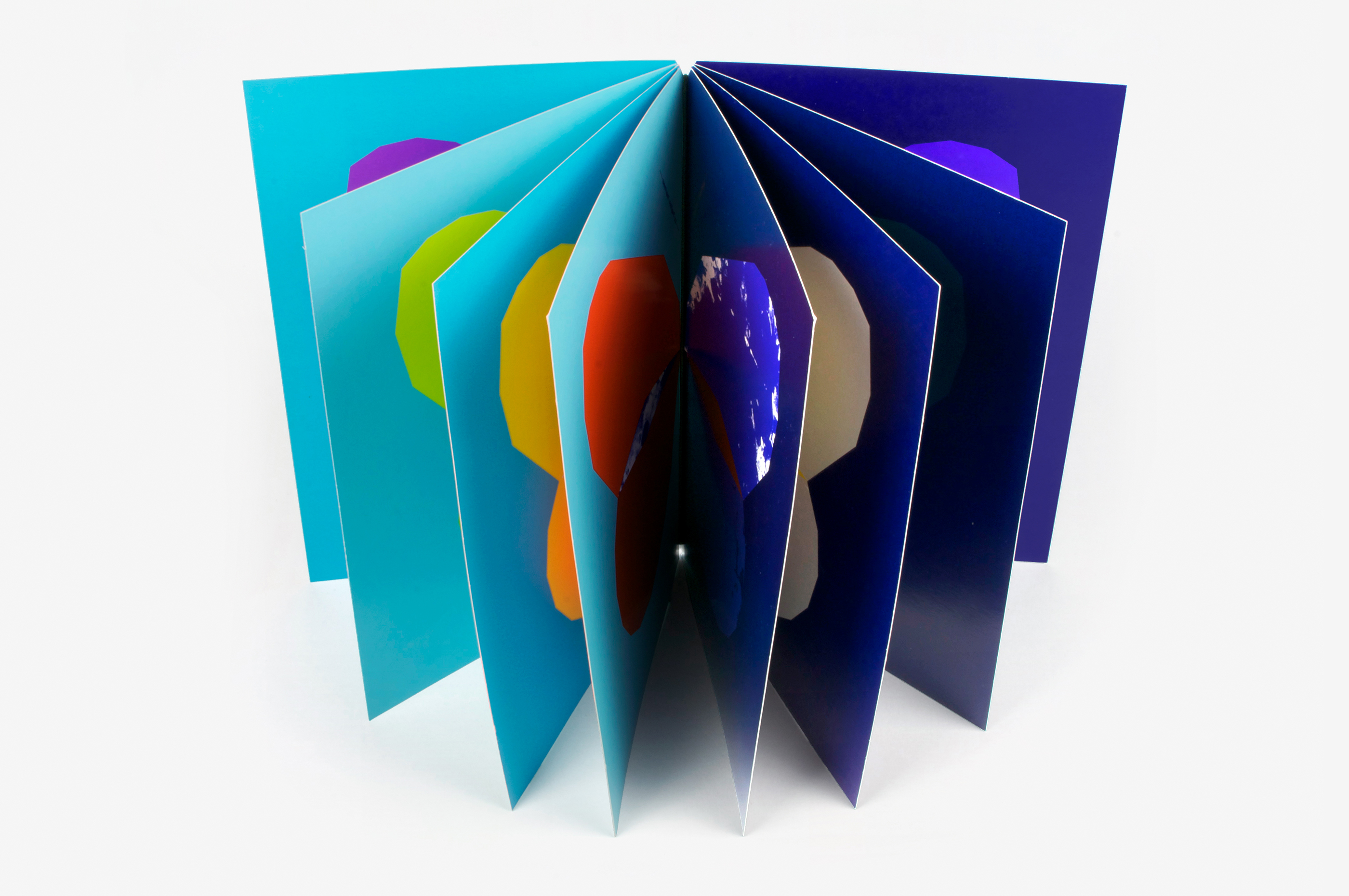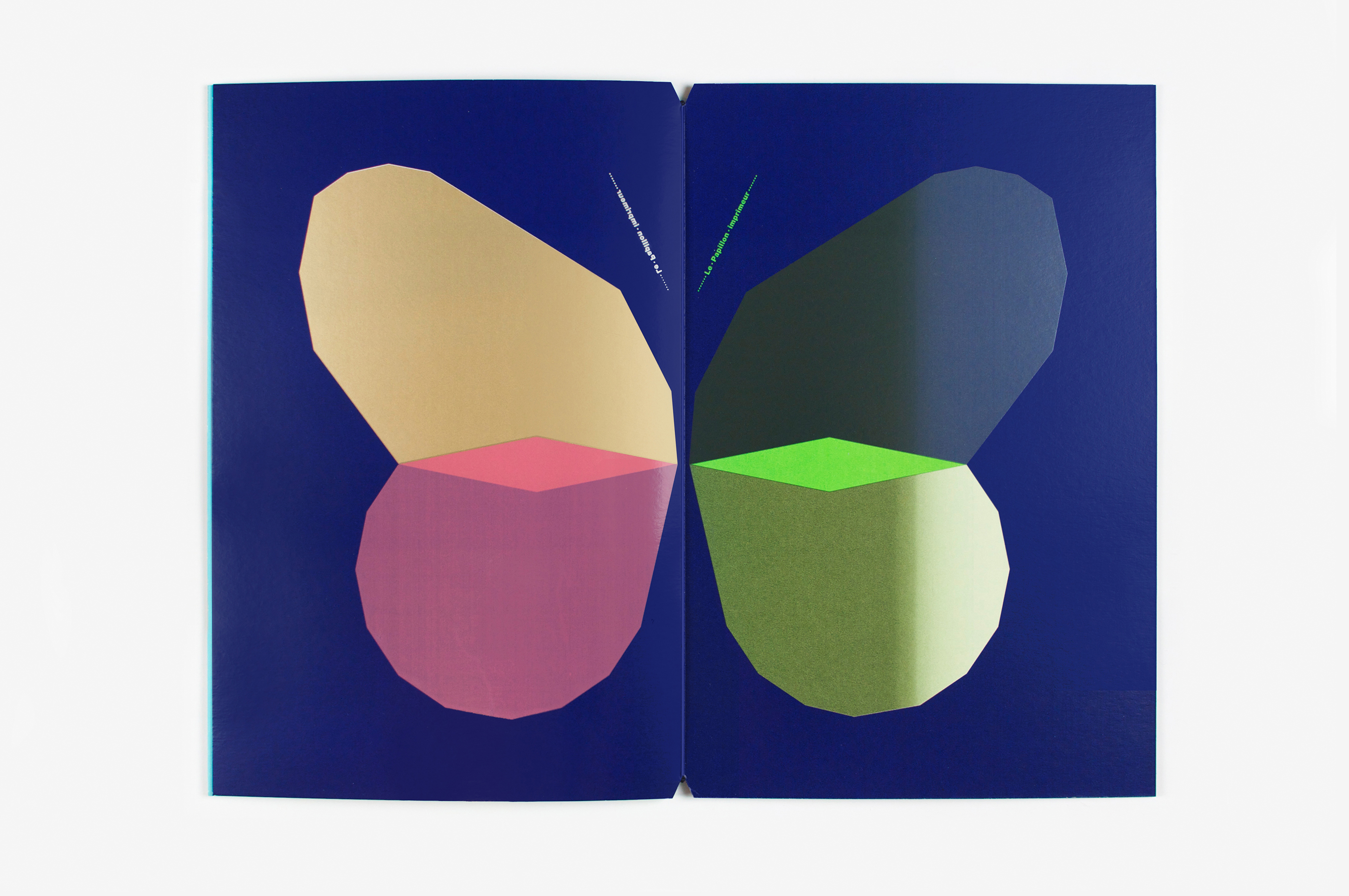 This book is intended as a published continuation of Papillons, the series of posters inspired by moths and butterflies produced for the exhibition Un Imprimeur in Le Havre. Printed using a variety of different techniques (silk screen, offset, hot gilding), the detachable pages can be freely arranged like a color chart to create new combinations of colored wings. Variations occurring in the printing process make each book unique. The book can be stood on end, the central fold separating the day (butterflies) section from the phosphorescent night (moths) section. The book’s title is used to represent the insects’ antennae and appears on every page like a mantra, the repetition and symmetry underlining the fluidity of the printing. The book is dedicated to my mother Manu who taught me to love beautiful printing and who regularly sends me (real) butterflies!