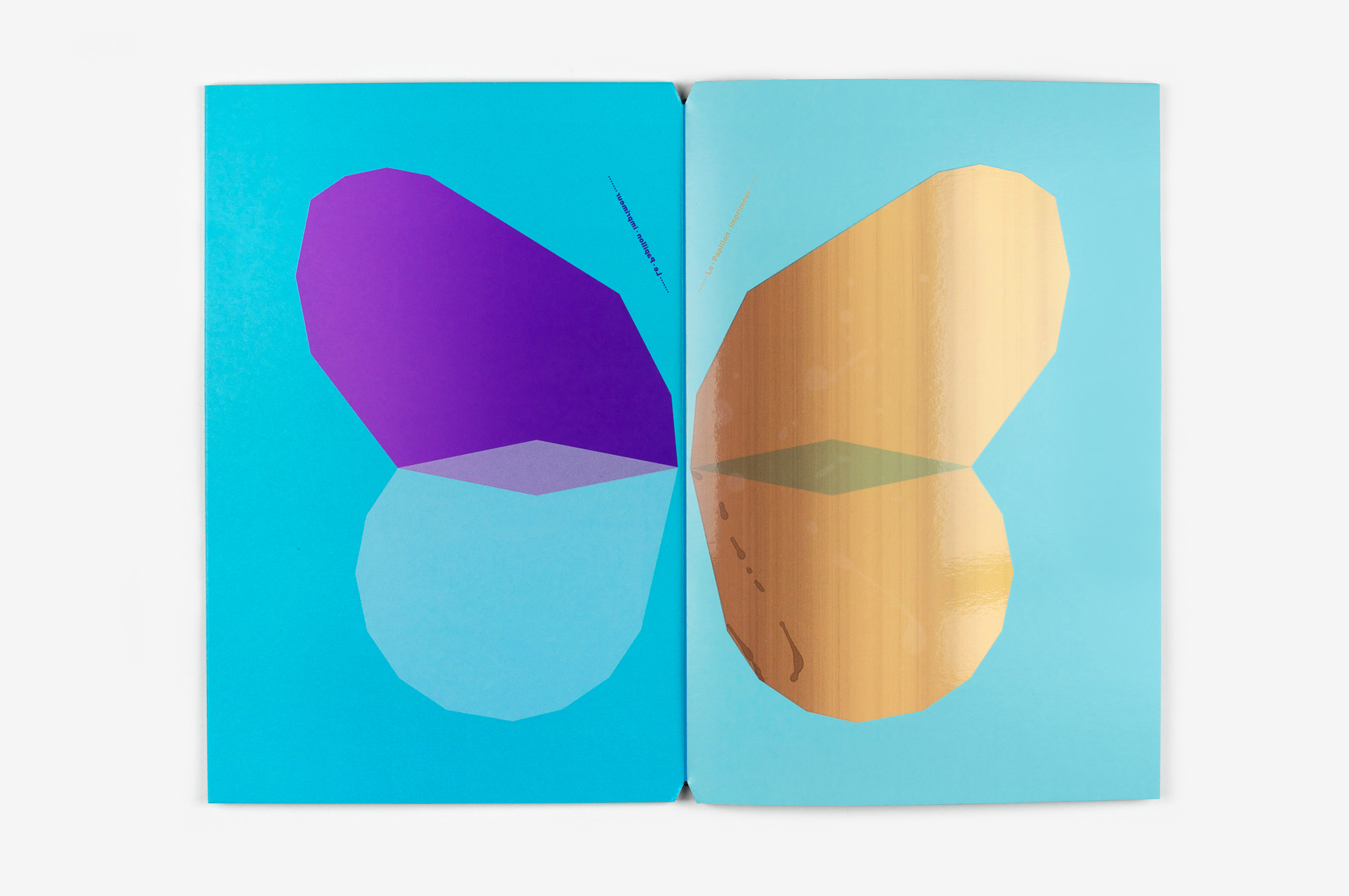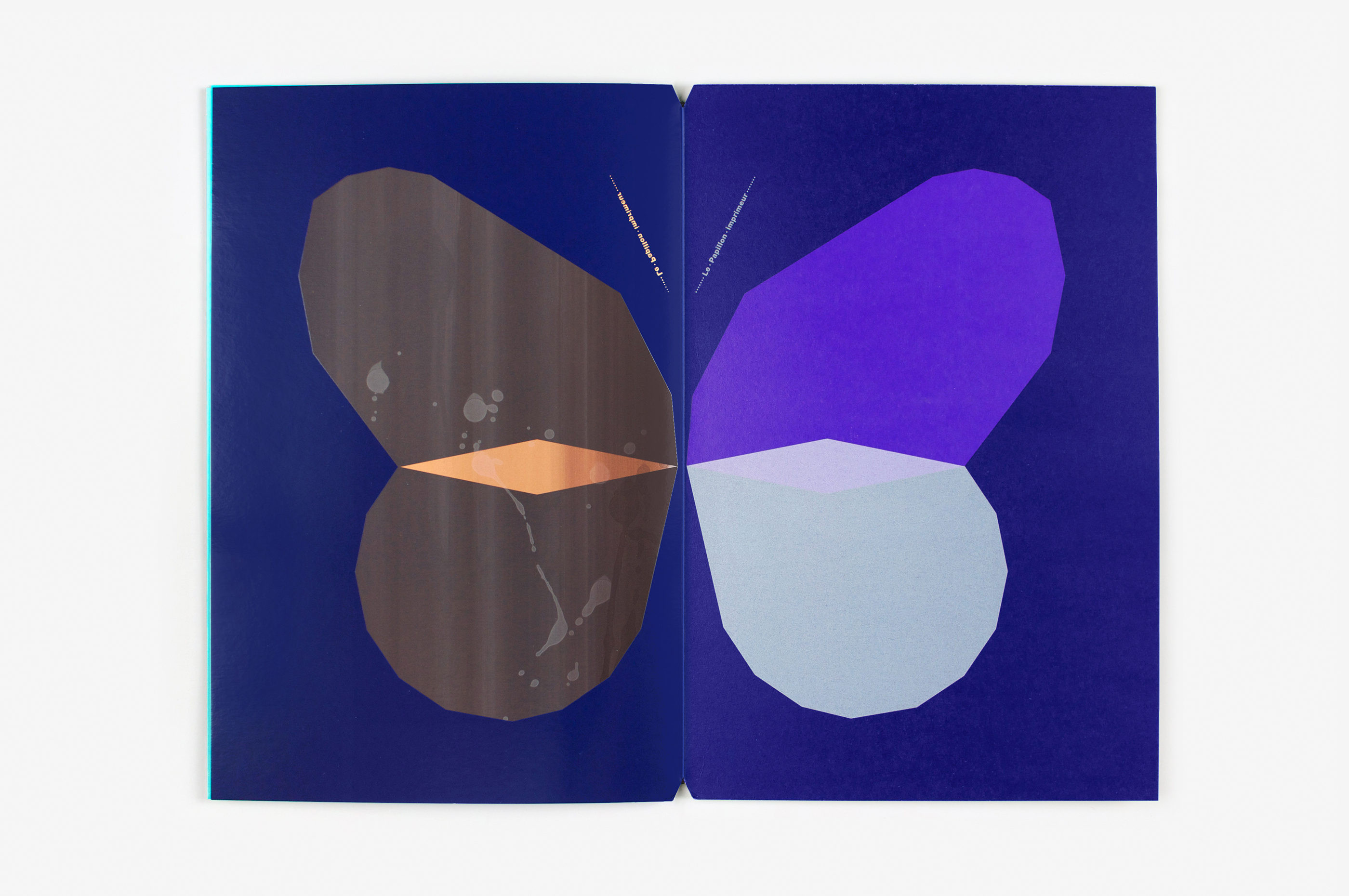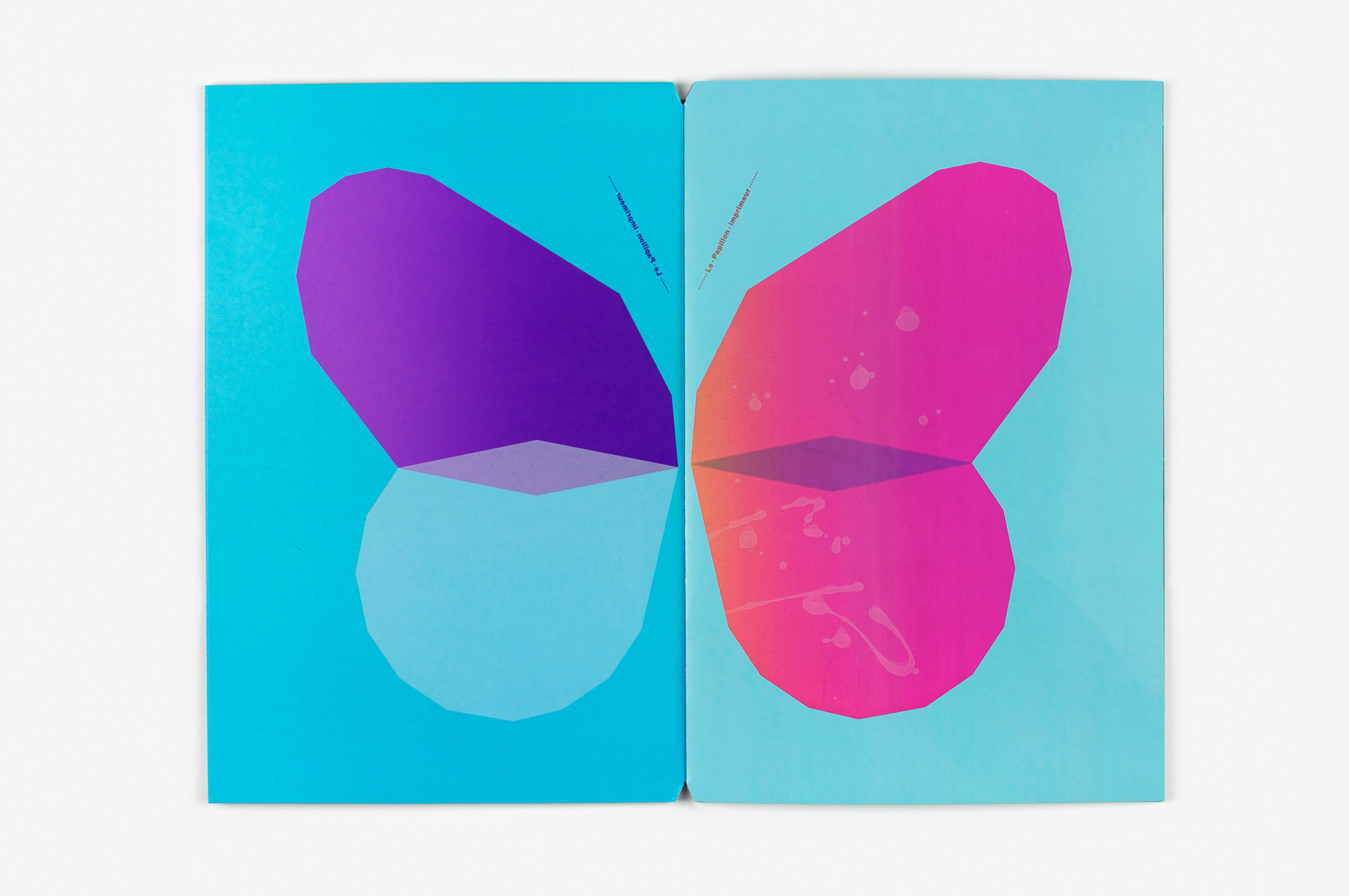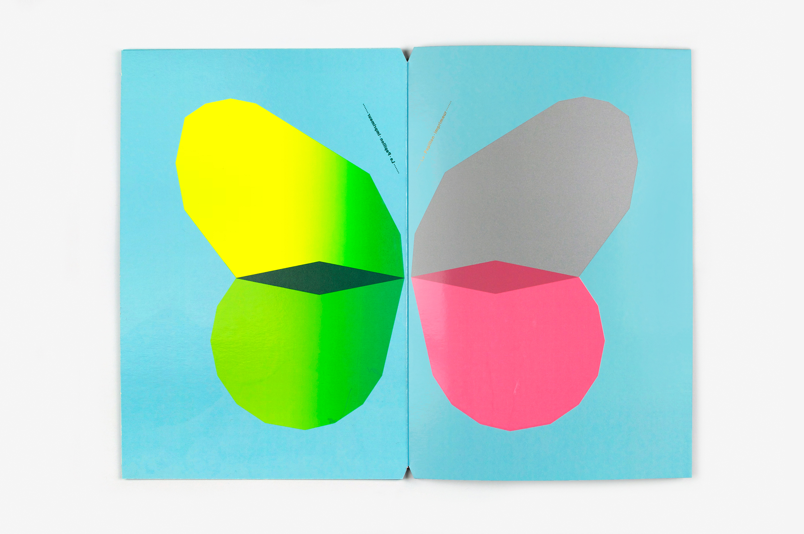 Ce livre a été imaginé comme un prolongement éditorial des affiches Papillons (jour et nuit) conçues suite à l’exposition Un Imprimeur au Havre. Les pages du livre, imprimées dans différentes techniques (sérigraphie, offset, dorure à chaud), peuvent être assemblées librement pour créer de nouvelles combinaisons d’ailes colorées, à la manière d’un nuancier. Les aléas provoqués au cours de l’impression rendent chaque livre unique. Le livre tient debout, la partie jour et la partie nuit (phosphorescente) étant réparties de part et d’autre du pli central. Le titre, qui figure les antennes, est imprimé sur chaque page, comme un mantra dont la répétition et la symétrie renvoient au mouvement d’impression. Le livre est dédicacé à ma maman Manu qui m’a légué le goût des belles pages et m’envoie régulièrement des (vrais) papillons!