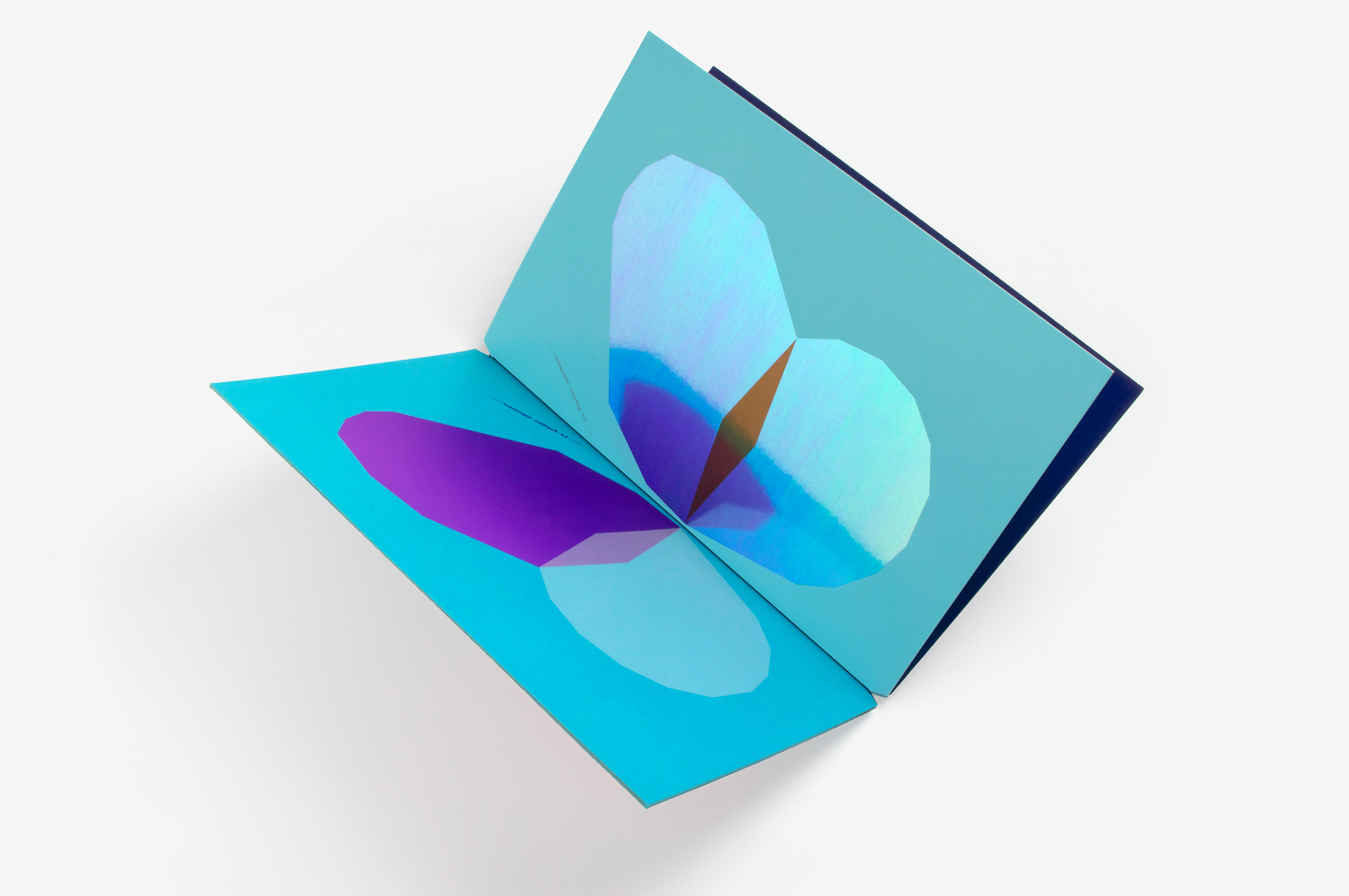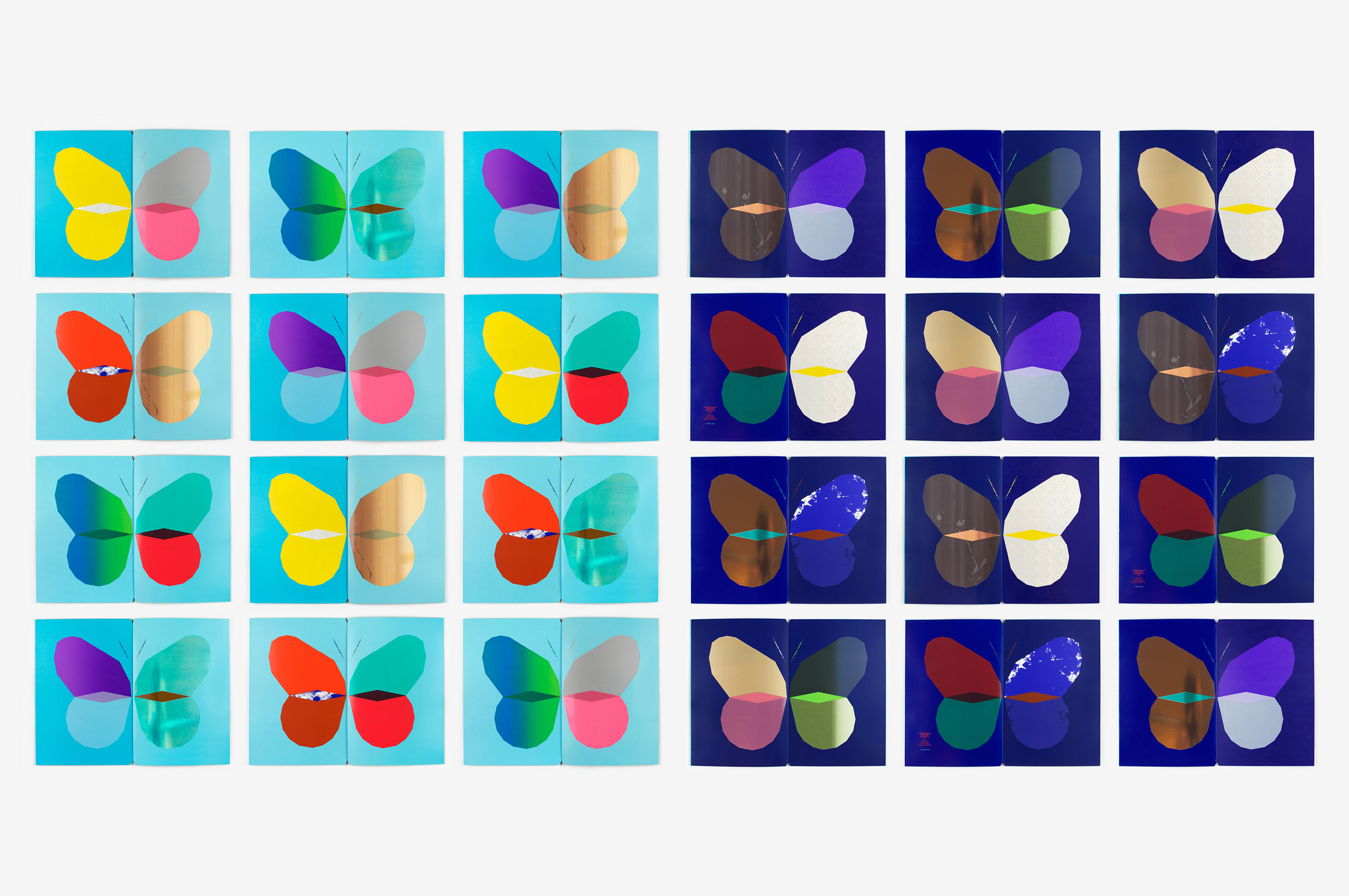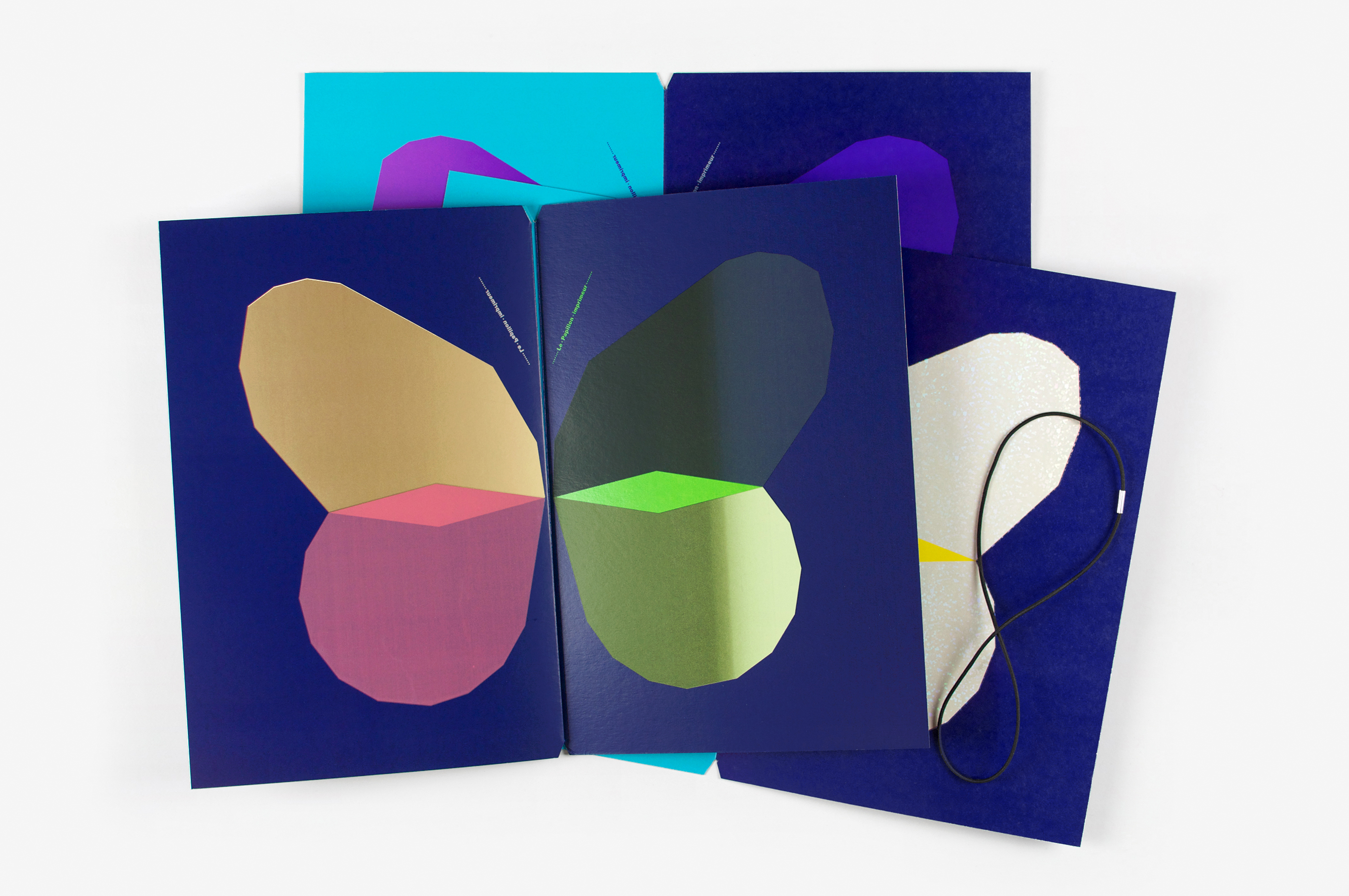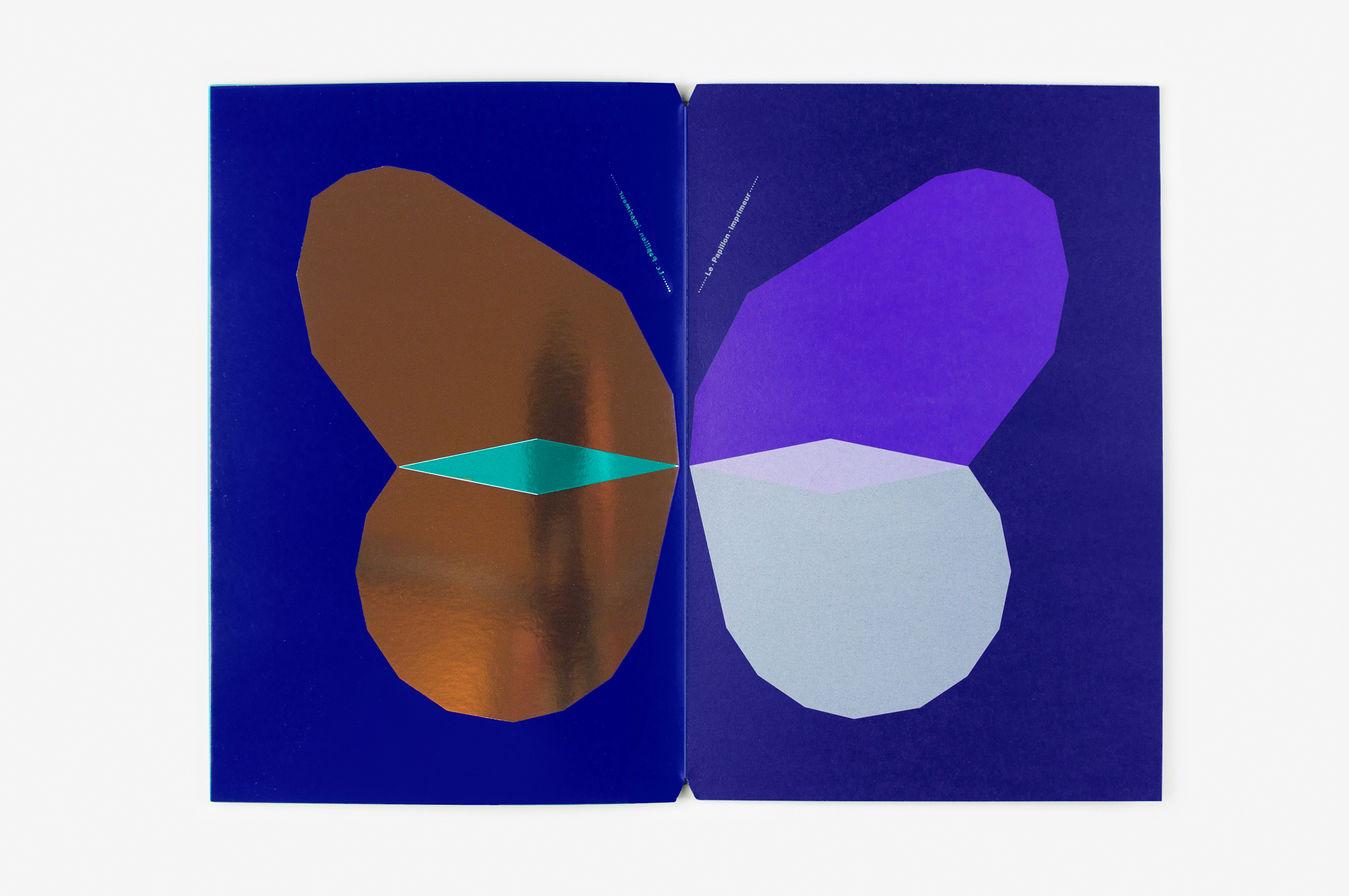 Ce livre a été imaginé comme un prolongement éditorial des affiches Papillons (jour et nuit) conçues suite à l’exposition Un Imprimeur au Havre. Les pages du livre, imprimées dans différentes techniques (sérigraphie, offset, dorure à chaud), peuvent être assemblées librement pour créer de nouvelles combinaisons d’ailes colorées, à la manière d’un nuancier. Les aléas provoqués au cours de l’impression rendent chaque livre unique. Le livre tient debout, la partie jour et la partie nuit (phosphorescente) étant réparties de part et d’autre du pli central. Le titre, qui figure les antennes, est imprimé sur chaque page, comme un mantra dont la répétition et la symétrie renvoient au mouvement d’impression. Le livre est dédicacé à ma maman Manu qui m’a légué le goût des belles pages et m’envoie régulièrement des (vrais) papillons!