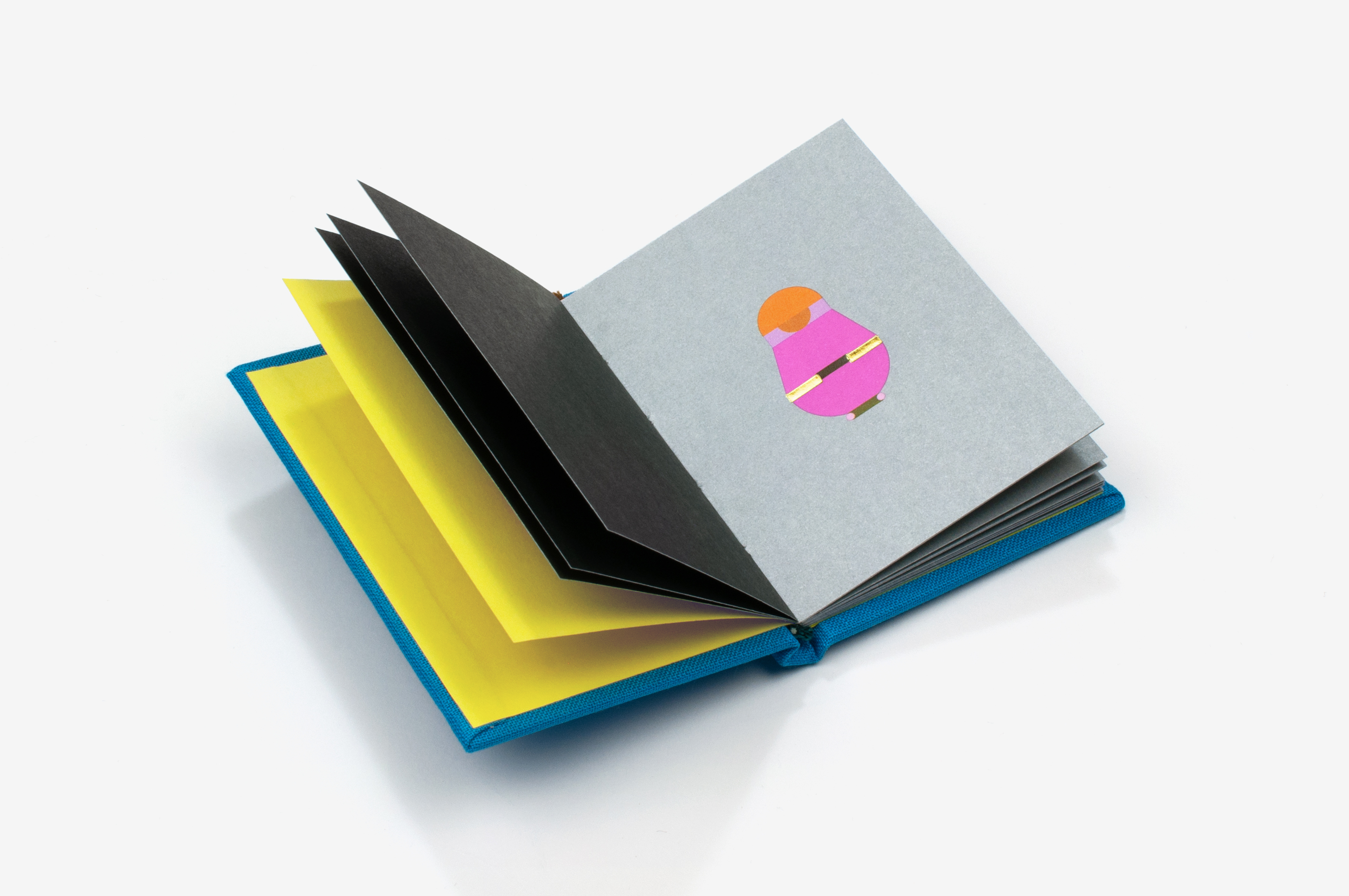 Matriochka is a small book that tells a very short, but very intricate story. 16 dolls shrink from page to page, the last one measuring only a few millimeters high. Fanette Mellier invites us to explore this multicolored family in microscopic detail. Observed under a magnifying glass, the ordinarily imperceptible details of the printing become the motifs that cover the tiny figurines. This book, in which hot gilding skips a generation, speaks of singularity and transmission.