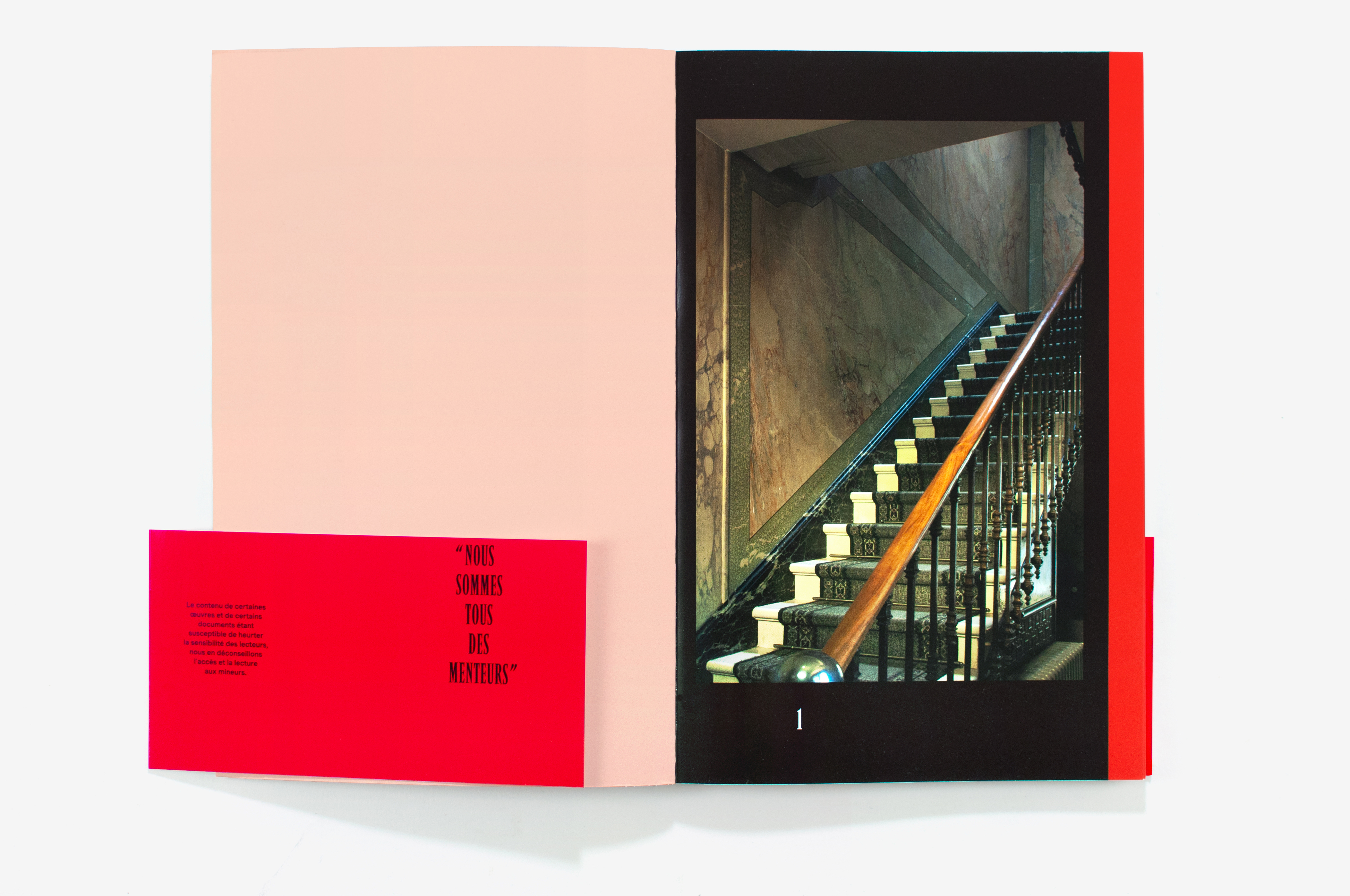 This catalogue was published on the occasion of an exhibition presented at Frac MÉCA. Pierre Molinier’s work is juxtaposed with contemporary works following on from this controversial artist. The red banner on the cover spells out the title in a disjointed way, and acts as a visual warning. The first page of the book invites us to climb the stairs of a strange hall, the walls painted by Pierre Molinier (at the time a painter and decorator). His works are then displayed on glossy paper, alternating with more documentary sections printed on salmon-pink paper. A separate booklet presents the works of his artistic disciples. The use of the Vendôme typeface, created at the same period as Molinier’s earlier work, reflects the artist’s work in its incisive clarity.