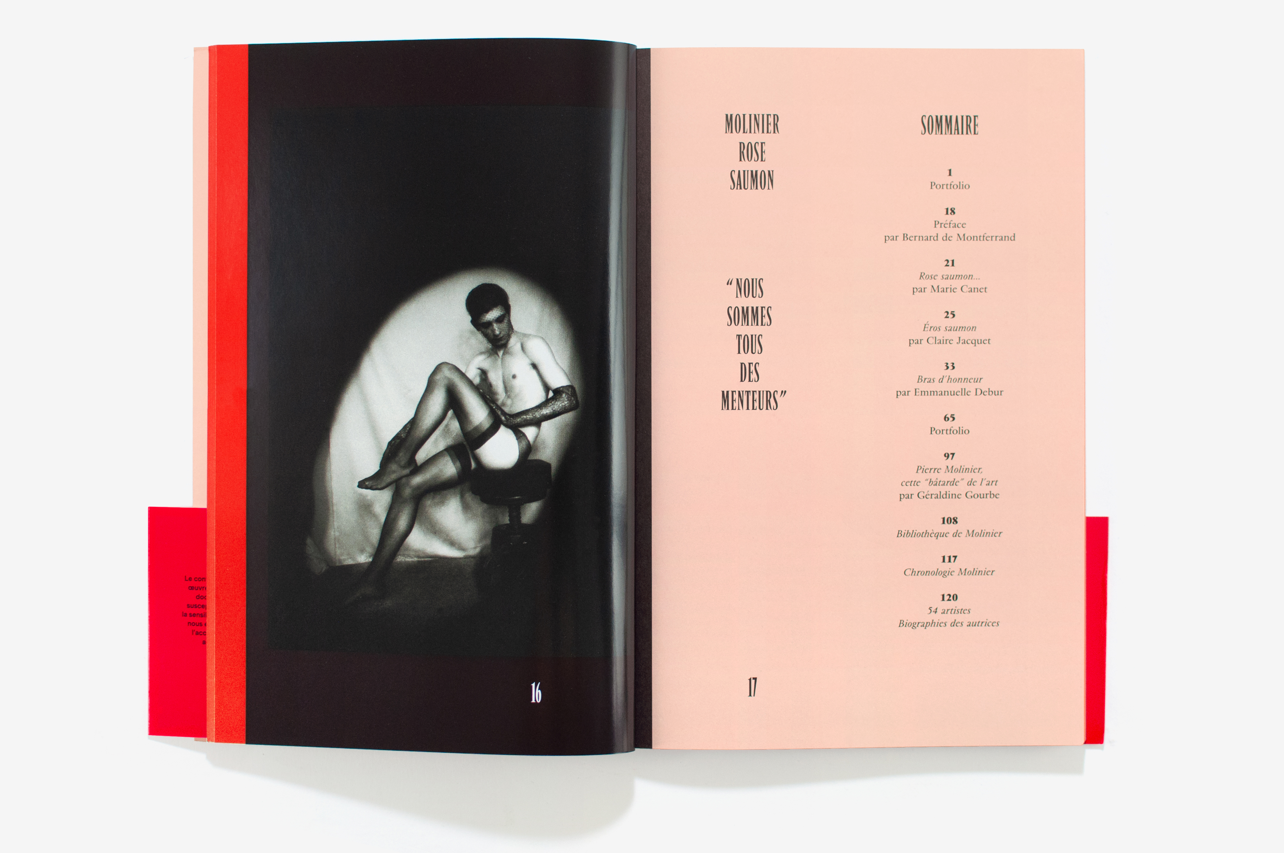 Ce catalogue a été publié à l’occasion d’une exposition présentée au Frac Méca. L’œuvre de Pierre Molinier y est mise en regard avec des œuvres contemporaines conçues dans le sillage de cet artiste sulfureux. Le bandeau rouge en couverture donne à lire le titre de façon heurtée, et joue le rôle d’avertissement visuel. La première page du livre nous invite à monter l’escalier d’un hall étrange, dont les murs avaient été peints par Pierre Molinier (alors peintre décorateur). Ses œuvres sont ensuite déployées sur papier glacé, an alternance avec des parties plus documentaires imprimées sur un papier rose saumon. Un cahier à part présente les œuvres de ses disciples artistiques. La typographie Vendôme, contemporaine de l’émergence de son œuvre, y répond par son dessin incisif, contrasté.