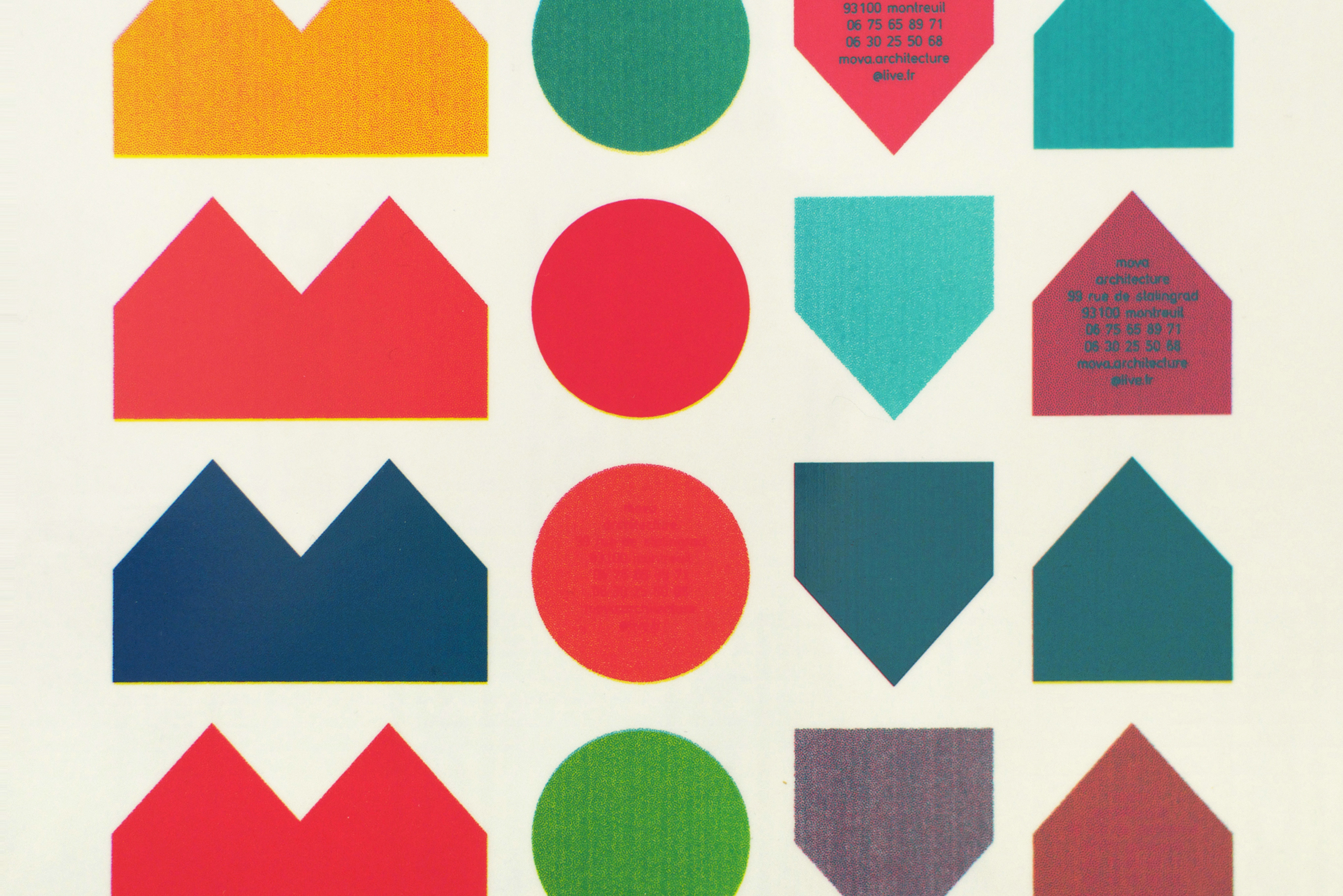 Mova est un cabinet d’architecture qui travaille sur des projets à échelles diverses avec simplicité, poésie et respect de l’environnement. L’identité graphique est évolutive. Les 4 lettres de Mova évoquent des rudiments d’architecture et de paysage: maisons, usine, soleil. J’ai souhaité que le graphisme soit comme une boîte à outils à investir pour chaque support, afin de recomposer perpétuellement ce mini-paysage, comme un jeu. Des autocollants ont été imprimés et prédécoupés en planches, qui peuvent être collés et s’inscrire en contraste sur des supports divers à connotation de bureau (enveloppe kraft, cartes bristols), ou à plus grande échelle sur des panneaux standard de permis de construire.