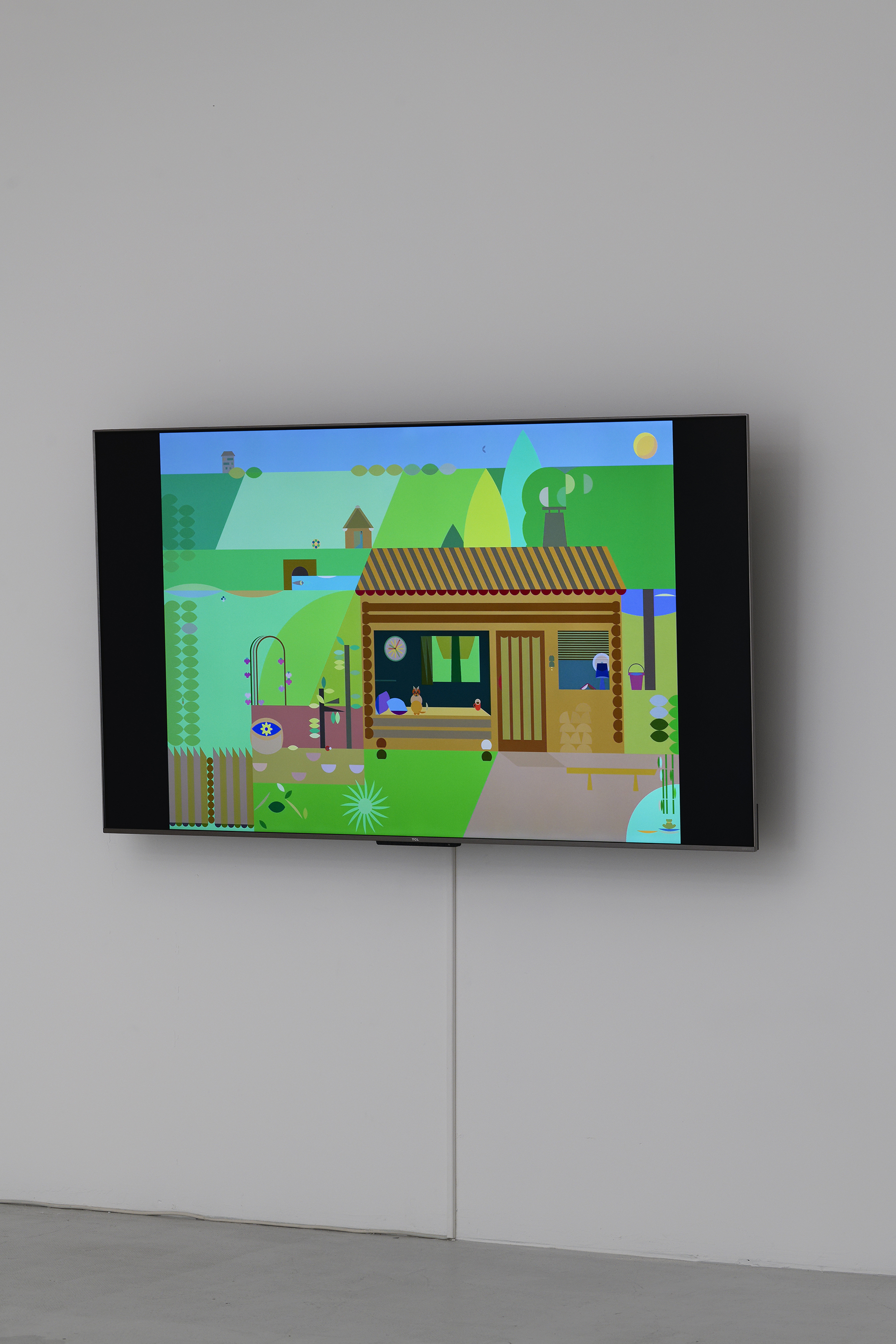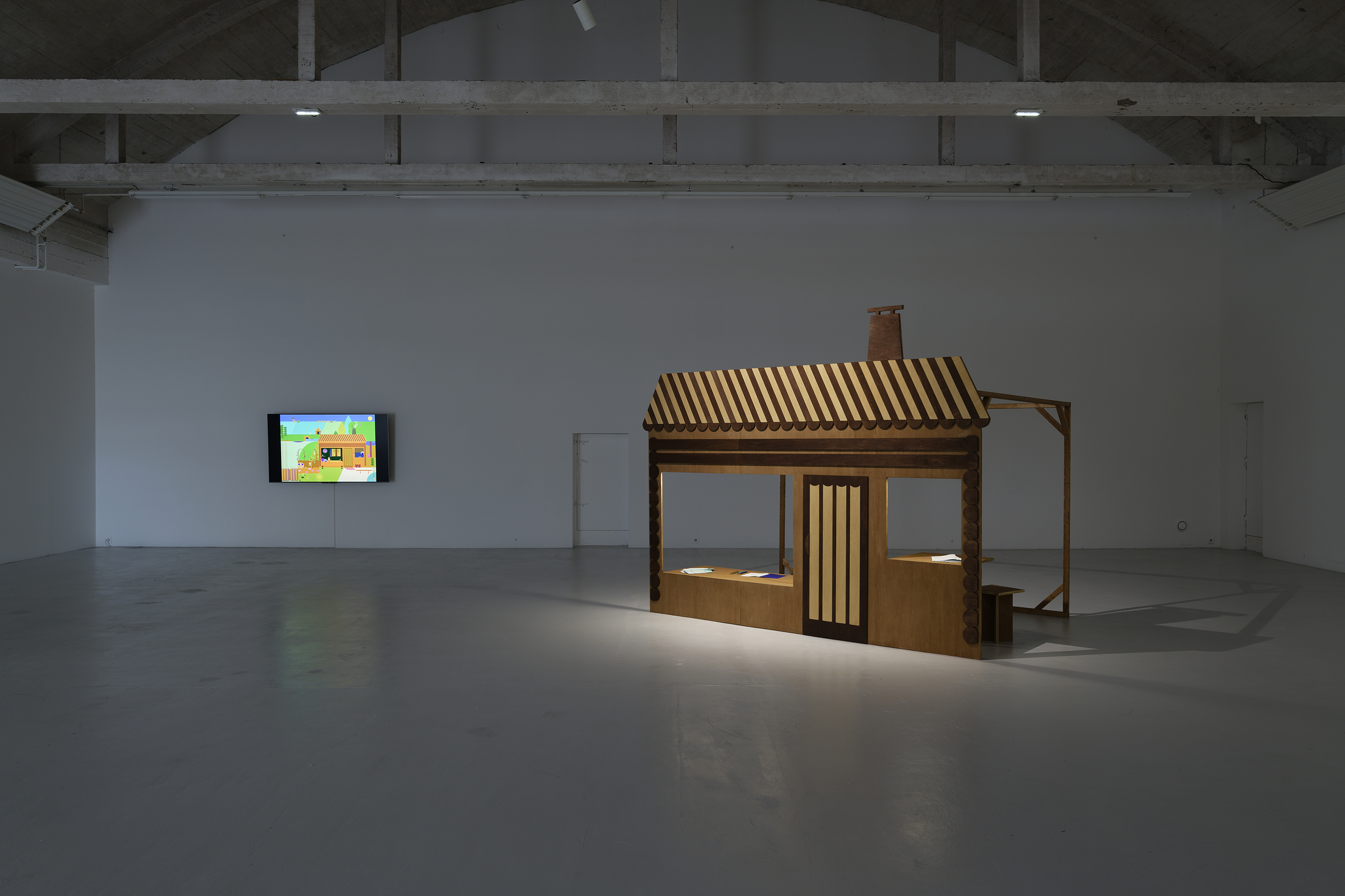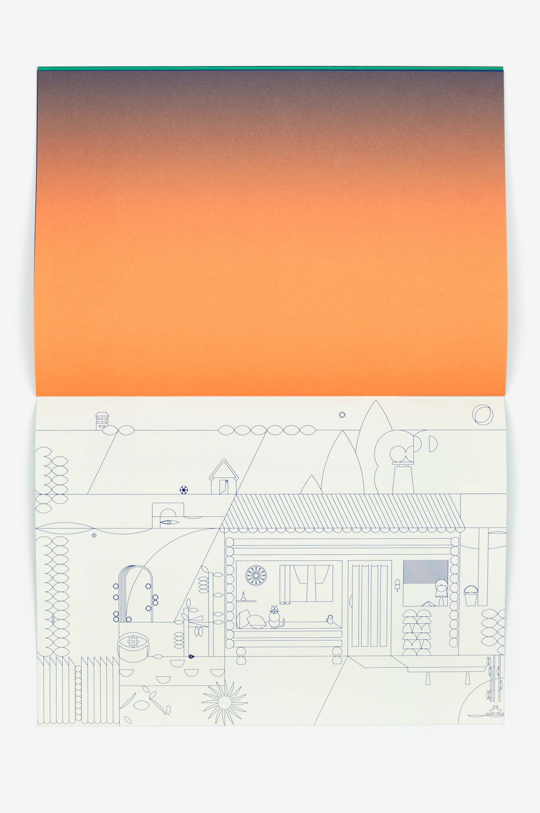 The exhibition at the Passerelle Centre for Contemporary Art, when the book and animated cartoon Panorama were presented, was an opportunity to adapt design to large-format screen printing. Here the magic of successive colour changes is conveyed, plunging the landscape into night and marking the passage of time. The little house, represented in the exhibition as a set, allows visitors to become part of the work, taking the colouring books published for the occasion so as to add their own touch of colour to the Panorama.