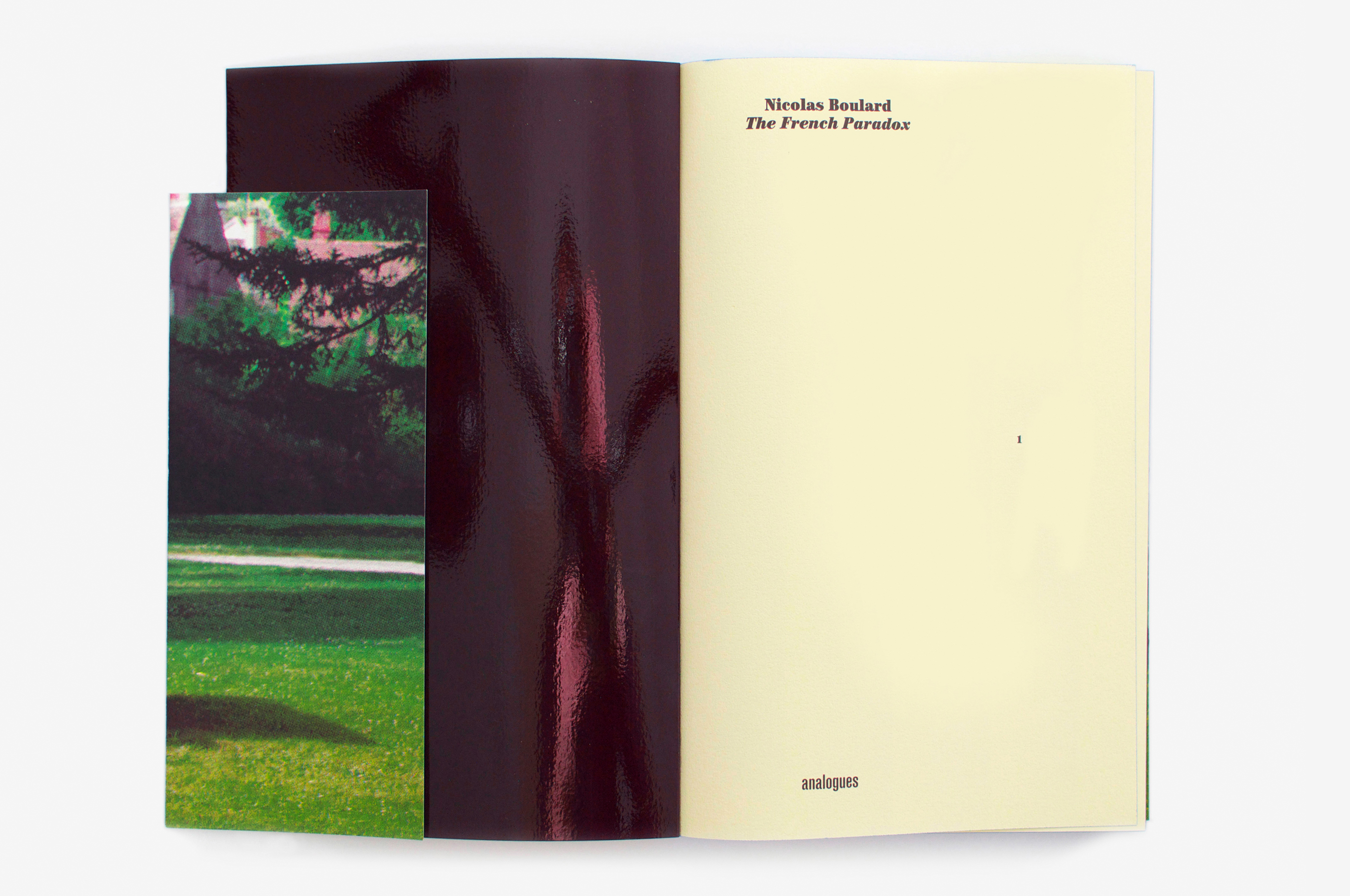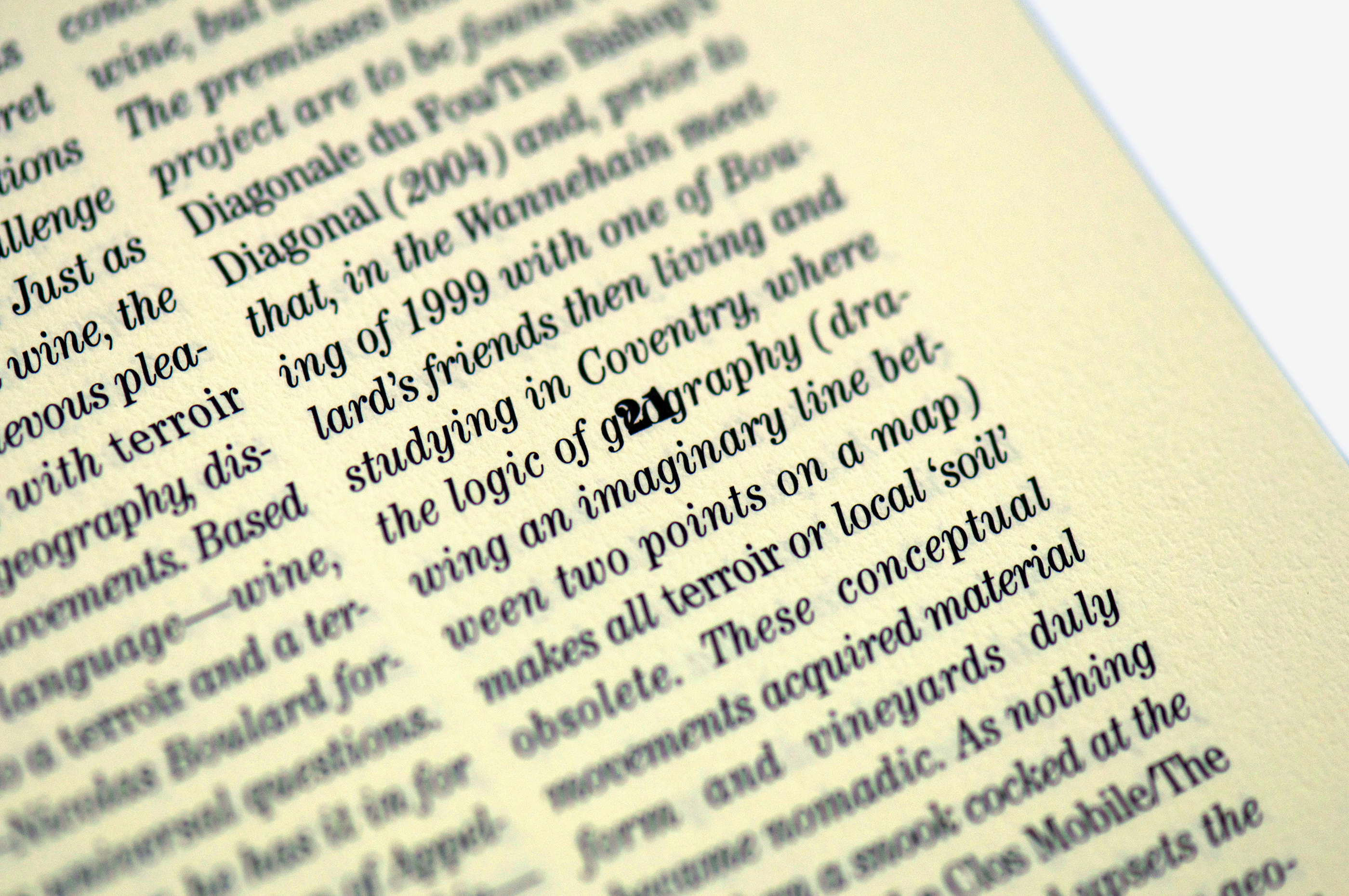 Nicolas Boulard, artiste singulier et polymorphe, s’est fait connaître notamment par son travail artistique sur le vin, étant lui-même issu d’une famille de vigneron. Nous avons travaillé en collaboration étroite pour la mise en forme de son premier catalogue monographique. J’ai souhaité que le graphisme ait un lien subtil avec le monde viticole qui imprègne son travail. La jaquette montre une œuvre phare: un intrigant clos de vigne mobile qui voyage entre différents lieux d’exposition. Sérigraphié avec un mélange d’encres choisies avec l’artiste et variant au fil du tirage, chaque exemplaire est unique. La carte de couverture est teintée dans la masse, et son verso brillant rappelle par son intensité la robe du vin. La tranche bleue est un clin d’œil au sulfate de cuivre («bouillie bordelaise») pulvérisé pour traiter les vignes, un parallèle bibliophilique. Le premier cahier est imprimé sur un papier crème martelé, servant habituellement aux étiquettes de vin. Suit un parcours dans les œuvres, partant d’un monochrome noir en verre pour aller vers un monochrome blanc en sucre. La pagination, à une place inhabituelle, se surimprime aux textes et aux images. Tantôt agaçante, tantôt camouflée, elle agit comme une mouche. À l’image de cet artiste provocateur!