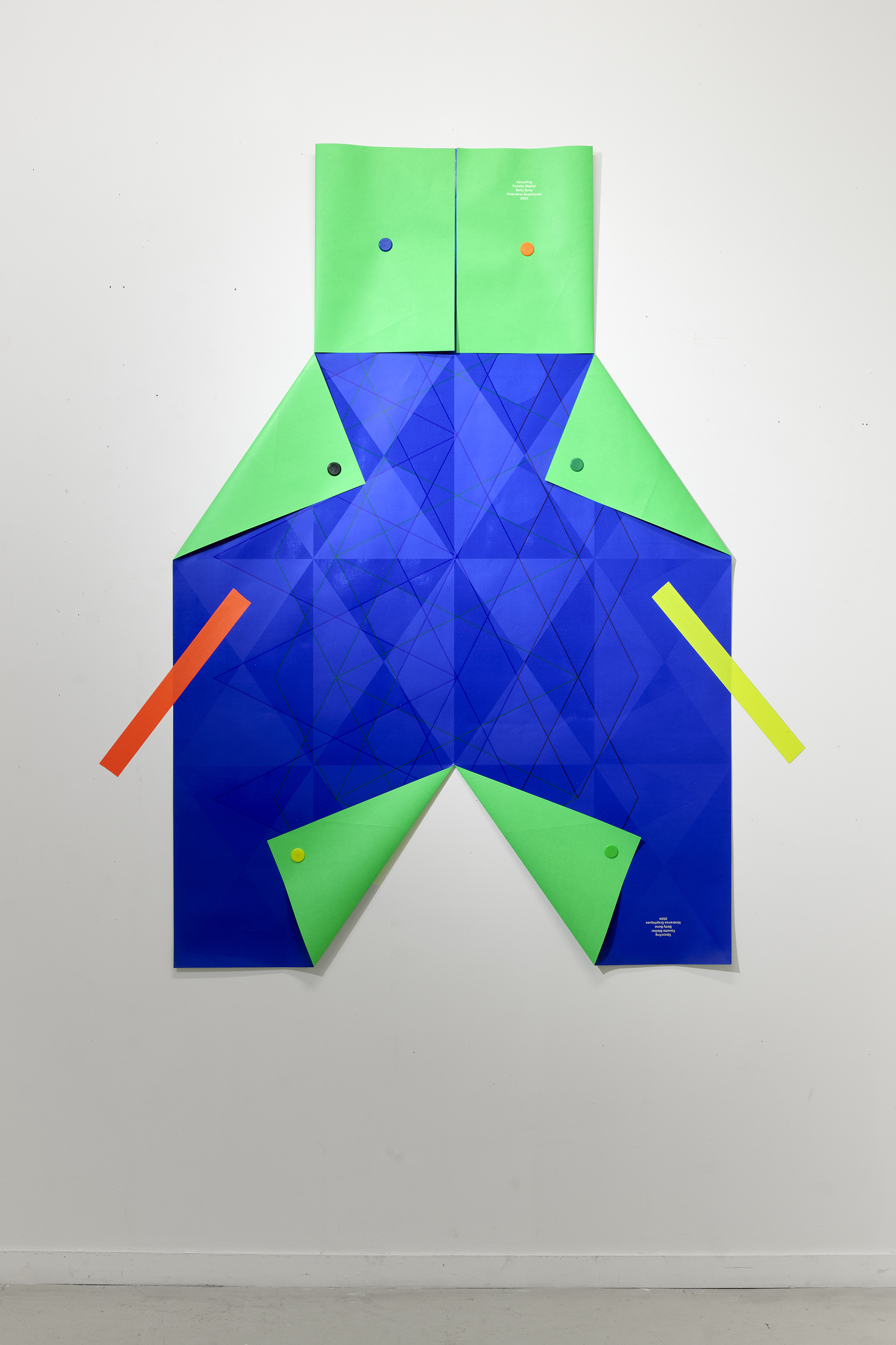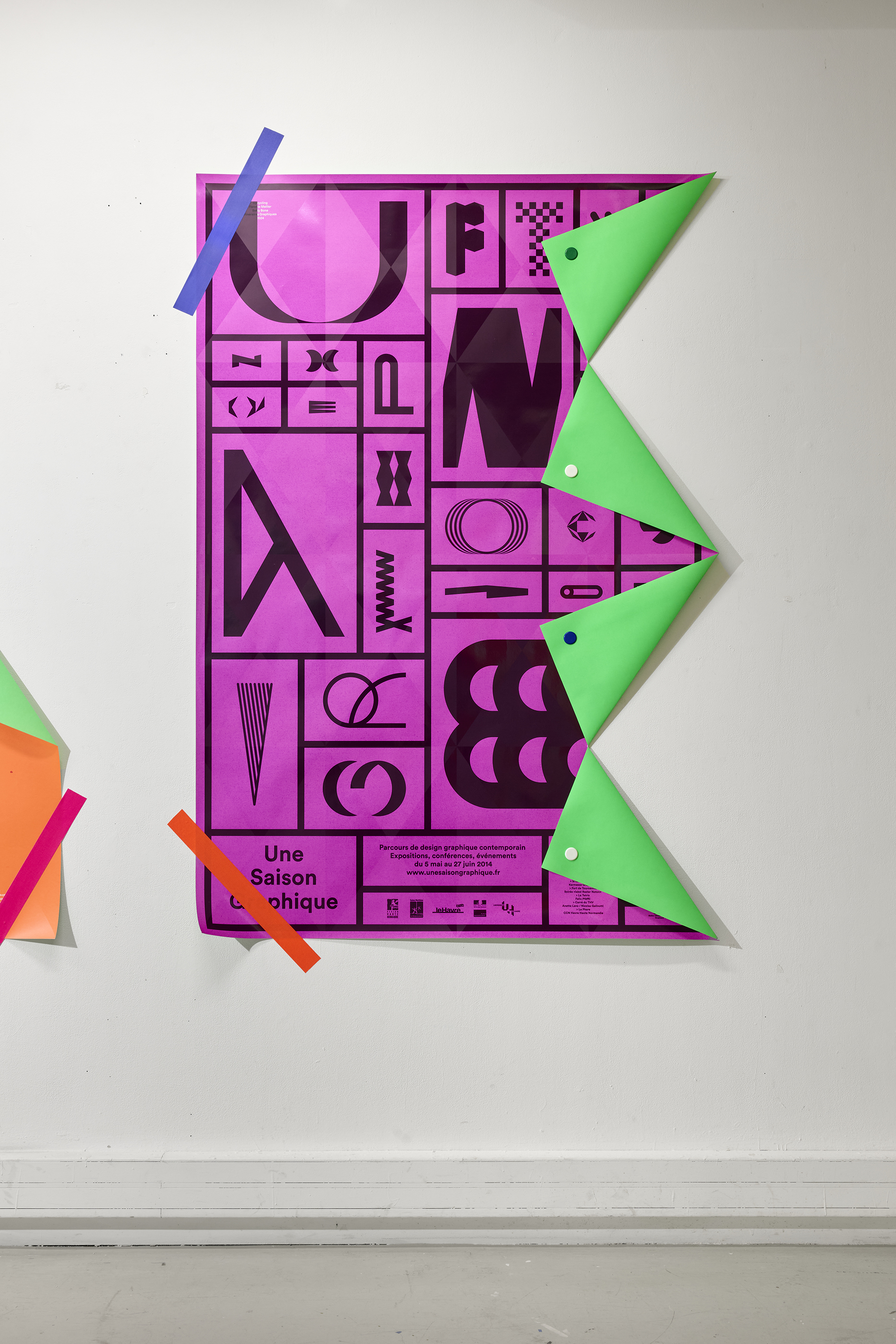 The Upcycling installation gave my posters a second life, transforming them into large letters. Around thirty Decaux-format posters, selected from my archives, were sent to Lézard graphique where they were reprinted. Covered with a flat colour and a varnish (with the Multipli grid, created in Nantes in 2010), they are transformed into letter matrices. Thanks to some magical folding, a sentence (written by Betty Bone) emerges: “See double on occasion”. This Upcycling transforms the printed material and gives it new life, as well as allowing me to re-visit my graphic work.