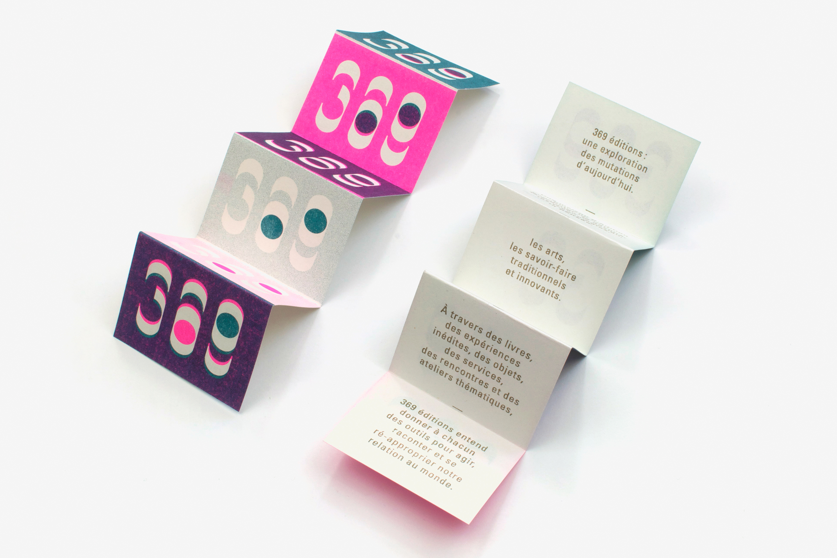 369 est une petite maison d’édition singulière qui publie des livres, des rencontres et du design. Le logotype, dans son dessin, affirme l’idée d’écho, d’ouverture et de modularité. La multiplication (3… 6… 9!) devient élan graphique, et autorise des jeux en termes de couleur et de déconstruction.