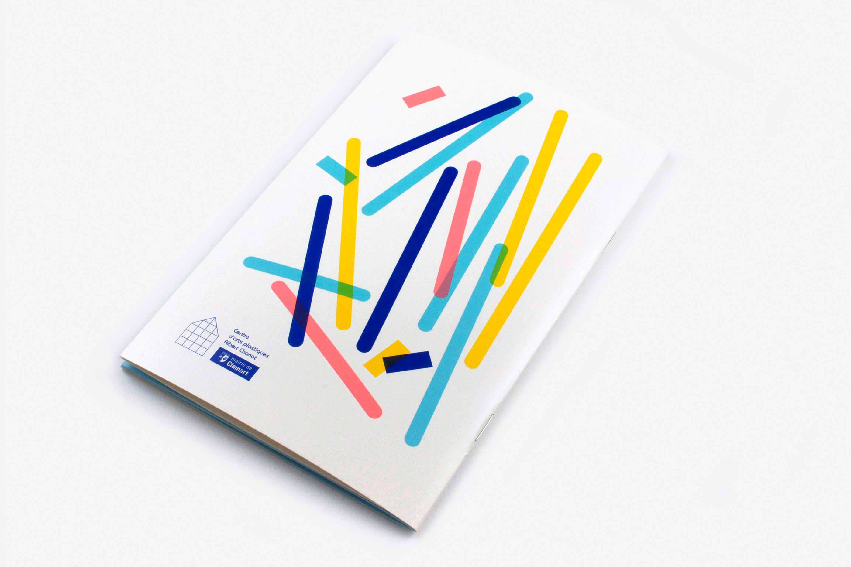 The structure of the Albert Chanot Art center building is the basis of the graphic conception. The house’s characteristic form (which is also used in the logo) was synthetically redesigned to provide a unifying symbol for all communication materials: booklet, invitations, posters. In the booklet, the sign is built and then deconstructed. Inside the front cover, flaps unfold to reveal a calendar, and inside the booklet, the program is presented blue on blue.