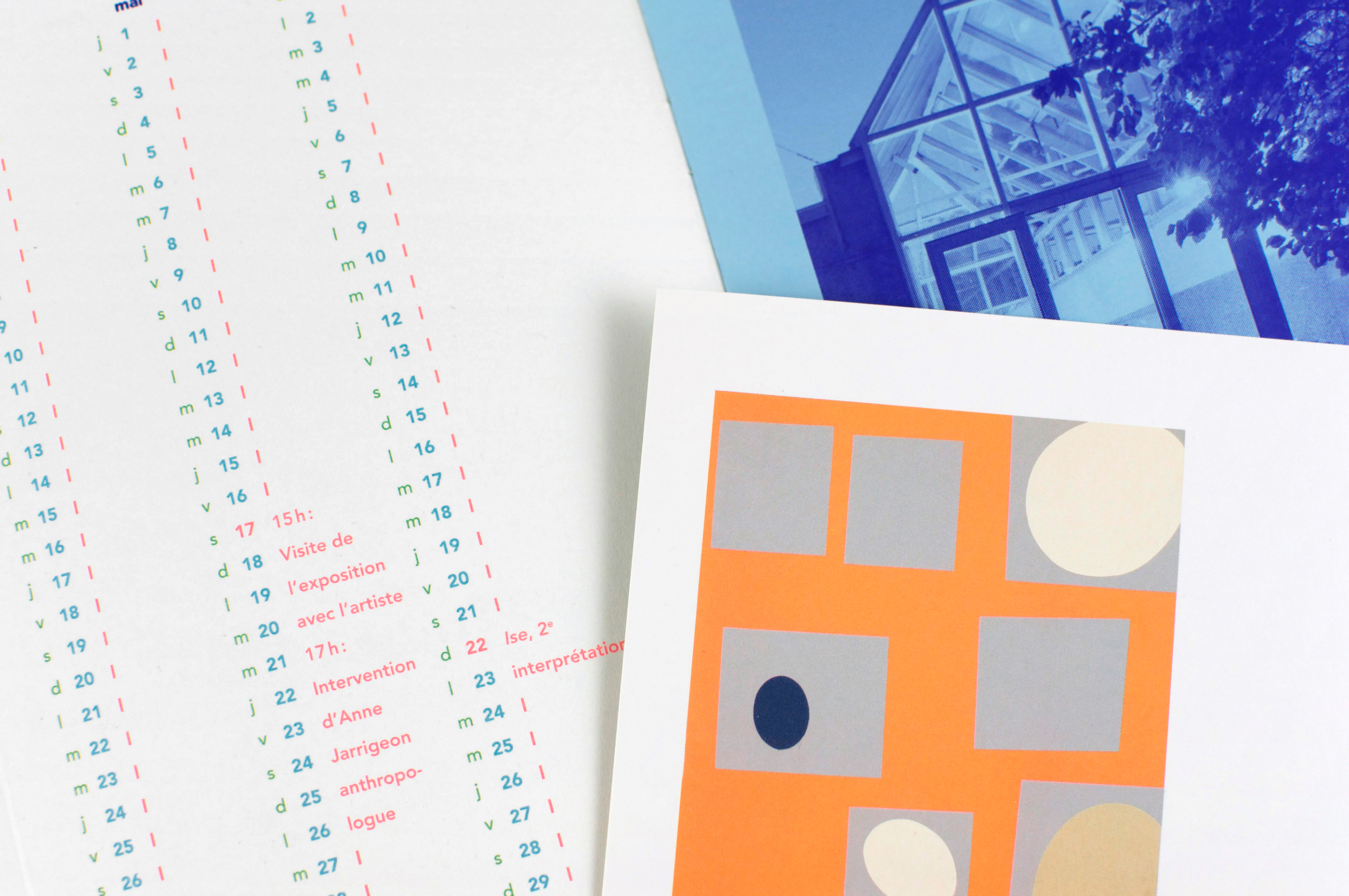 La structure du bâtiment du Centre d’art Albert Chanot constitue la base de la proposition graphique. Sa forme caractéristique de maison (qui est par ailleurs utilisée dans le logotype) a été redessinée de façon synthétique afin de constituer un signe fédérateur pour tous les documents de communication: brochure-calendrier, invitations, affiches. Dans la brochure, le signe est construit, puis déconstruit. Le calendrier se déploie de façon synthétique à l’intérieur des rabats cartonnés, et les pages intérieures offrent une image de la programmation en bleu sur bleu.