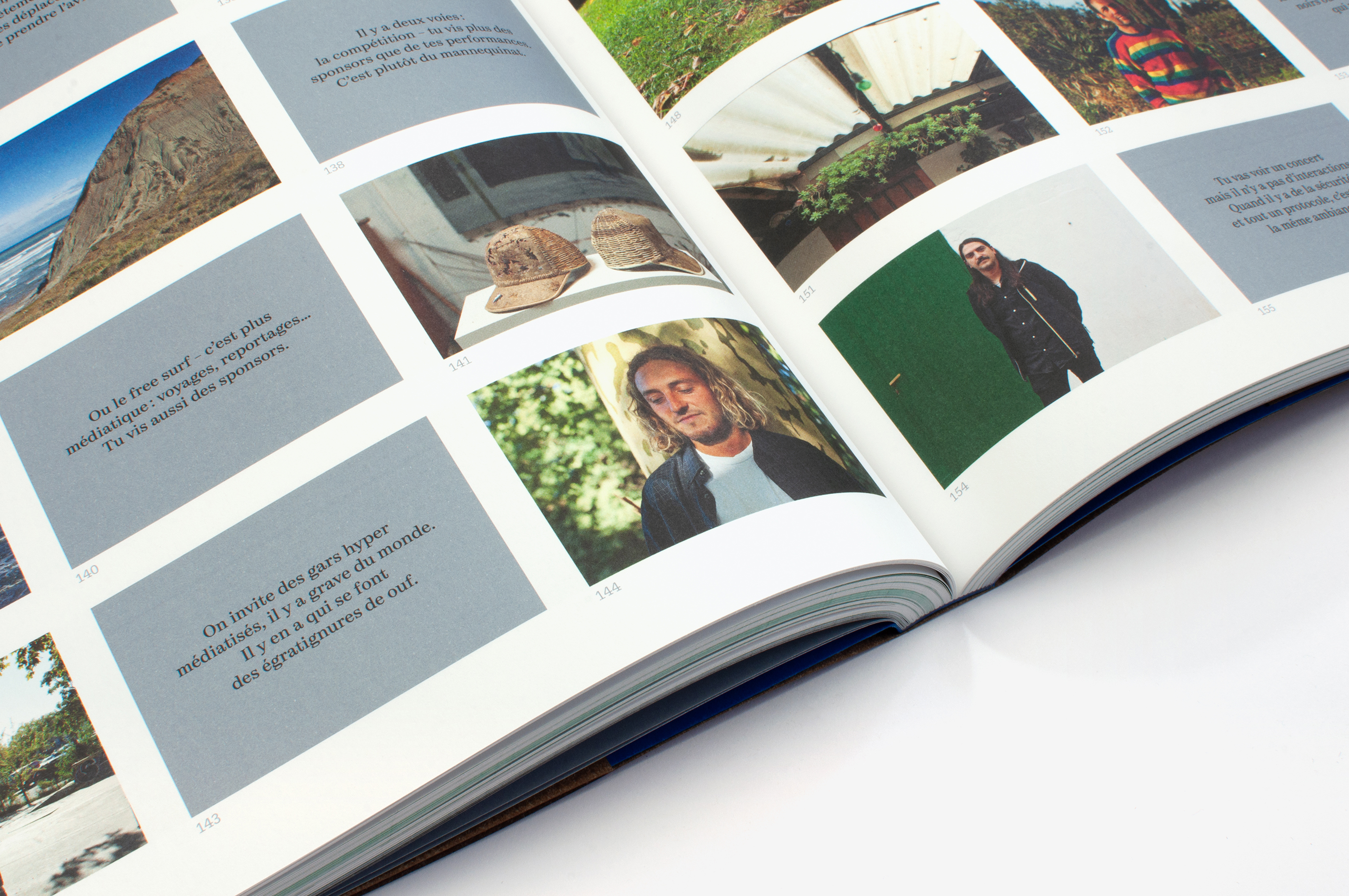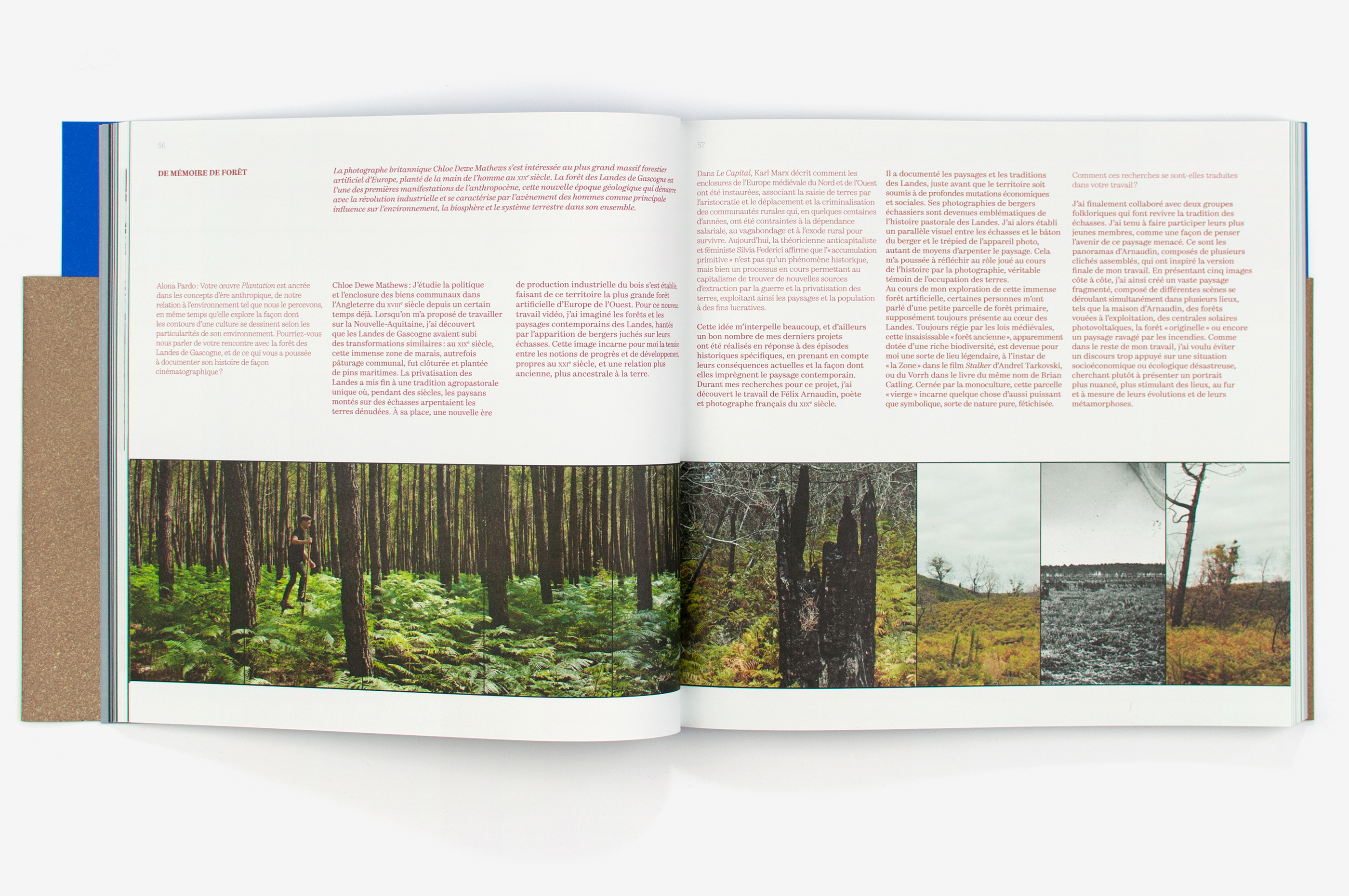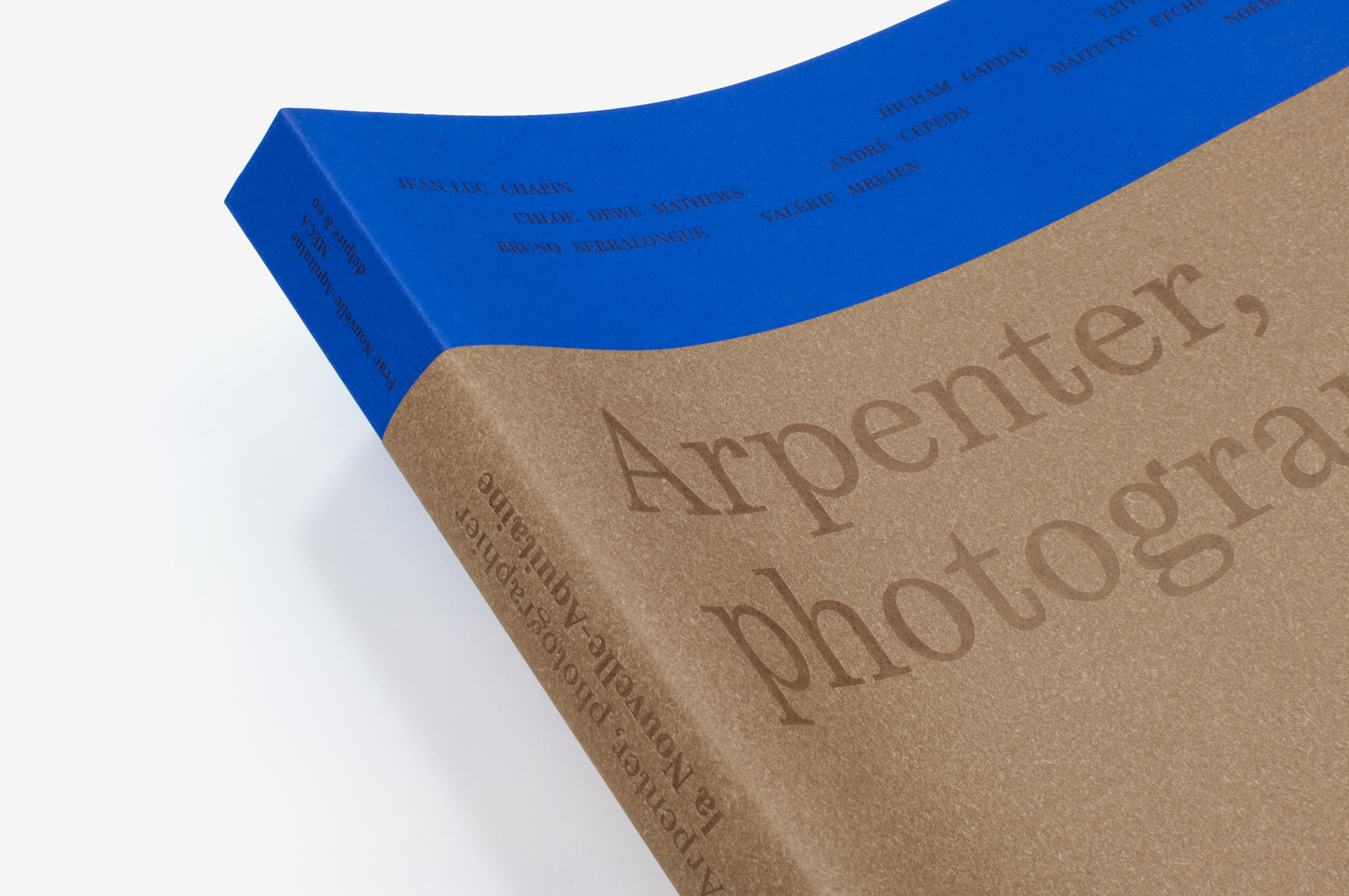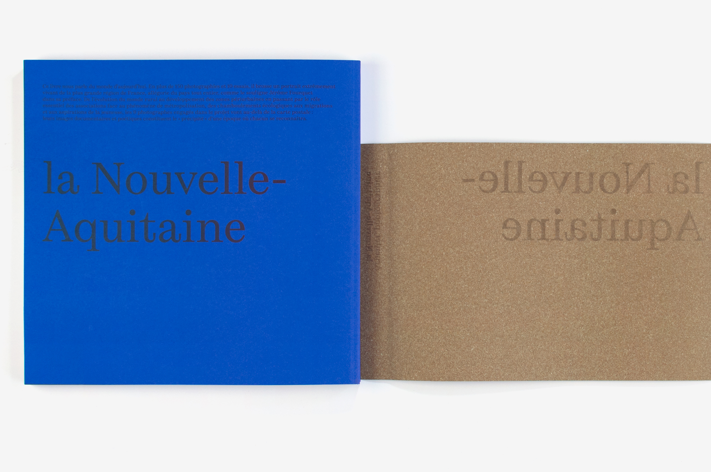 This work presents a collection of works, the result of a photographic commission initiated by the Bordeaux art centre, Frac MÉCA (Fonds régionaux d’art contemporain). The cover design expresses the idea of a territory and a horizon. The full title is debossed into the dust jacket, being an integral part of the dust jacket’s material of fibre paper (using thermochromic paper so that its colour can be changed). The colour grey (a synthesis of photography’s original black and white) structures the entire book, either in flat tints or mixed with the pure inks of the four-colour process, which thus gain in subtlety.