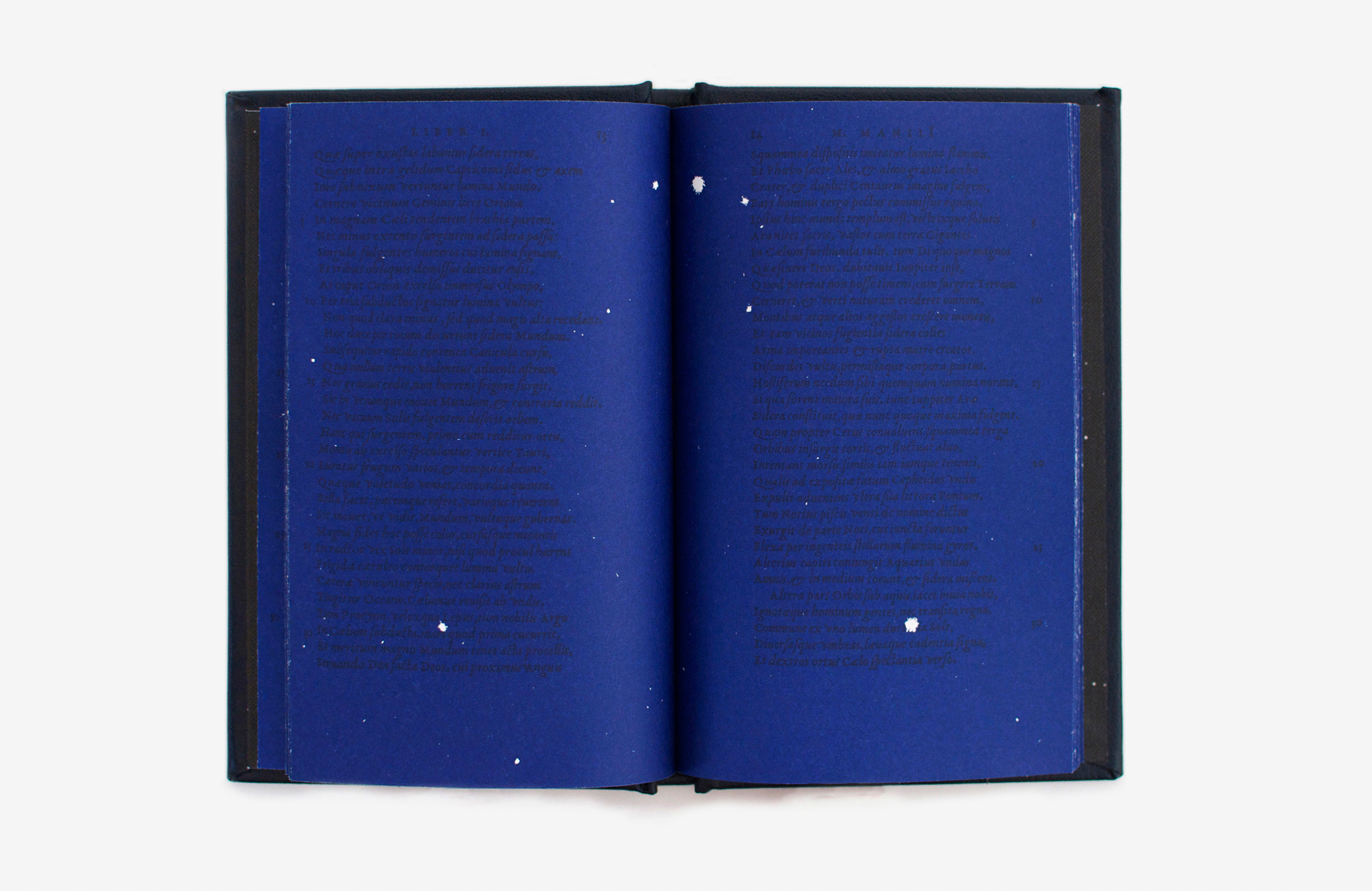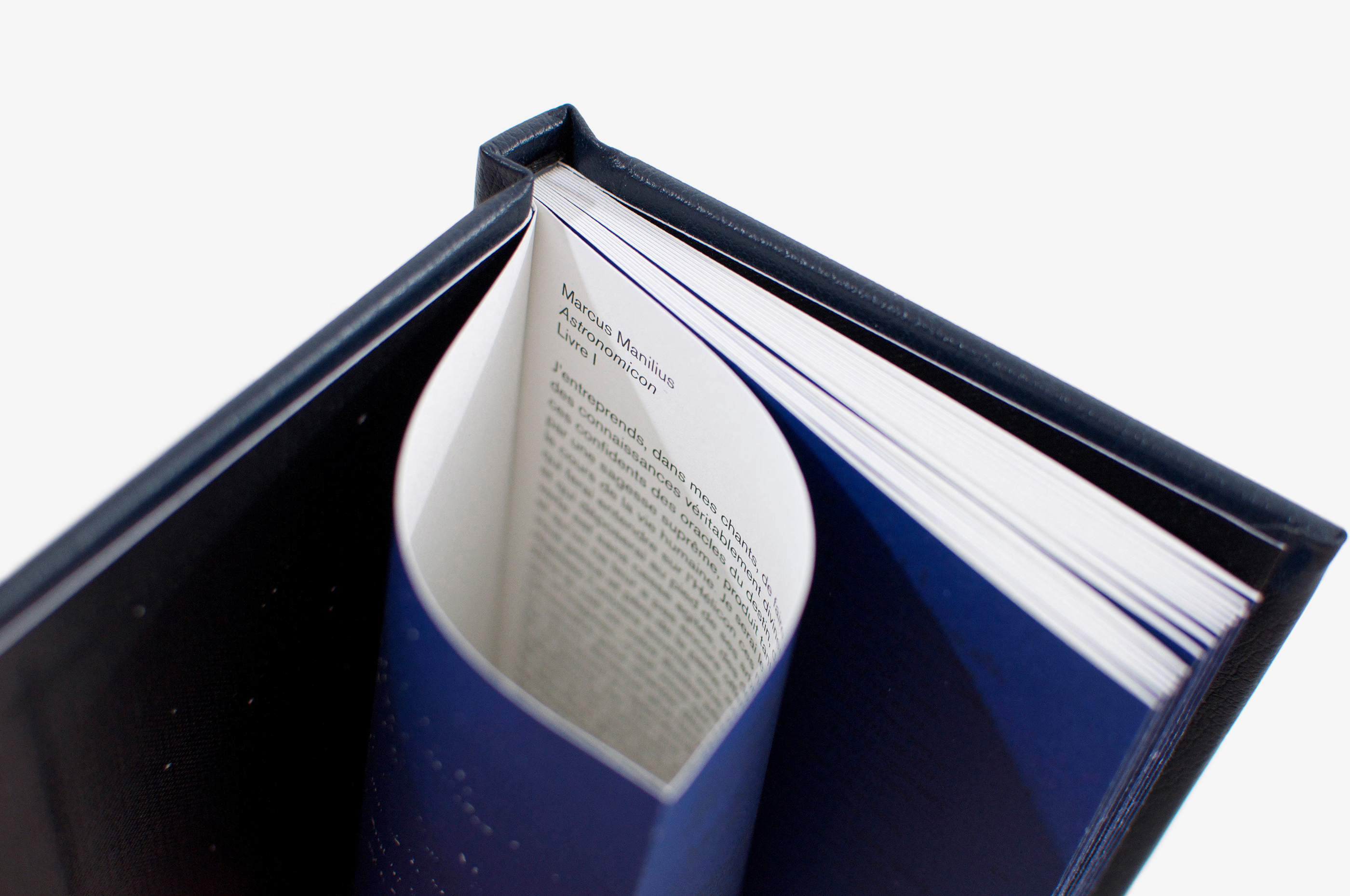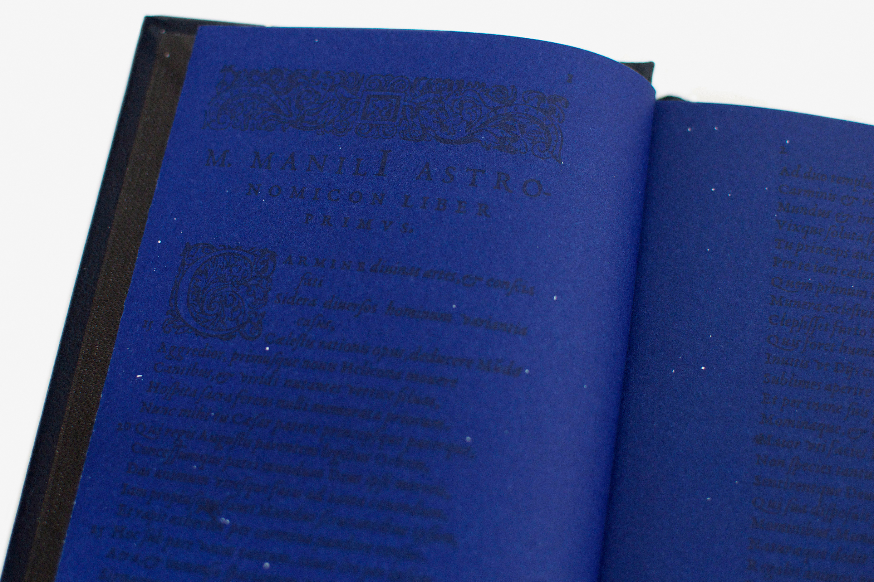 Le texte écrit par Marcus Manilius, un poète et astrologue de la Rome antique, d’origine syrienne, Les astrologiques ou la science sacrée du ciel, est un long poème en cinq livres traitant d’astrologie et d’astronomie. À la lumière de la science moderne, les propos de Marcus Manilius peuvent sembler fantaisistes, mais il se dégage une dimension allégorique universelle de ses interprétations insolites de phénomènes physiques et météorologiques. Le livre I de l’Astronomicon est basé sur la première édition imprimée de ce texte, préparée par Joseph Juste Scaliger, un érudit passionné d’astronomie. Cette édition en latin est conservée dans de rares bibliothèques en Europe. Fac-similé à l’échelle 1 de la version originale numérisée, l’édition est plongée dans une mystérieuse «nuit», en écho à l’oubli dans lequel est tombé ce texte. La traduction du texte en français datant du XVIIIe siècle, se trouve sur l’envers des pages reliées à la japonaise: libre au lecteur de laisser l’ouvrage dans sa «nuit» éditoriale, ou d’en lire la traduction, pour cela il faudra déchirer les pages. La même logique a été appliquée à la couverture de l’ouvrage, rembordée de cuir bleu-noir, sur laquelle les petites poussières sont dorées à chaud. Les pages de garde présentent une image photographique de la voute étoilée, imprimée en noir sur papier toilé, en vis-à-vis de la poussière stellaire du fac-similé.