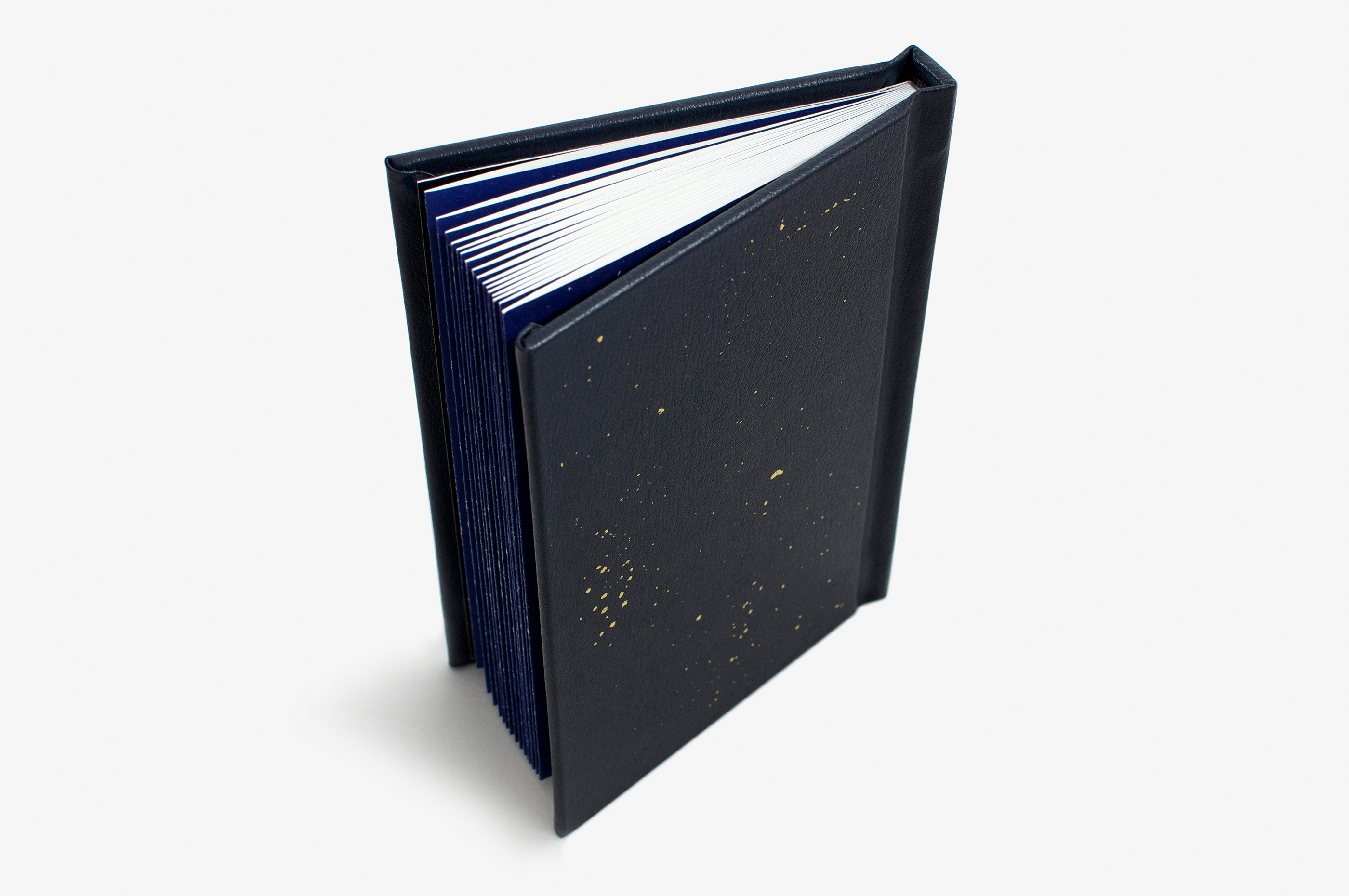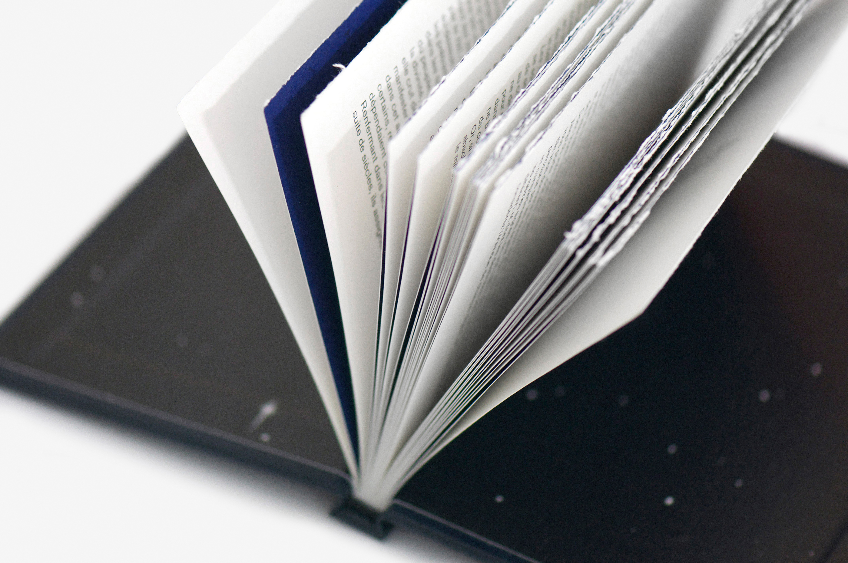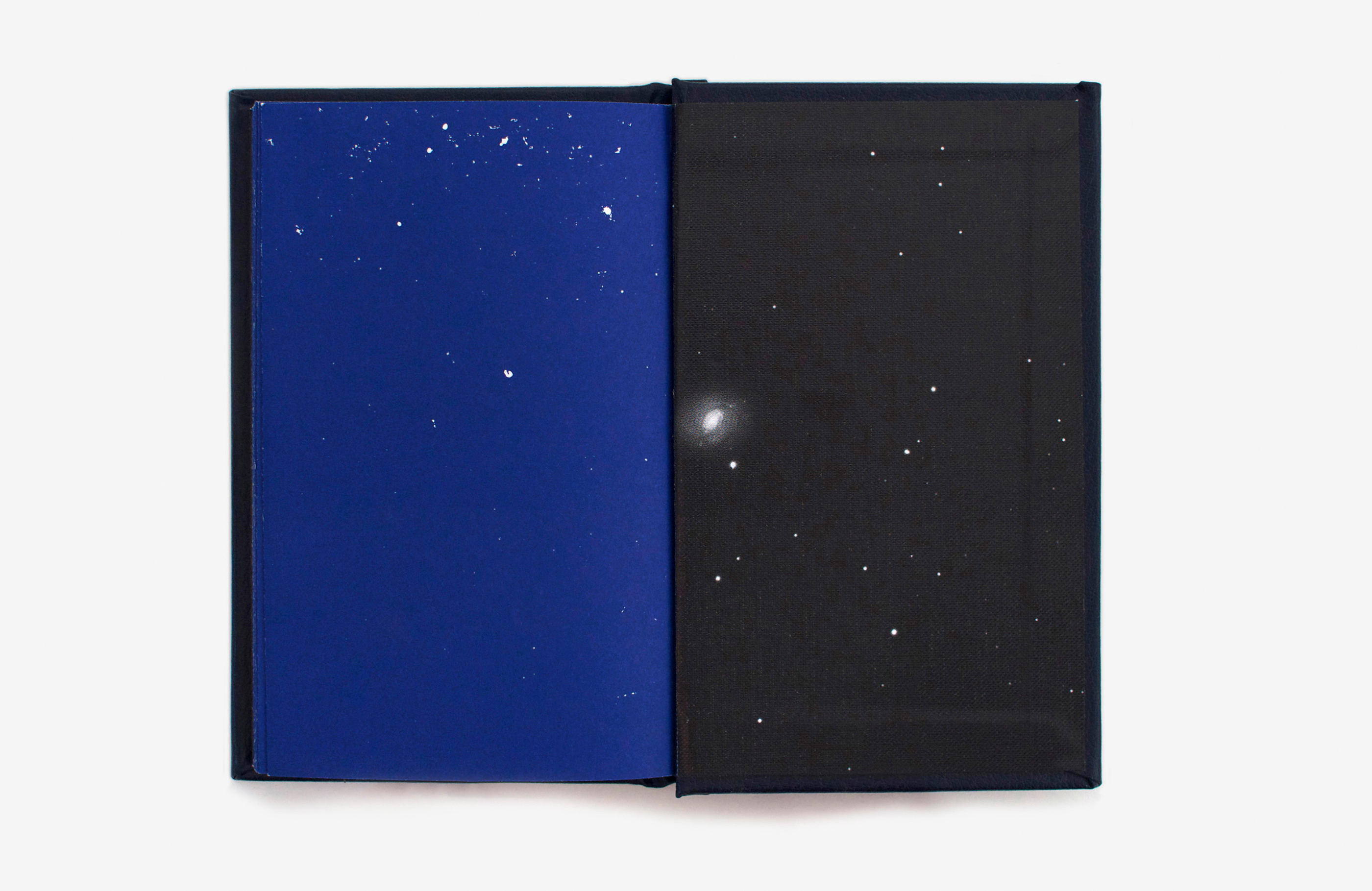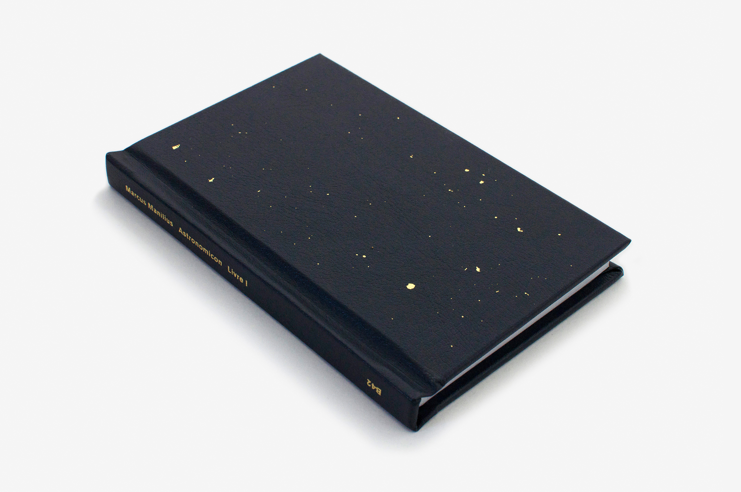 Le texte écrit par Marcus Manilius, un poète et astrologue de la Rome antique, d’origine syrienne, Les astrologiques ou la science sacrée du ciel, est un long poème en cinq livres traitant d’astrologie et d’astronomie. À la lumière de la science moderne, les propos de Marcus Manilius peuvent sembler fantaisistes, mais il se dégage une dimension allégorique universelle de ses interprétations insolites de phénomènes physiques et météorologiques. Le livre I de l’Astronomicon est basé sur la première édition imprimée de ce texte, préparée par Joseph Juste Scaliger, un érudit passionné d’astronomie. Cette édition en latin est conservée dans de rares bibliothèques en Europe. Fac-similé à l’échelle 1 de la version originale numérisée, l’édition est plongée dans une mystérieuse «nuit», en écho à l’oubli dans lequel est tombé ce texte. La traduction du texte en français datant du XVIIIe siècle, se trouve sur l’envers des pages reliées à la japonaise: libre au lecteur de laisser l’ouvrage dans sa «nuit» éditoriale, ou d’en lire la traduction, pour cela il faudra déchirer les pages. La même logique a été appliquée à la couverture de l’ouvrage, rembordée de cuir bleu-noir, sur laquelle les petites poussières sont dorées à chaud. Les pages de garde présentent une image photographique de la voute étoilée, imprimée en noir sur papier toilé, en vis-à-vis de la poussière stellaire du fac-similé.