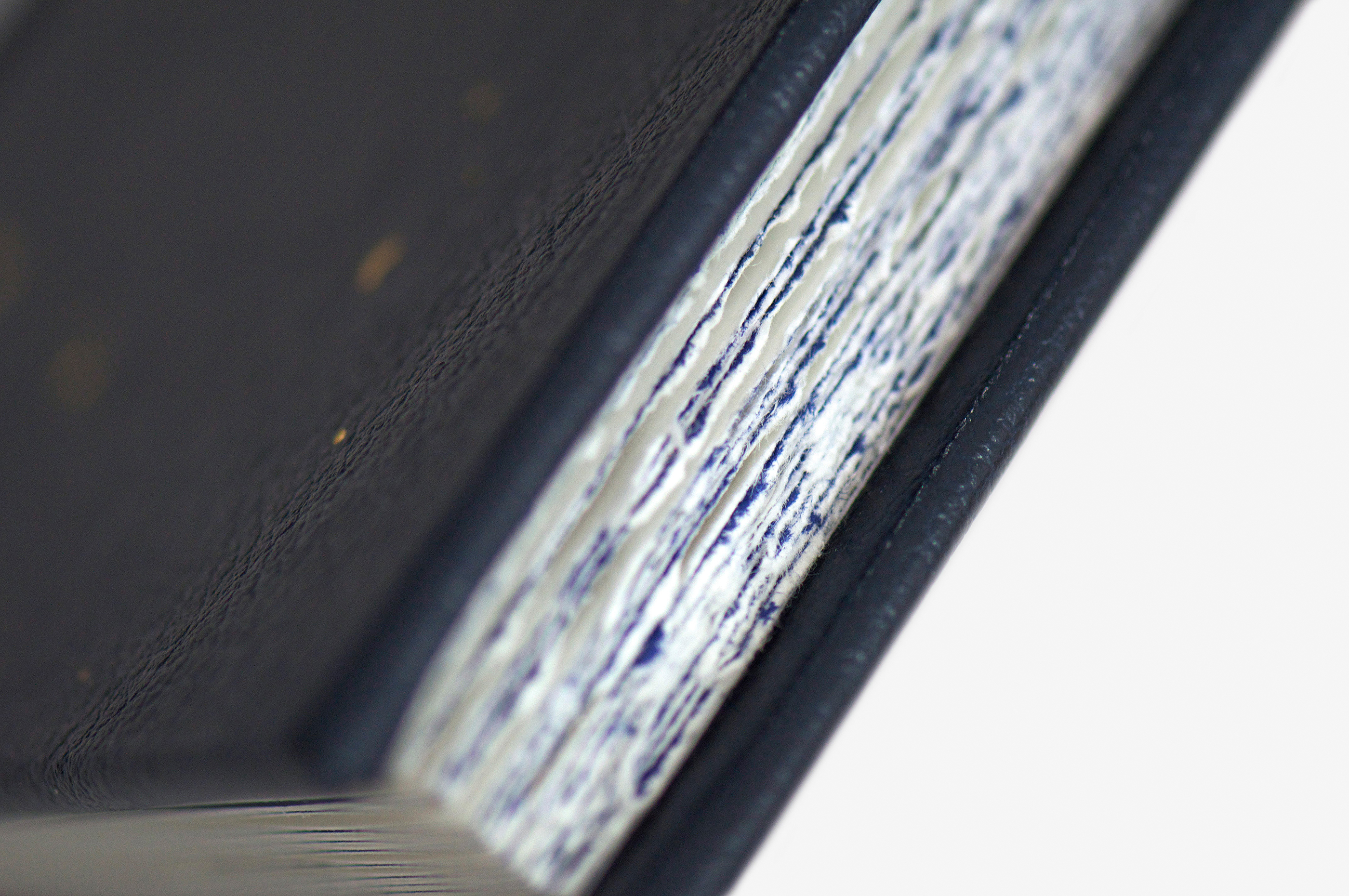 The text Les Astrologiques ou la science sacré du ciel (“Astrological or the Sacred Science of the Heavens”), a long poem in five books on astrology and astronomy, was written by Marcus Manilius, a poet and astrologer of ancient Rome, of Syrian origin. In light of modern science, the words of Marcus Manilius may seem fanciful, but a universal allegorical dimension emerges from his singular interpretations of physical and meteorological phenomena. Book I of Astronomicon is based on the first printed edition of the text, prepared by Joseph Justus Scaliger, a passionate astronomy scholar. This Latin edition is preserved in a few sparse libraries in Europe. A facsimile in the same scale as the original version, this edition is immersed in a mysterious night mood, echoing the oblivion into which the text has fallen. The French translation of the text, dating from the eighteenth century, is located on the backside of the pages, facing the Japanese version: the reader is free to leave the book in its original “night mood”, or to access the translation by tearing the pages apart. The same logic was applied to the front of the book, which is covered in a blue-black stingray leather, on which small particles of golden dust were hot foiled. The cover displays a photographic image of the starry sky, printed in black on canvas paper, alluding to the stardust visible on the facsimile.