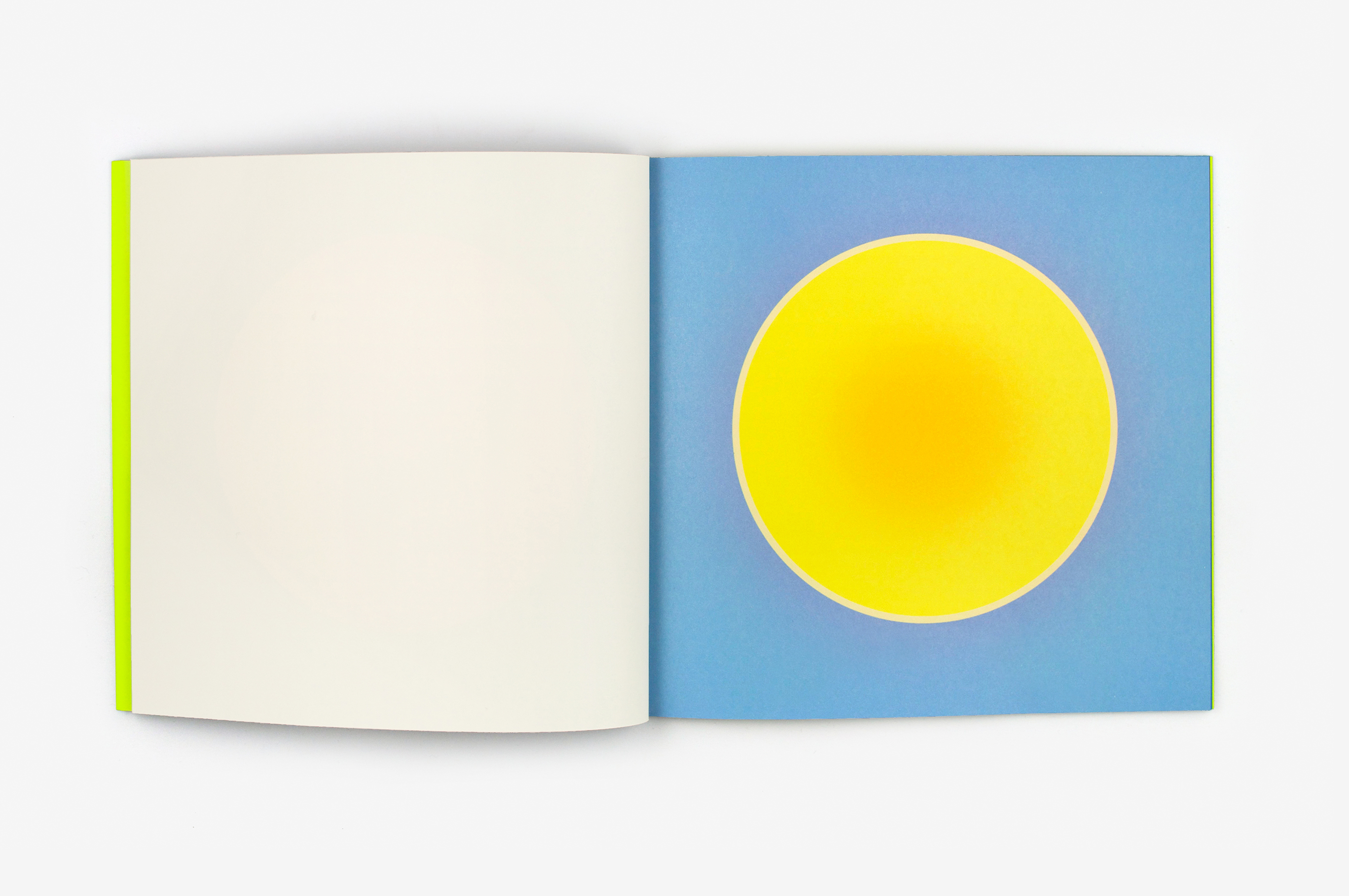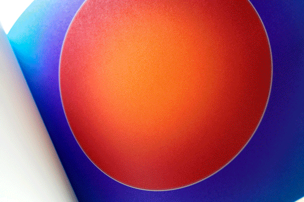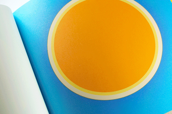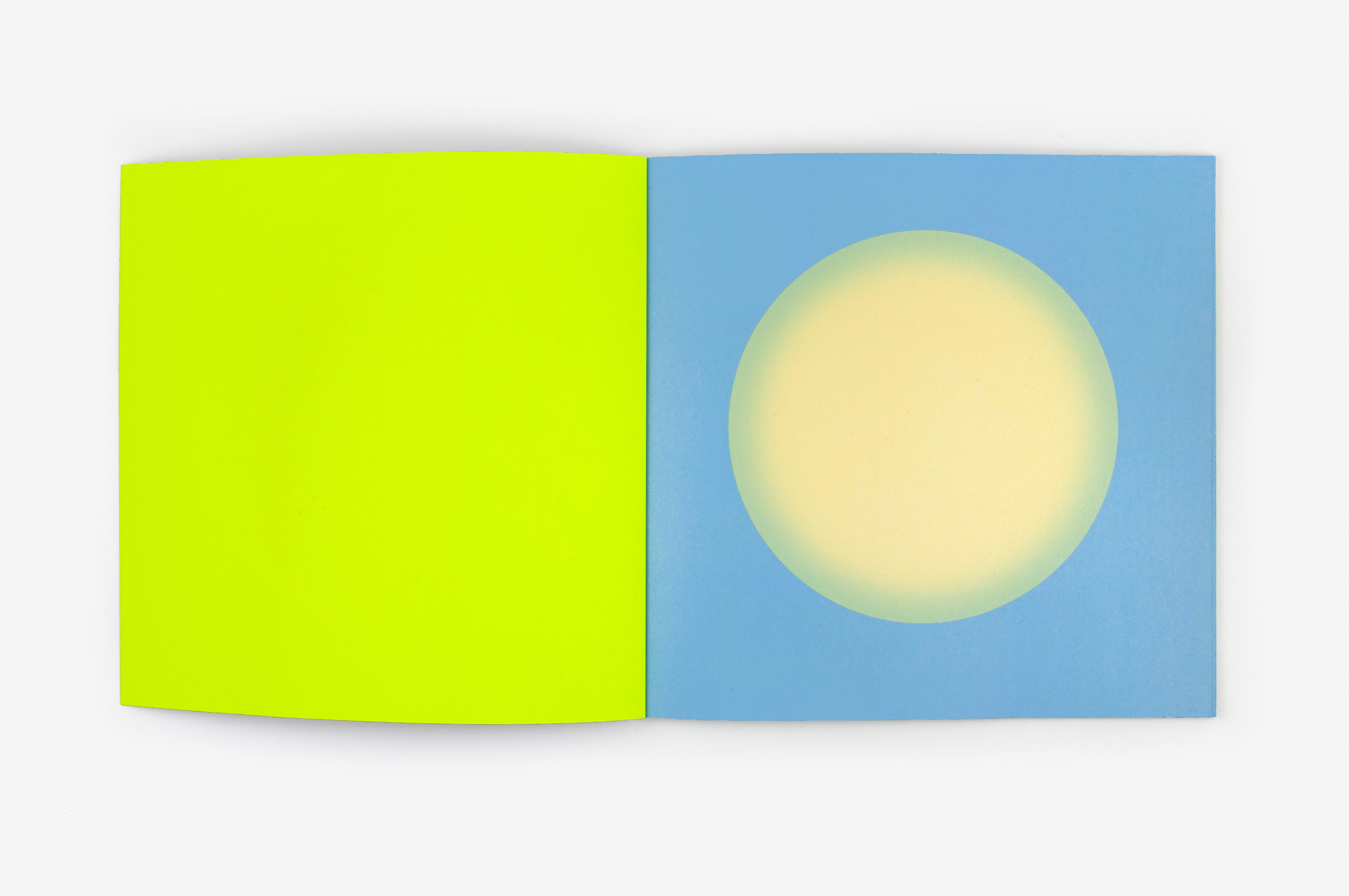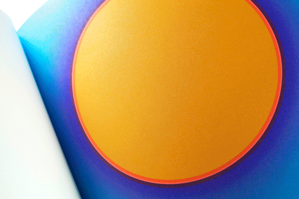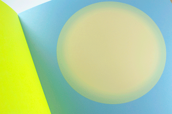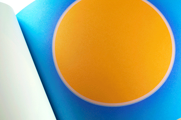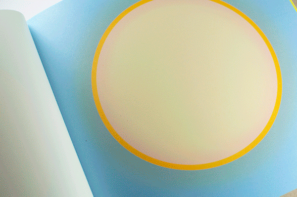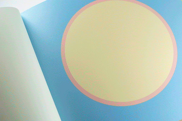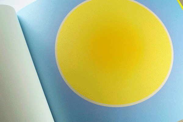 Au Soleil was dreamed up (literally) as a published twin of the book Dans la lune. Some characteristics of the books are identical (format, printing technique …). Others are different and emphasise the uniqueness of each book: number of pages, binding, paper, arrangement of forms and subjects… The simple illustration of the cycle of daylight hours in the book serves (as does the cycle in the moon book) as a pretext for a chromatic exploration within the confines of the book. The colour is diffused through a series of haloes between the sun and the sky that run into one another in an almost immaterial way. The subtle and vibrant light emanating from it tells us a story, that of a book “in itself”.