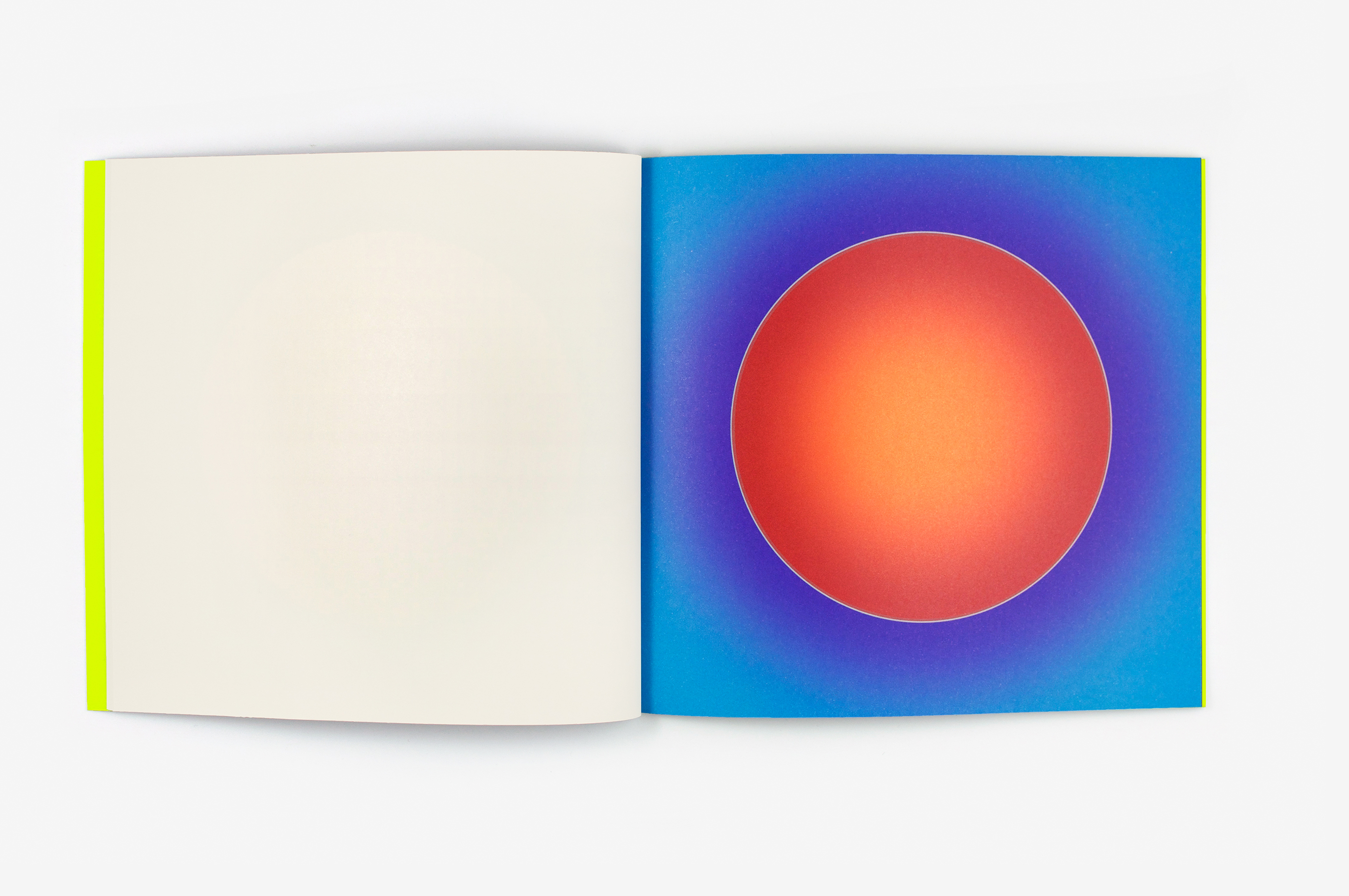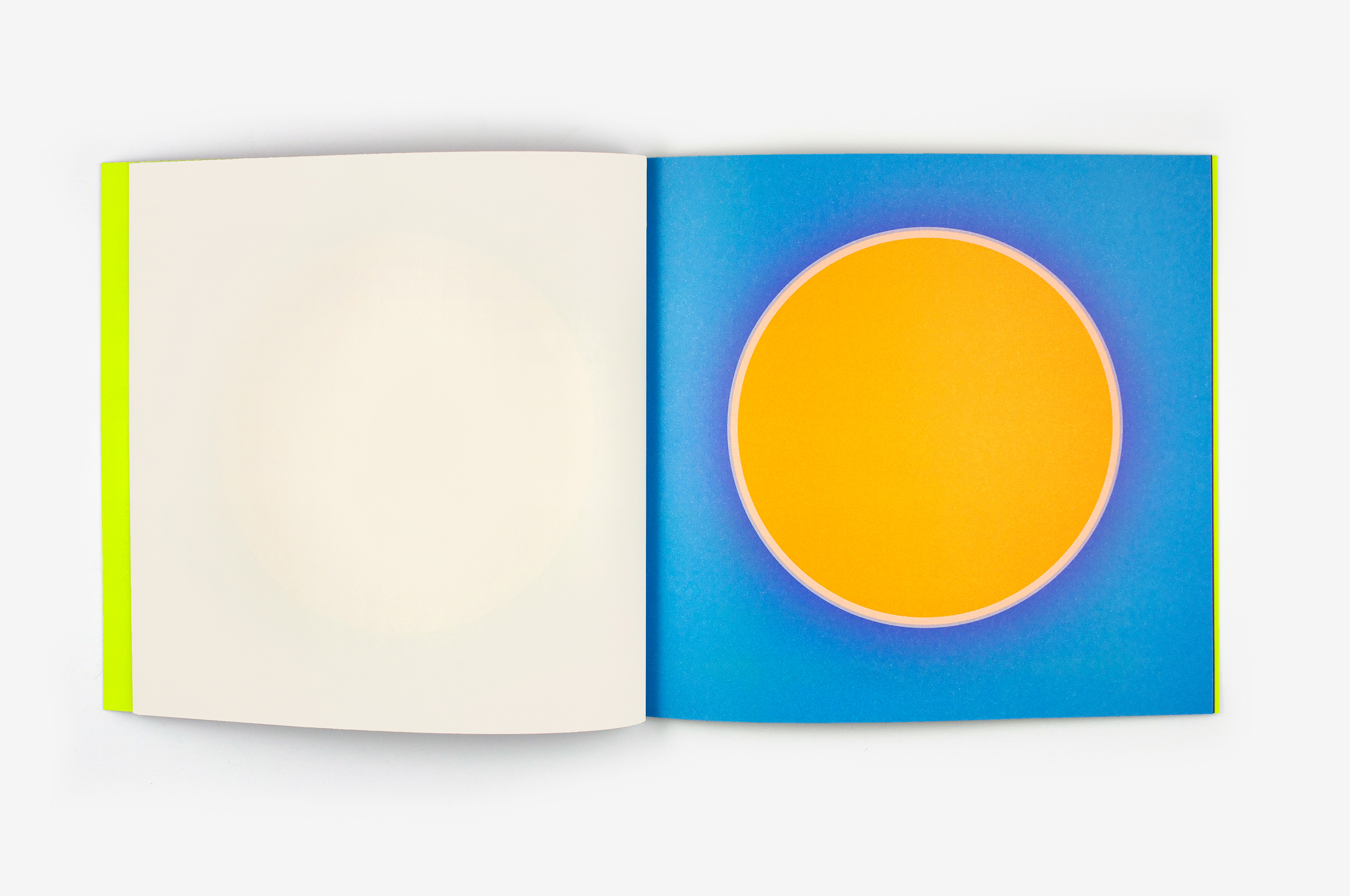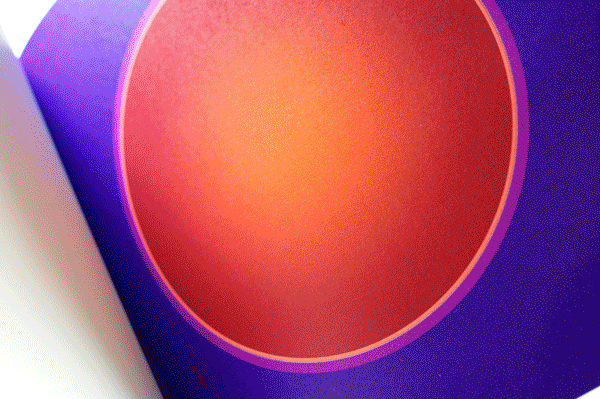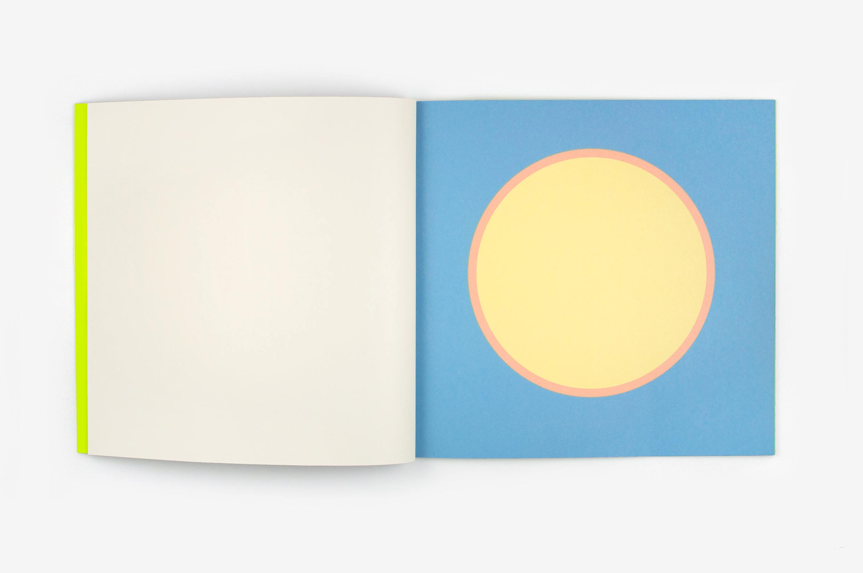 Au Soleil was dreamed up (literally) as a published twin of the book Dans la lune. Some characteristics of the books are identical (format, printing technique …). Others are different and emphasise the uniqueness of each book: number of pages, binding, paper, arrangement of forms and subjects… The simple illustration of the cycle of daylight hours in the book serves (as does the cycle in the moon book) as a pretext for a chromatic exploration within the confines of the book. The colour is diffused through a series of haloes between the sun and the sky that run into one another in an almost immaterial way. The subtle and vibrant light emanating from it tells us a story, that of a book “in itself”.