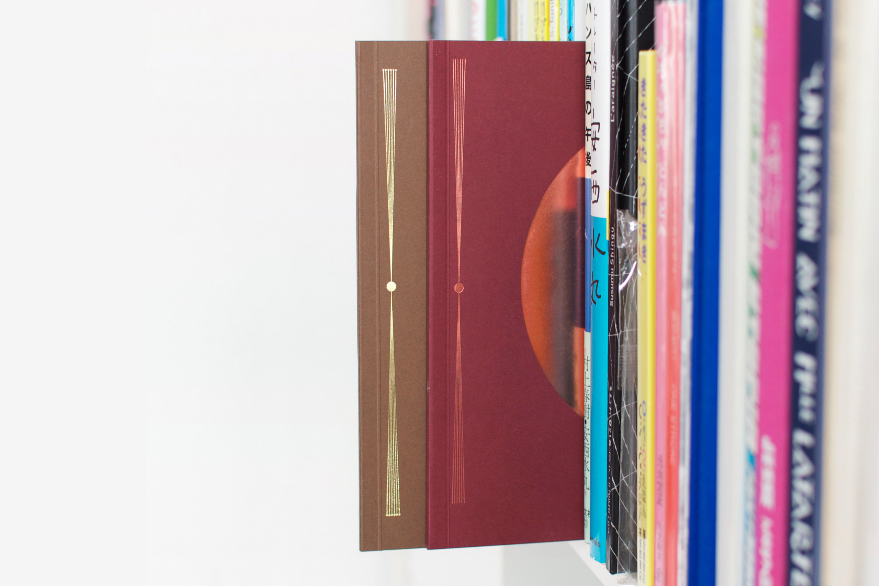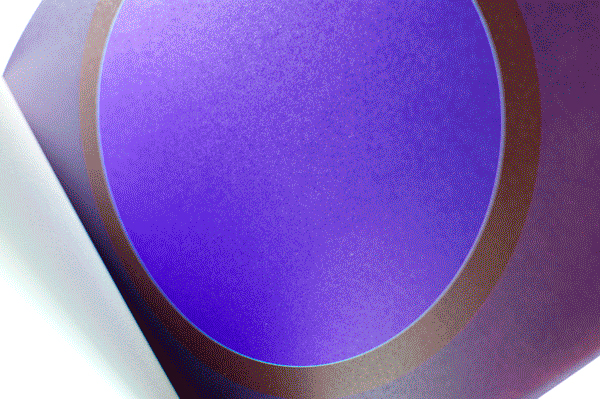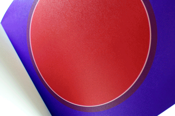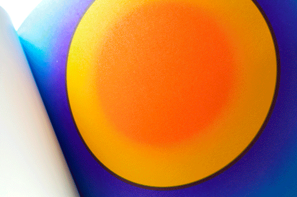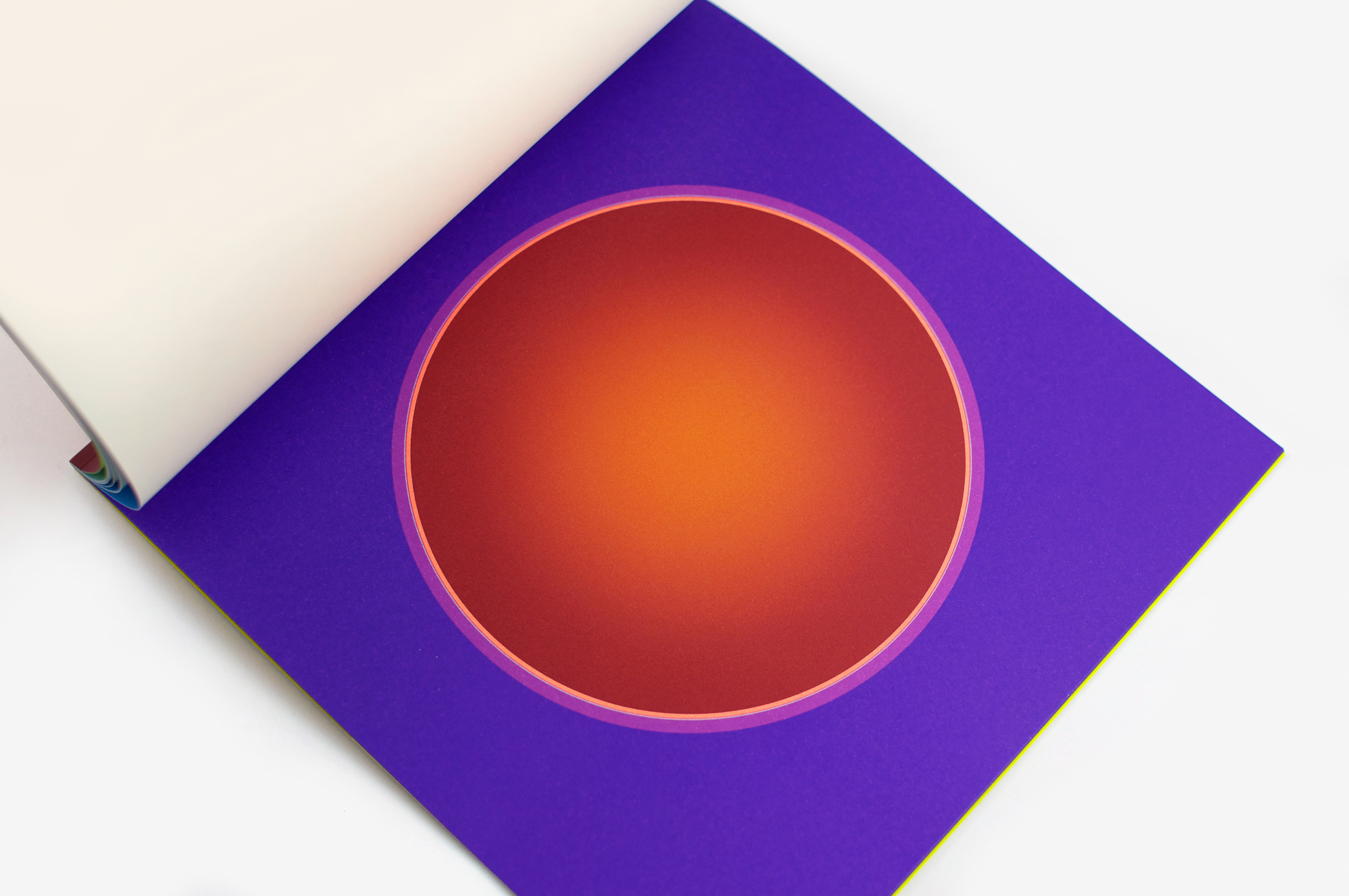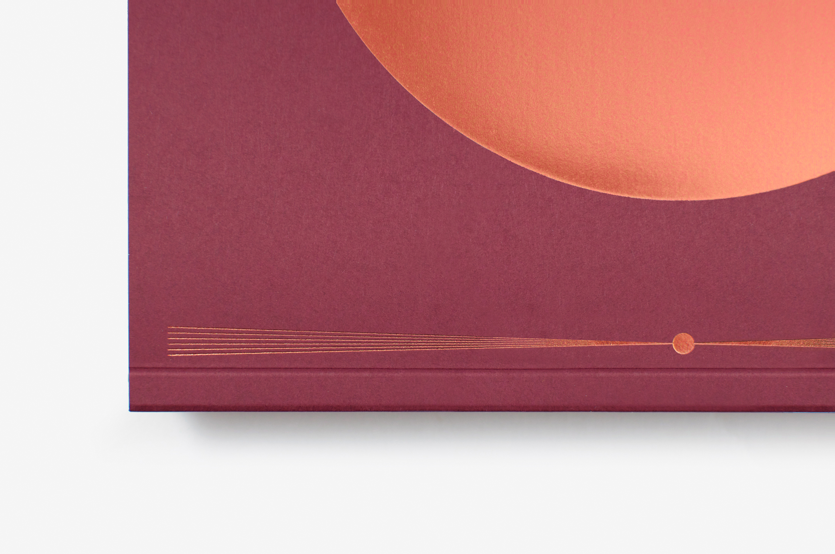 Au Soleil was dreamed up (literally) as a published twin of the book Dans la lune. Some characteristics of the books are identical (format, printing technique …). Others are different and emphasise the uniqueness of each book: number of pages, binding, paper, arrangement of forms and subjects… The simple illustration of the cycle of daylight hours in the book serves (as does the cycle in the moon book) as a pretext for a chromatic exploration within the confines of the book. The colour is diffused through a series of haloes between the sun and the sky that run into one another in an almost immaterial way. The subtle and vibrant light emanating from it tells us a story, that of a book “in itself”.