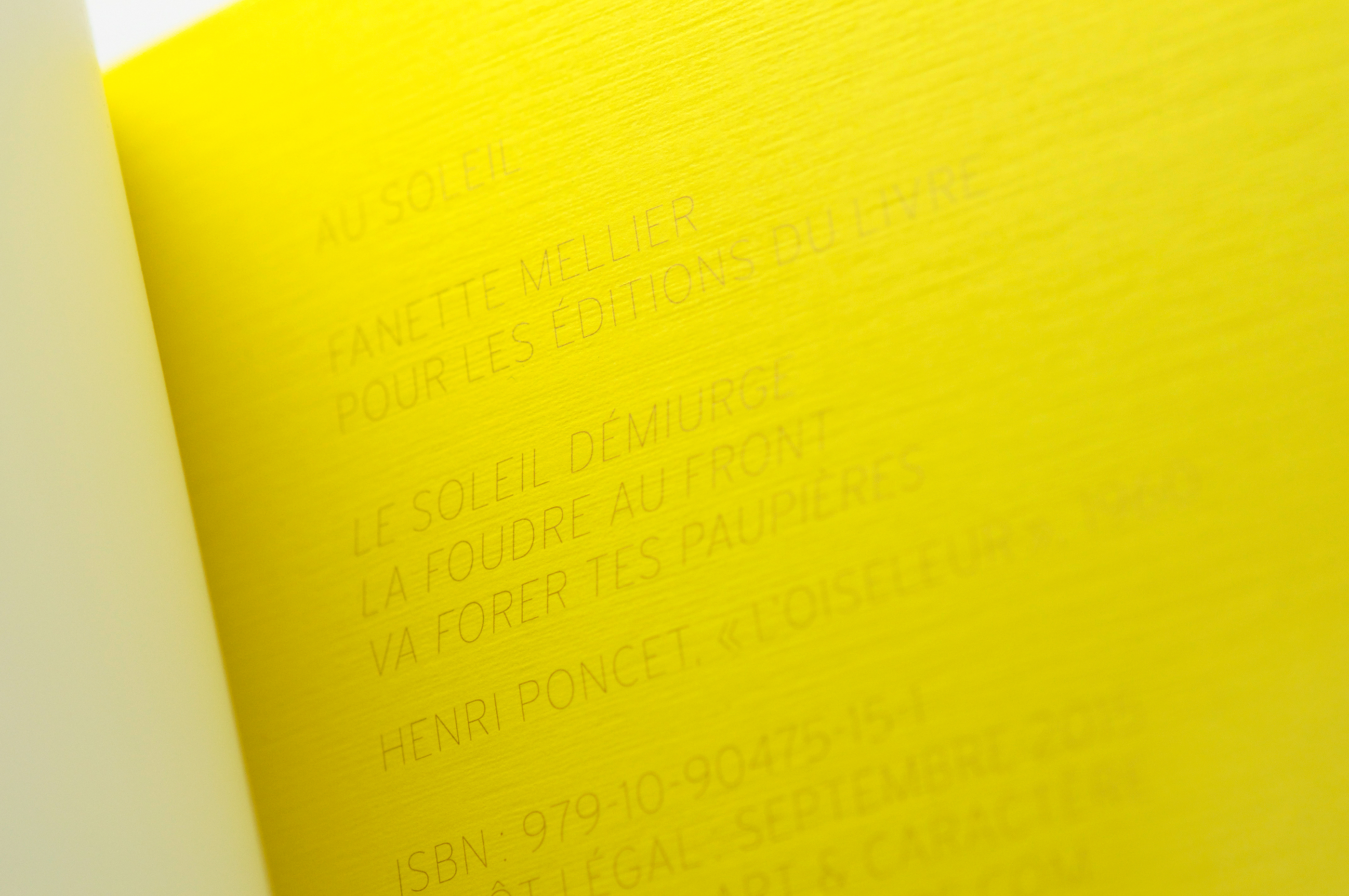 Au Soleil a été rêvé (au sens propre) comme le jumeau éditorial du livre Dans la lune. Certaines caractéristiques du livre sont identiques (format, technique d’impression…). D’autres diffèrent et mettent en évidence la singularité de l’ouvrage: nombre de pages, reliure, papiers, articulation des formes et des matières… La simple figuration du cycle des heures diurnes sert dans ce livre (en écho au cycle du livre-lune), de prétexte à une exploration chromatique, dans l’espace du livre. La couleur se diffuse par halos encrés entre le soleil et le ciel, par contaminations, de façon quasi immatérielle. La lumière subtile et vive qui en émane nous raconte une histoire, celle d’un livre «en soi».
