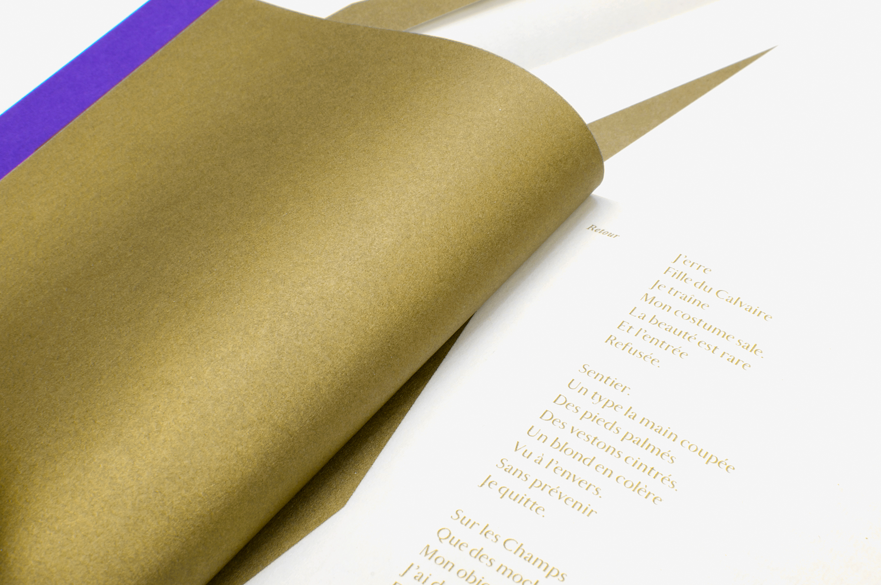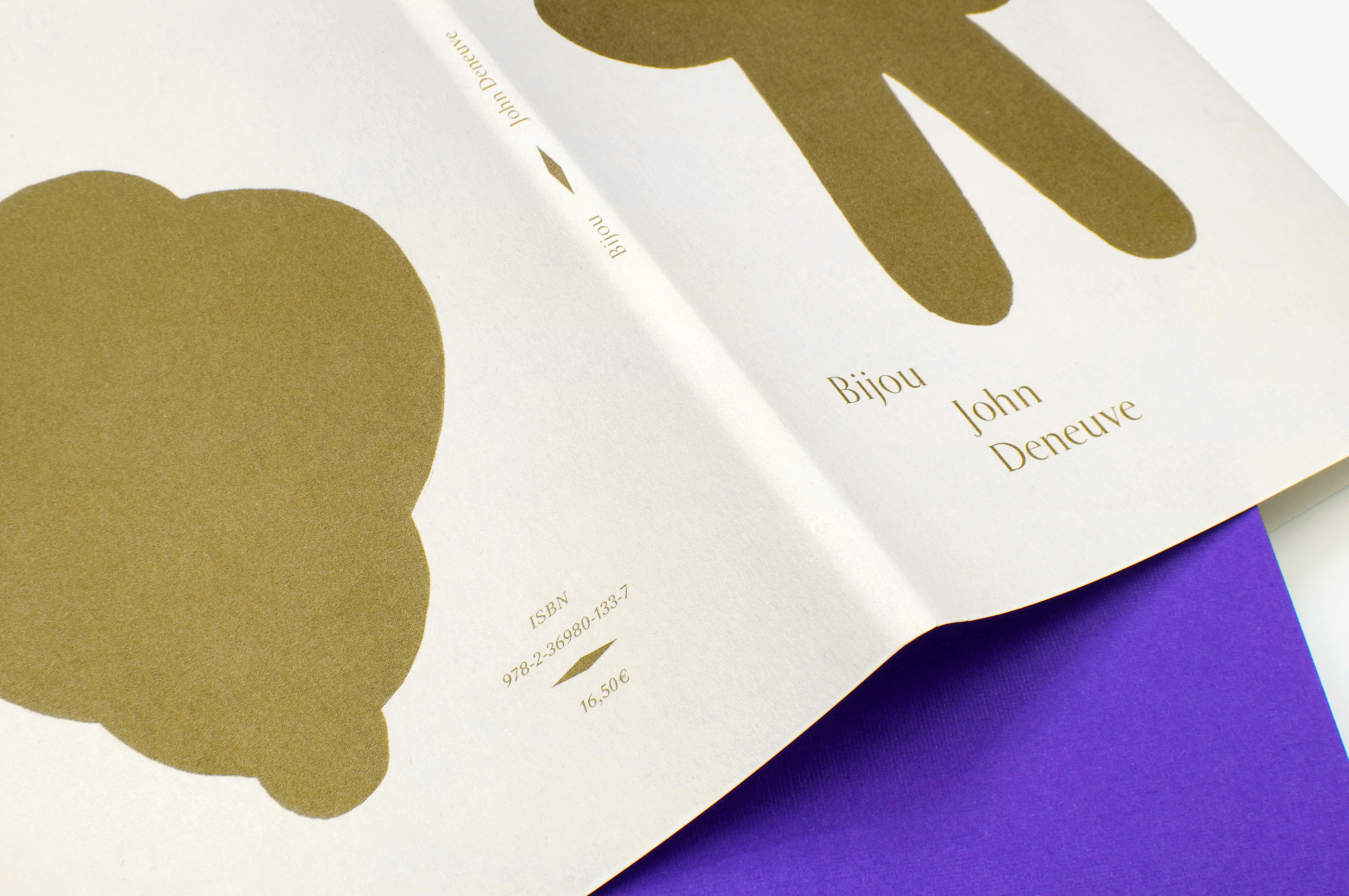 A classic design has been chosen for this first collection of poems by the artist and musician John Deneuve. The typography, the gold letters and the presence of a geometric shape emerging from the central fold convey a refinement that contrasts sharply with the irreverence of the author’s poems.