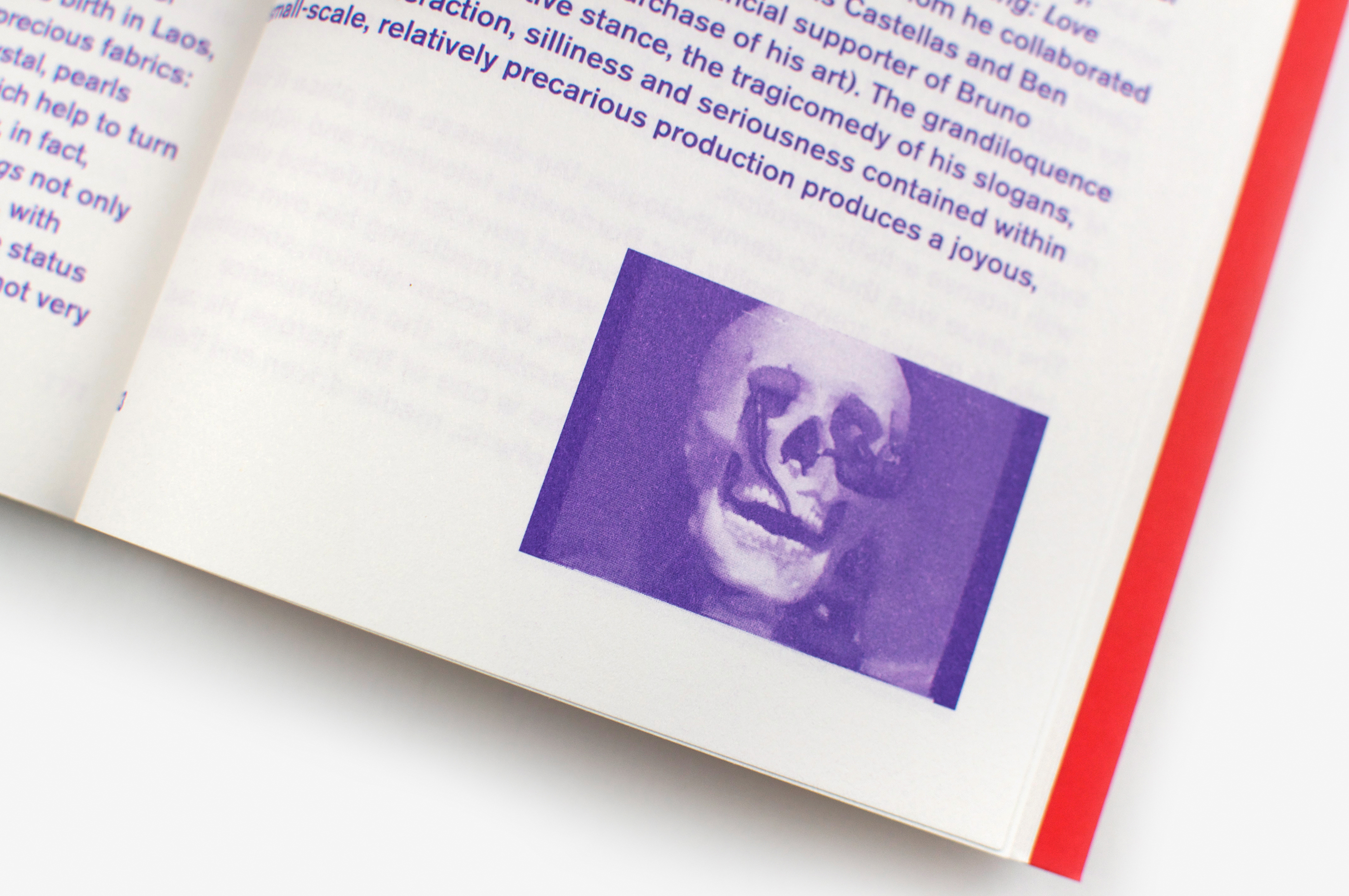 Ce livre sur l’artiste Bruno Pélassy, mort du Sida en 2002, est construit autour d’un texte de Marie Canet, mettant en lumière le lien entre son œuvre et la maladie. Dans sa souplesse comme dans son format et son articulation, le livre a été dessiné pour être lu. Le similicuir couleur chair de la couverture (contrecollé sur papier rouge), accueille le nom de l’artiste, doré à chaud et auréolé de flammèches. Le cahier image qui entame le livre, traverse de façon fulgurante, en 16 pages, la délicatesse de l’œuvre de Bruno Pélassy. Le texte, mis en page comme un roman (mais imprimé en couleur) prend le relais. Sur chaque page de droite est incrustée en vignette une capture d’écran du film Sans titre, sang titre, cent titres, œuvre manifeste de l’artiste, vouée à disparaître car fragilisée à chaque projection du fait du support vidéo. Cette œuvre traverse le livre à la manière d’un flip book, ancrant dans la matière du livre la notion de temporalité qui consume l’œuvre de l’artiste.