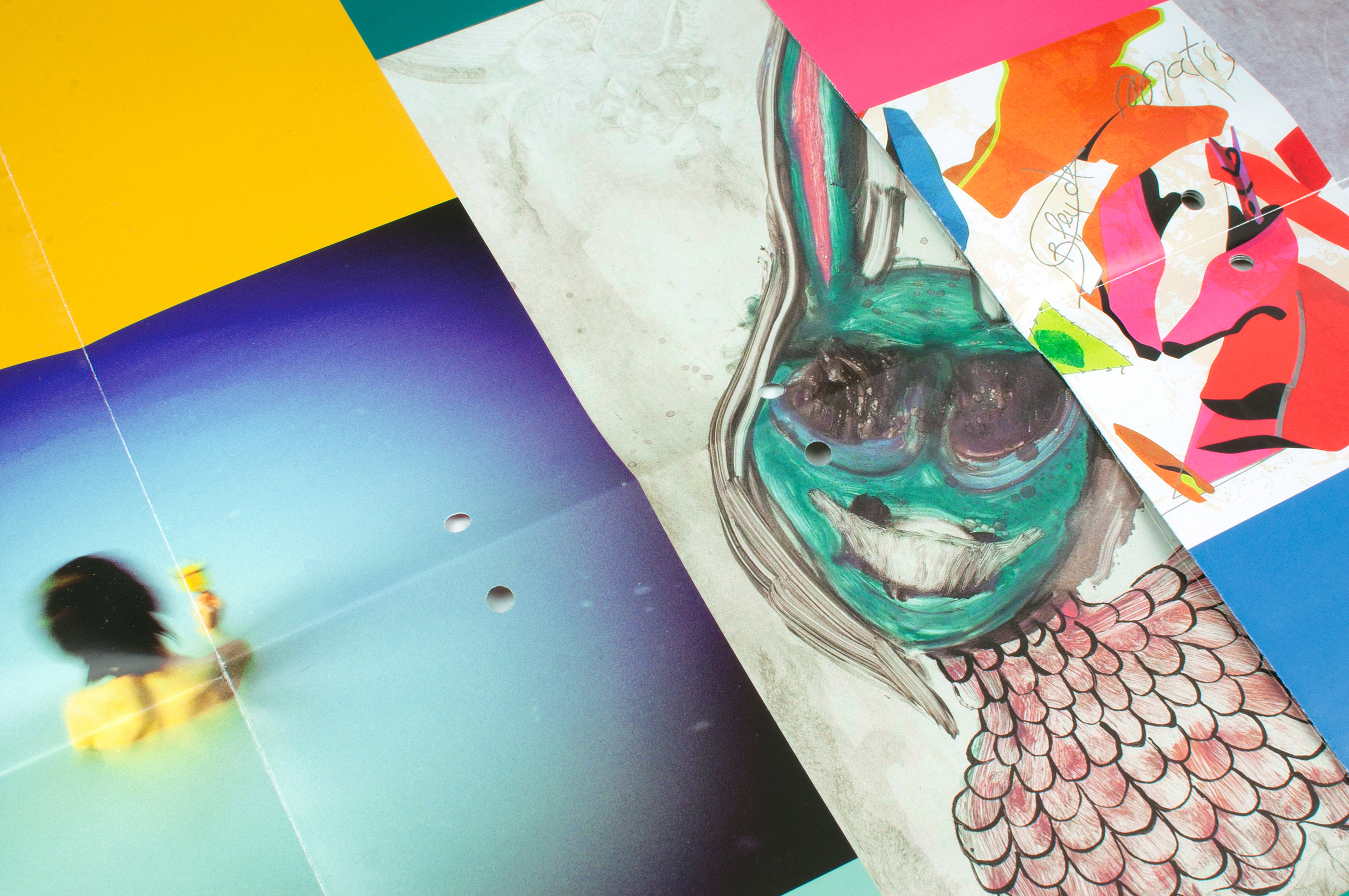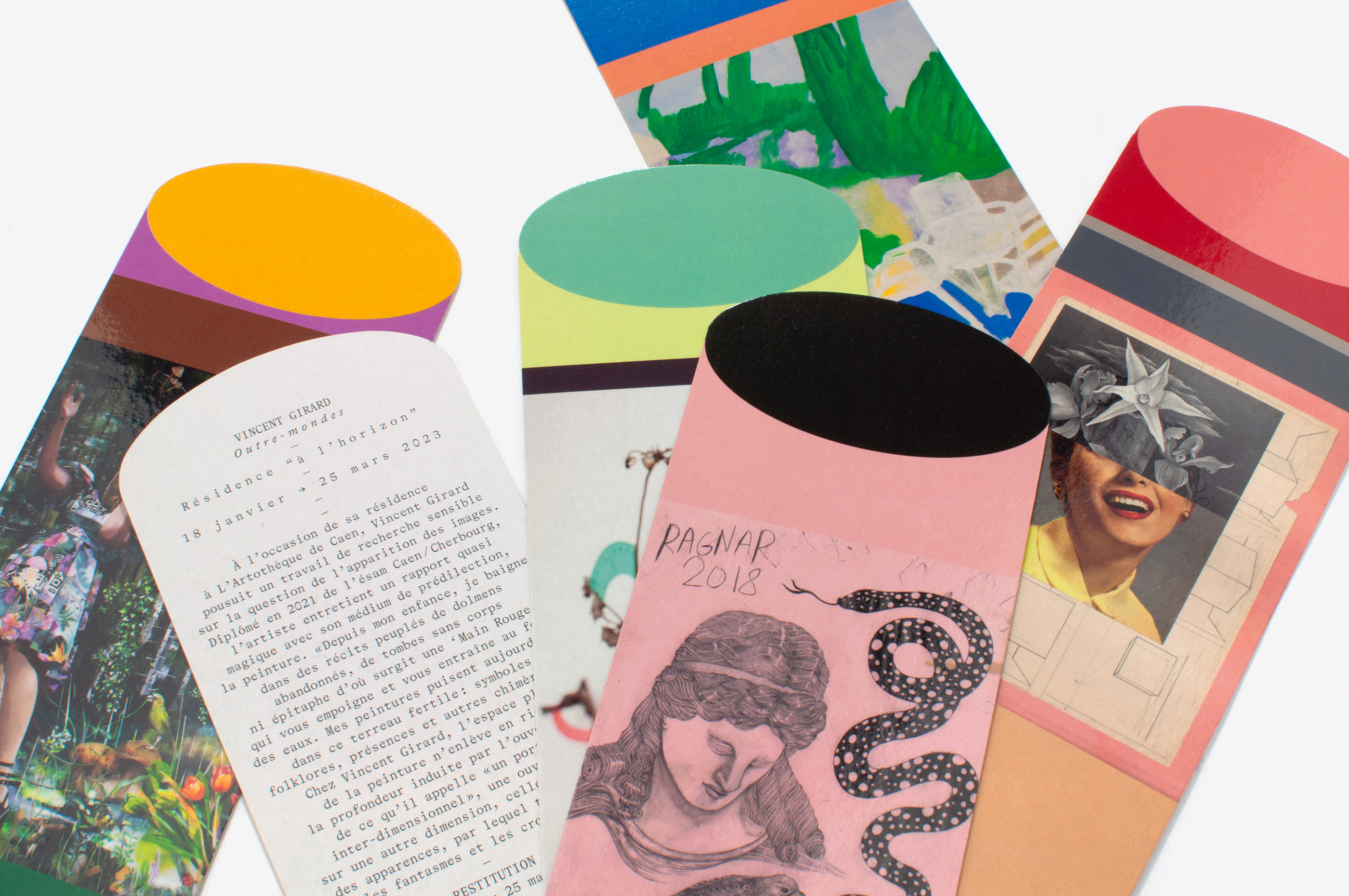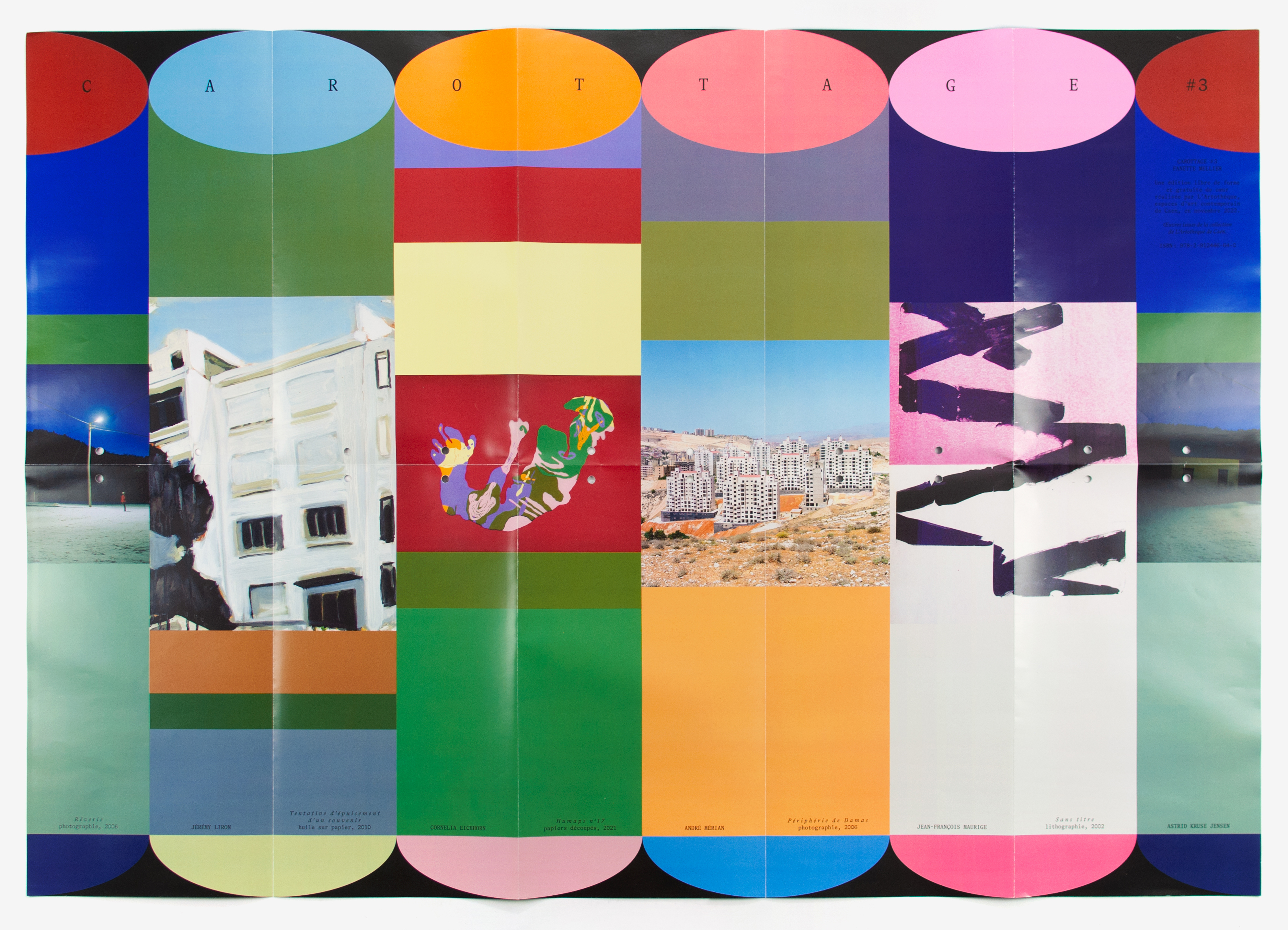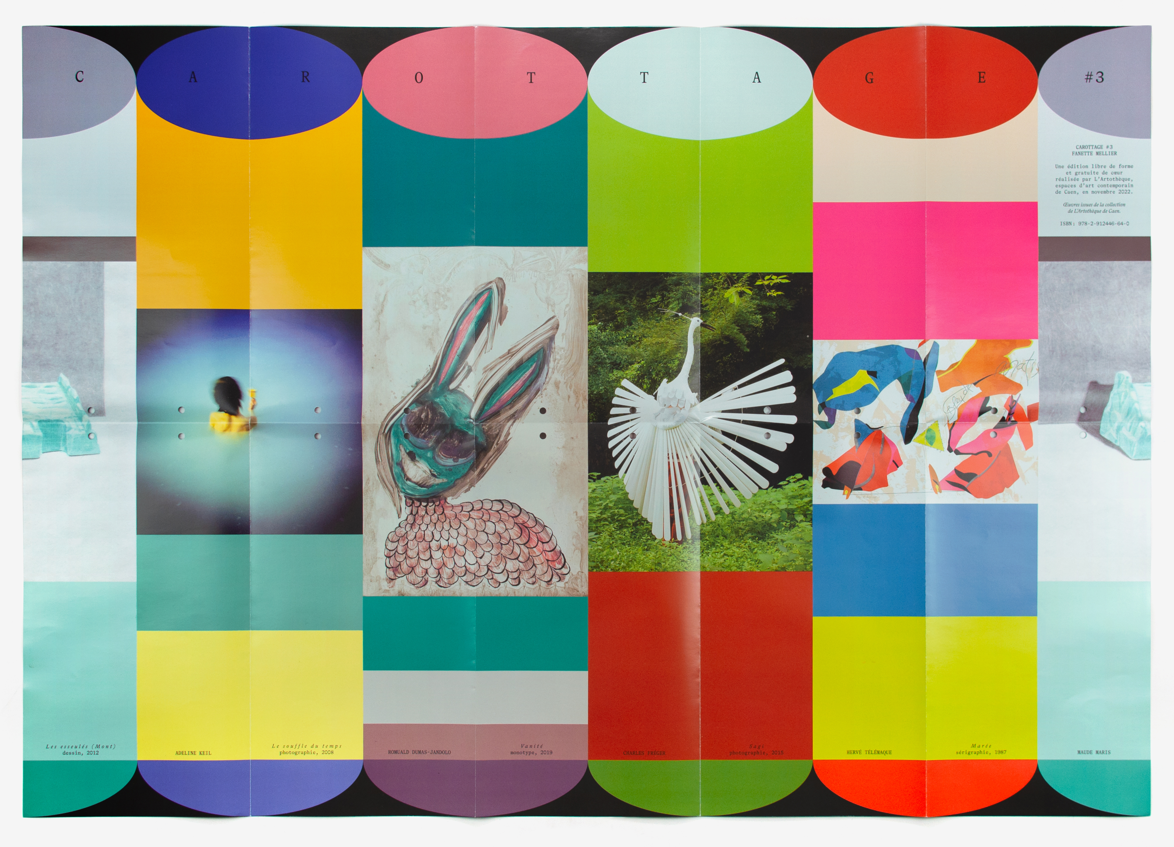 Carottage est une invitation annuelle de L’Artothèque de Caen, faite à un.e graphiste. Le carottage est un type de forage d’exploration, visant à prélever un échantillon à l’aide d’un tube appelé carottier. Dans le cadre de ce projet, j’ai imaginé des carottages graphiques, qui replacent les œuvres au sein d’une gamme colorée autonome, et prennent la forme d’une série d’invitations. Le journal offrent un regard éditorial sur la collection et permet de juxtaposer les œuvres de multiples façons grâce aux jeux de pliage. Les reproductions sont placées dans les carottages de couleurs qui font de ce journal un outil de composition. Carottage est aussi une affiche, dont le centre n’est pas investi par une œuvre de la collection mais par une encre miroir.