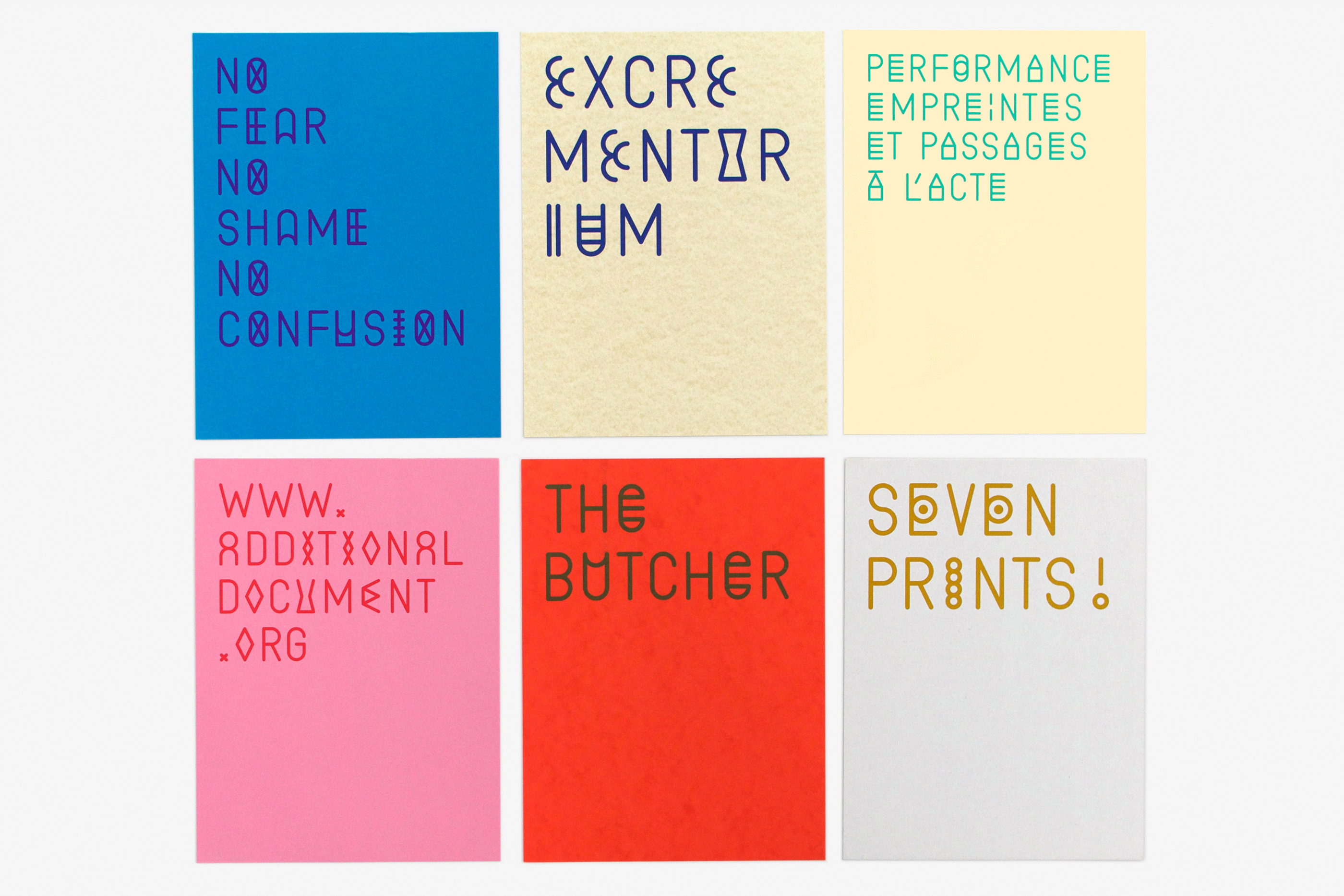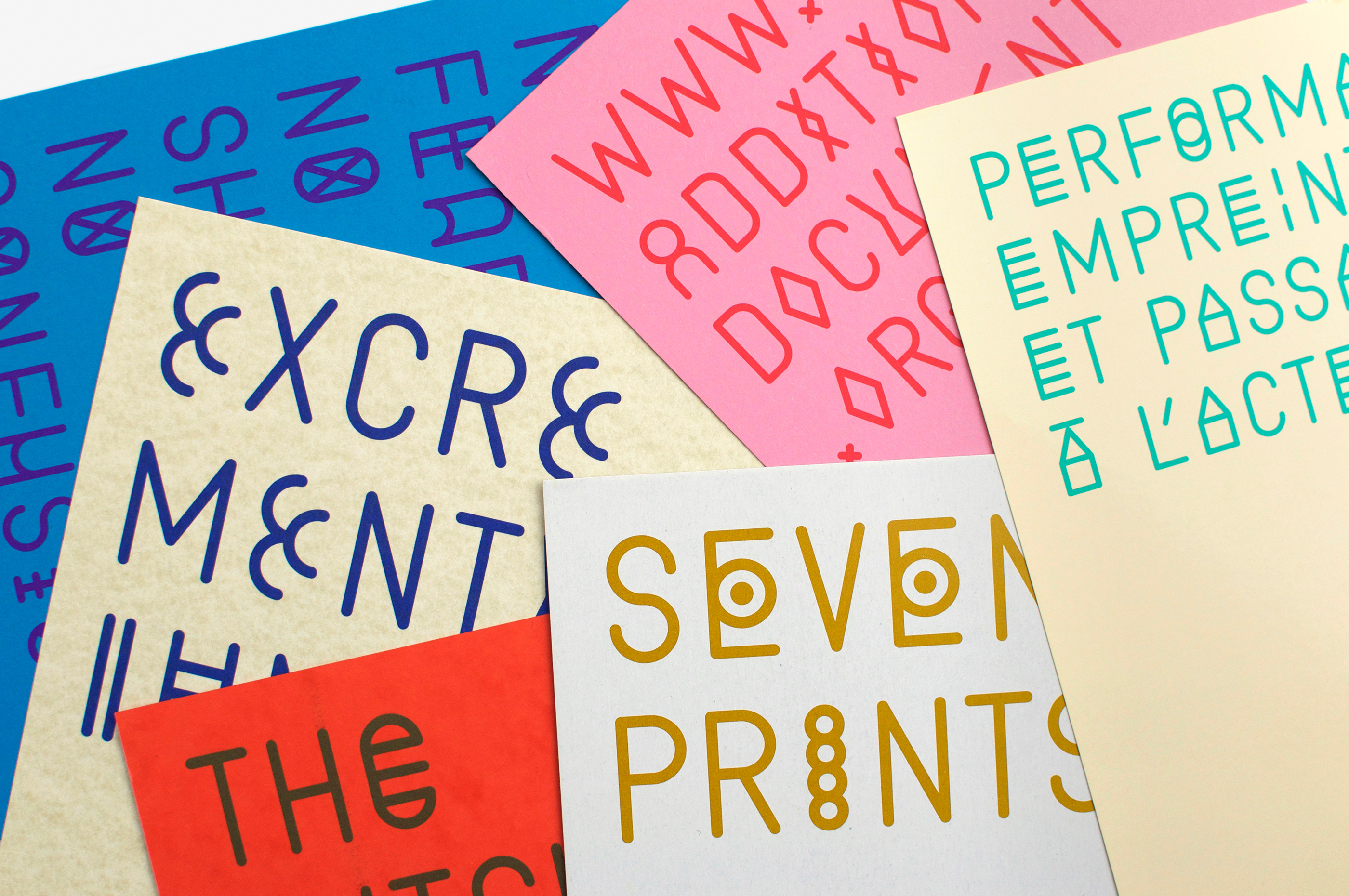 Cartel is made up of different associations (located in Marseille) active in the field of contemporary art. Each member has a unique approach and has its own visual identity. The simplicity of the graphic system reflects this composite identity. All communication is based on an original script, the consonants are used commonly, by all members of the Cartel. Vowels are, however, specific to each of the six associations, which has its own version of the alphabet. The unconventional design of these vowels, more graphic than typographical, only decipherable in the flux of the text. The overall sense of diversity is echoed further, by the multiplicity of colors, types of paper and varied formats and media.