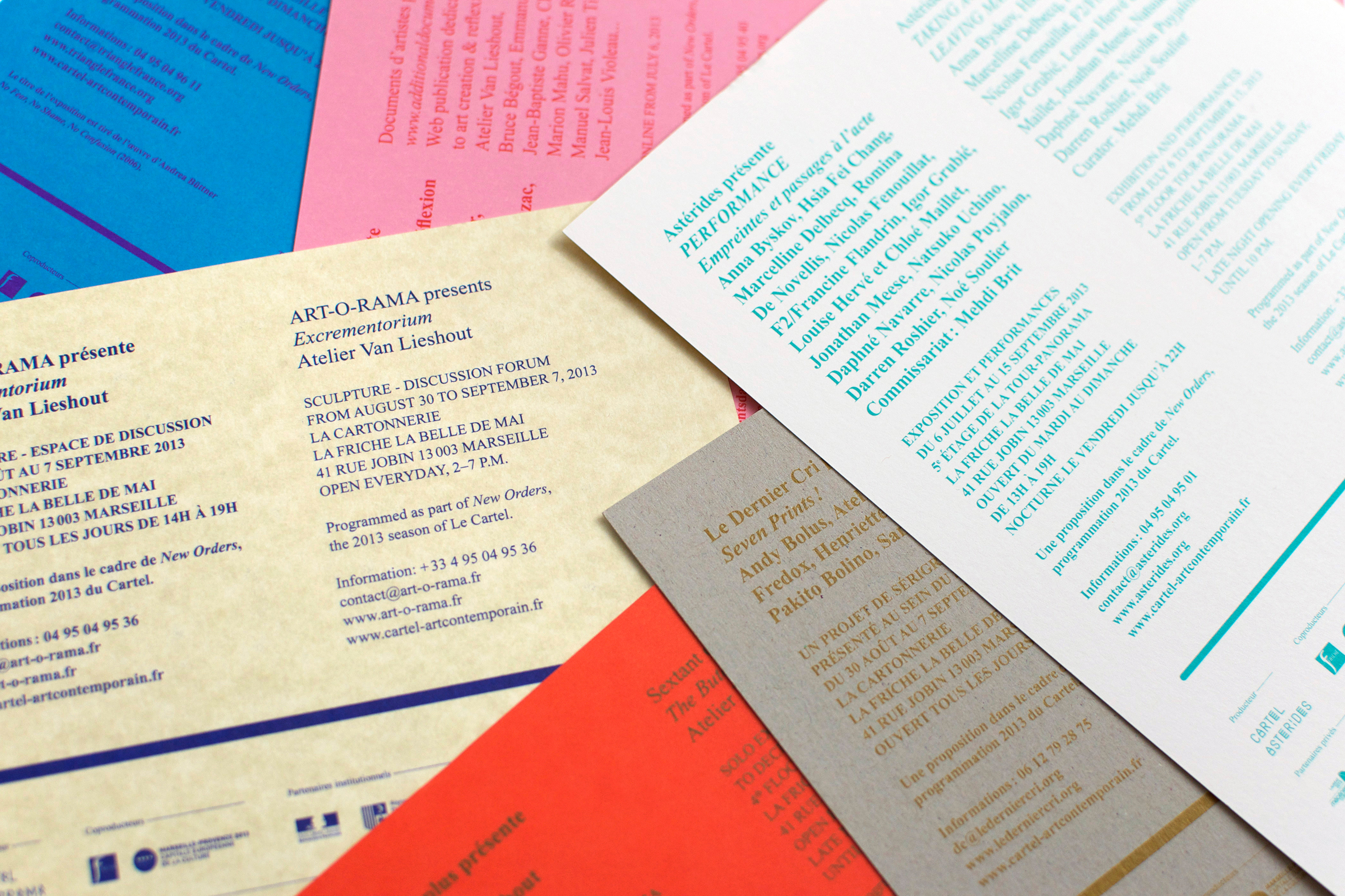 Cartel regroupe des associations (situées à la Friche la Belle de mai, à Marseille) qui agissent dans le champ de l’art contemporain. Chaque membre a une démarche singulière et possède son identité visuelle propre. La simplicité du système graphique reflète cette identité composite. Toute la communication est basée sur un alphabet original, dont les consonnes sont communes à tous les membres du Cartel. Les voyelles sont en revanche spécifiques à chacune des six structures, qui possède sa propre version de l’alphabet. Le dessin peu conventionnel de ces voyelles, davantage graphique que typographique, rend la lecture possible uniquement dans le flux du texte composé. La multiplicité des couleurs, papiers et matières des supports fait aussi écho à cette diversité.