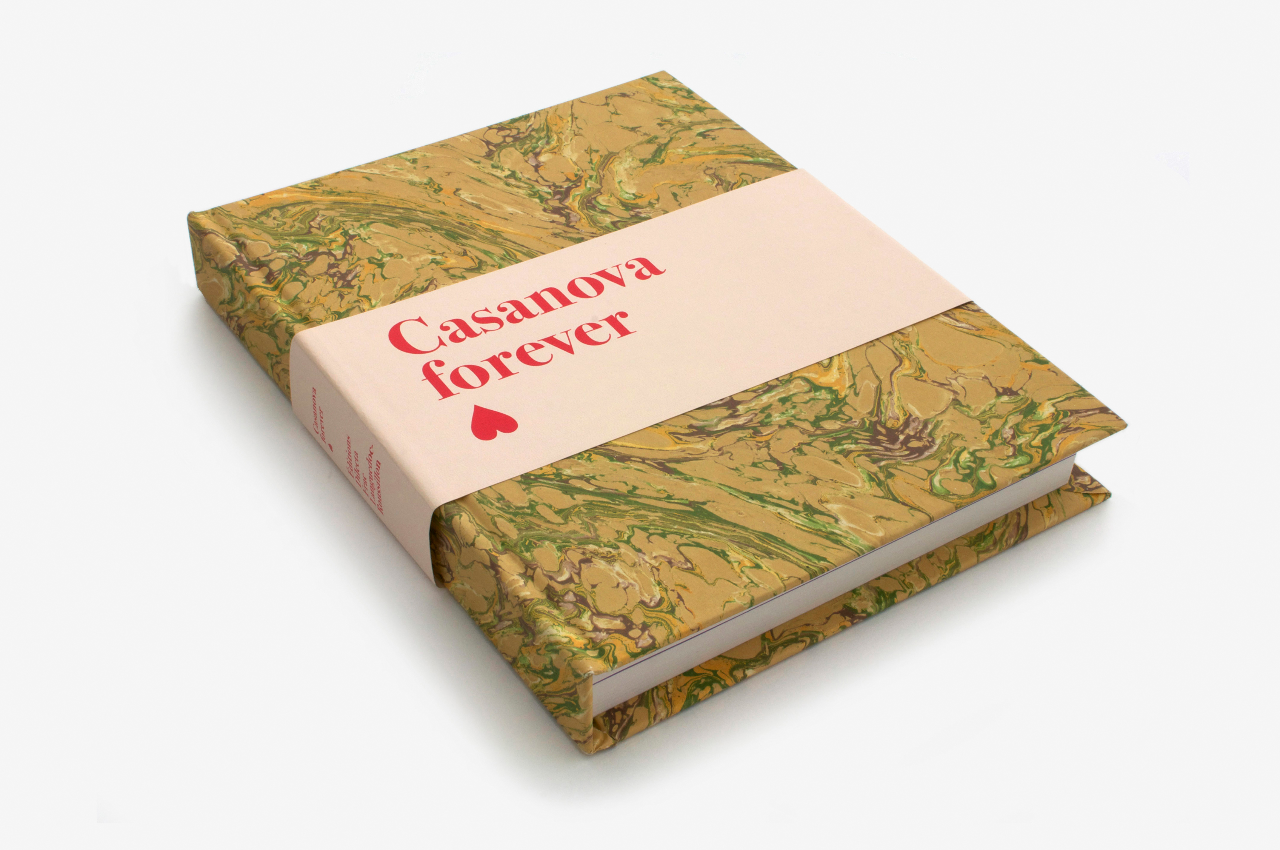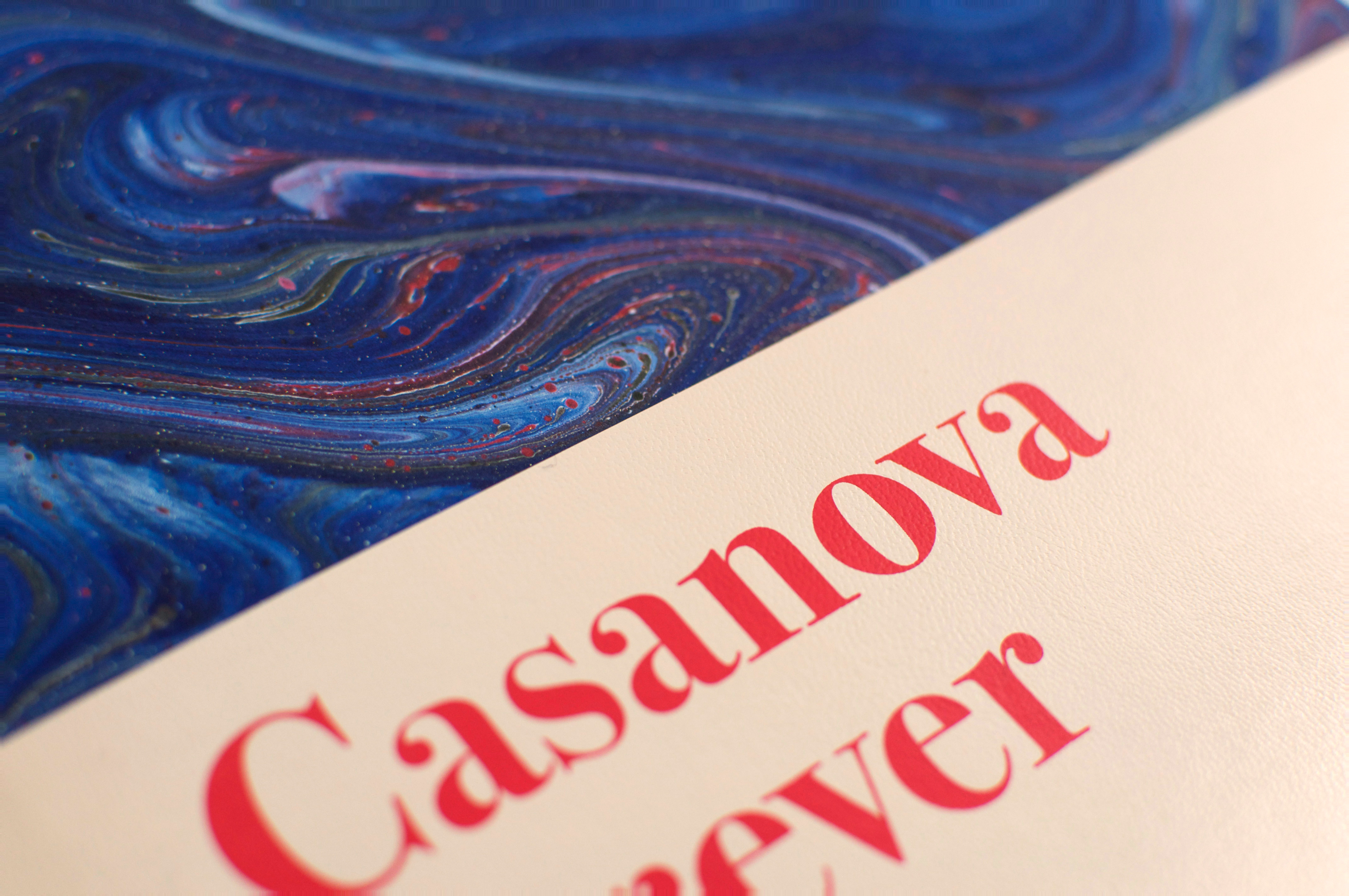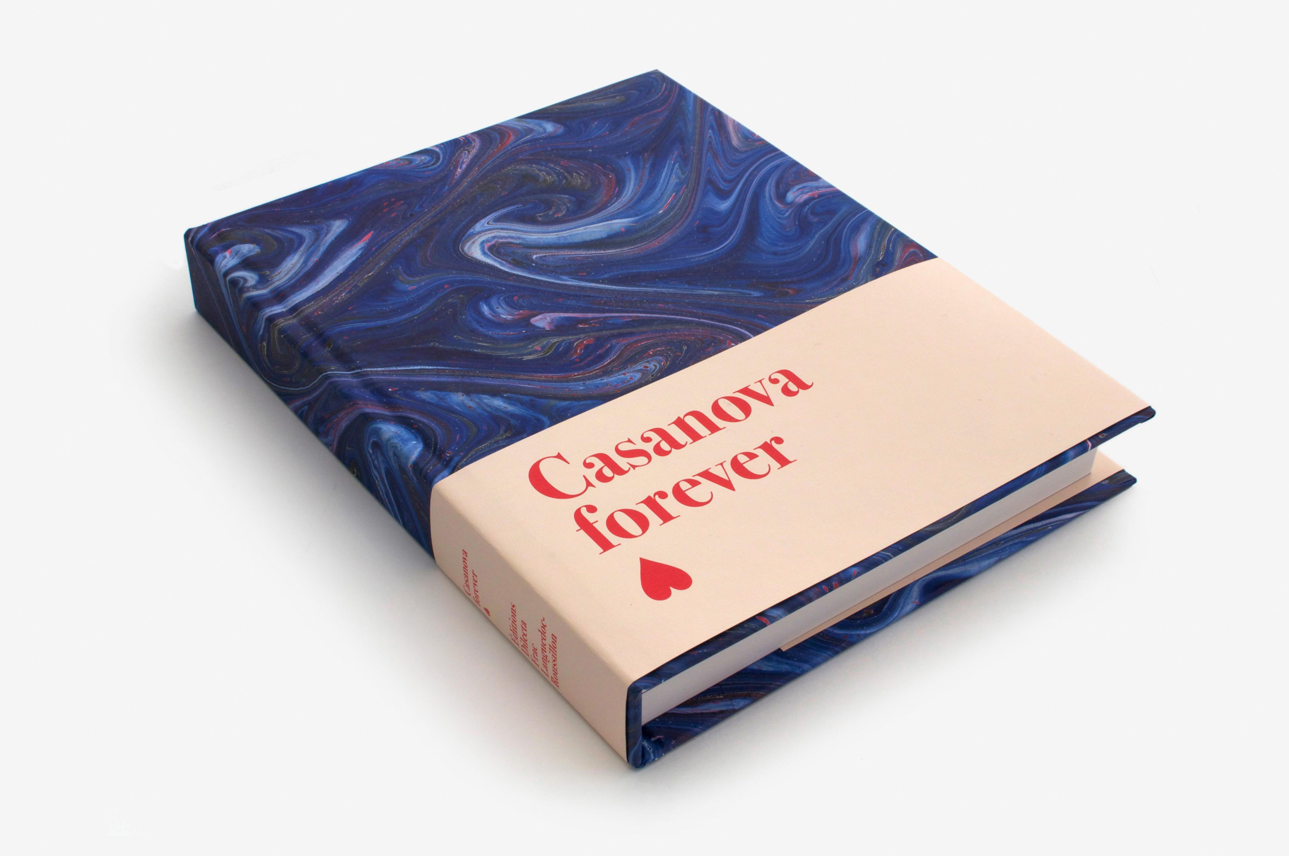 Catalogue d’une manifestation regroupant une trentaine d’expositions d’art contemporain autour de la figure de Casanova. L’ouvrage est constitué de chapitres monographiques sur les artistes exposés, en alternance avec des textes de chercheurs Casanovistes. De nombreux papiers marbrés artisanaux ont été utilisés pour la couverture et les pages de garde. Les combinaisons aléatoires font que chaque ouvrage est unique. Les mélanges sont parfois harmonieux, souvent dissonants: toujours étonnants! Le choix du papier marbré, très prisé au dix-huitième siècle, constitue une référence bibliophilique en écho à la personnalité fantasque de Casanova, adepte du jeu, des fluides et des plaisirs inattendus. Le livre est entièrement composé en Bodoni, et la simplicité de la mise en page permet d’ordonner un contenu foisonnant. La couleur violette (couleur du sacré!) vient souligner la présence aigüe de Casanova (encre violette pour les extraits de ses Mémoires, papier violet pour l’insert de textes inédits, tranchefile, etc.)…