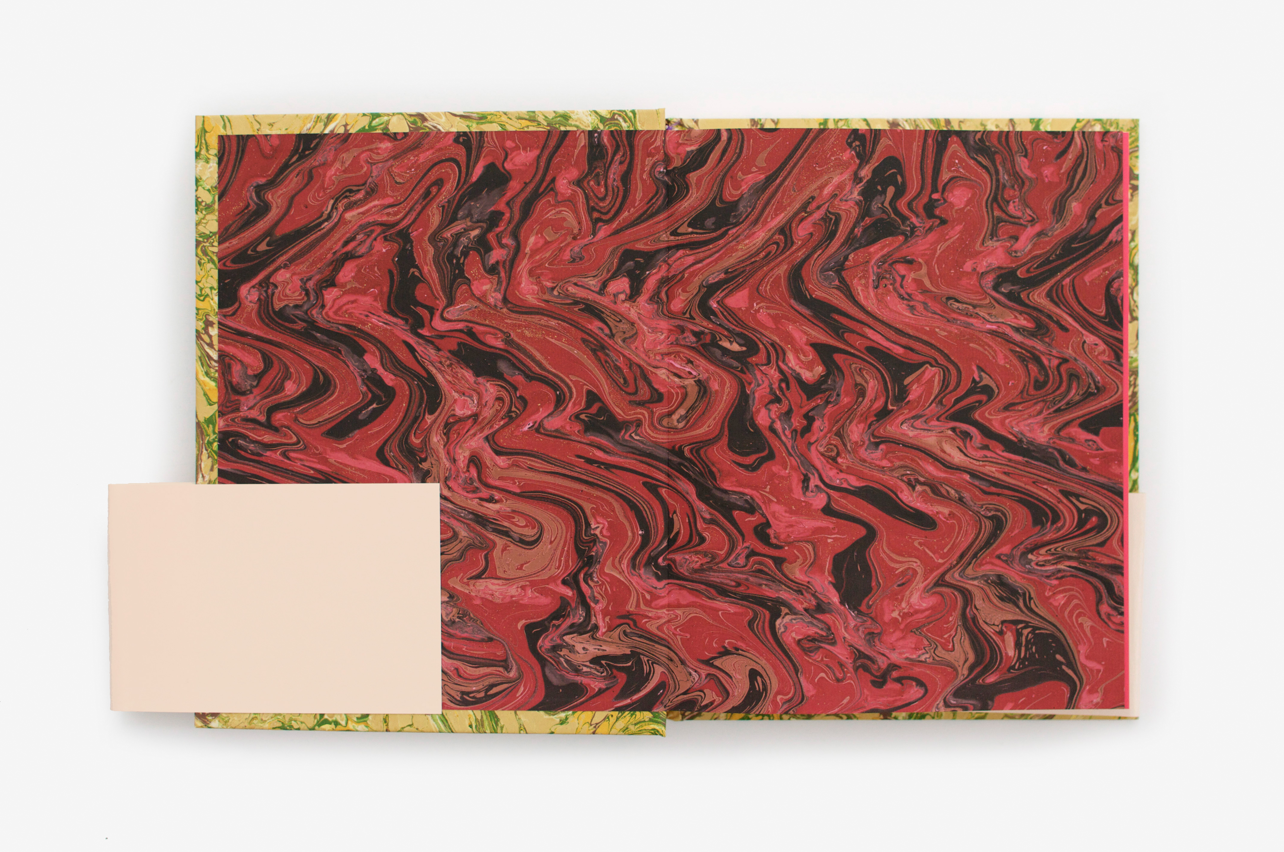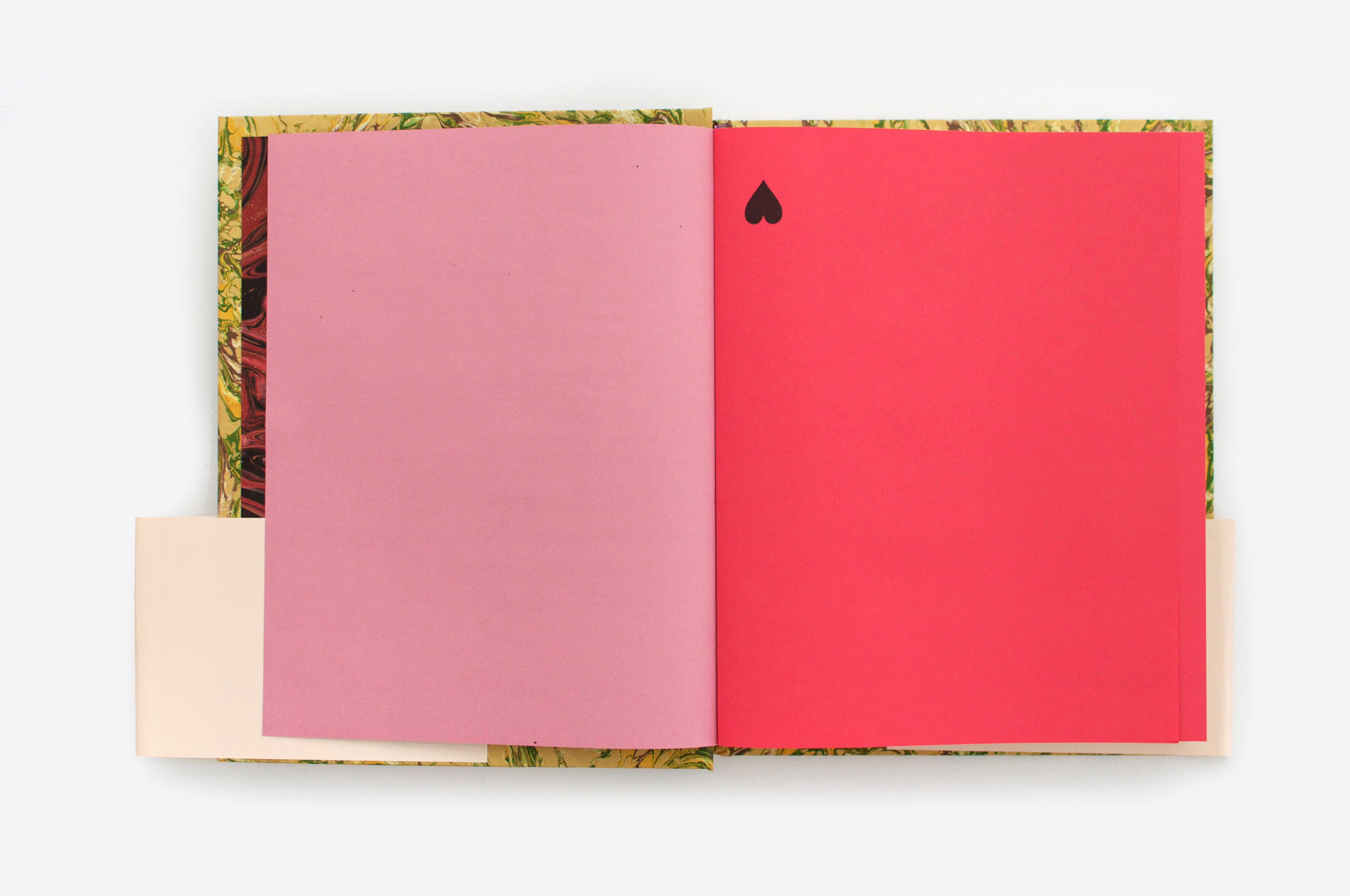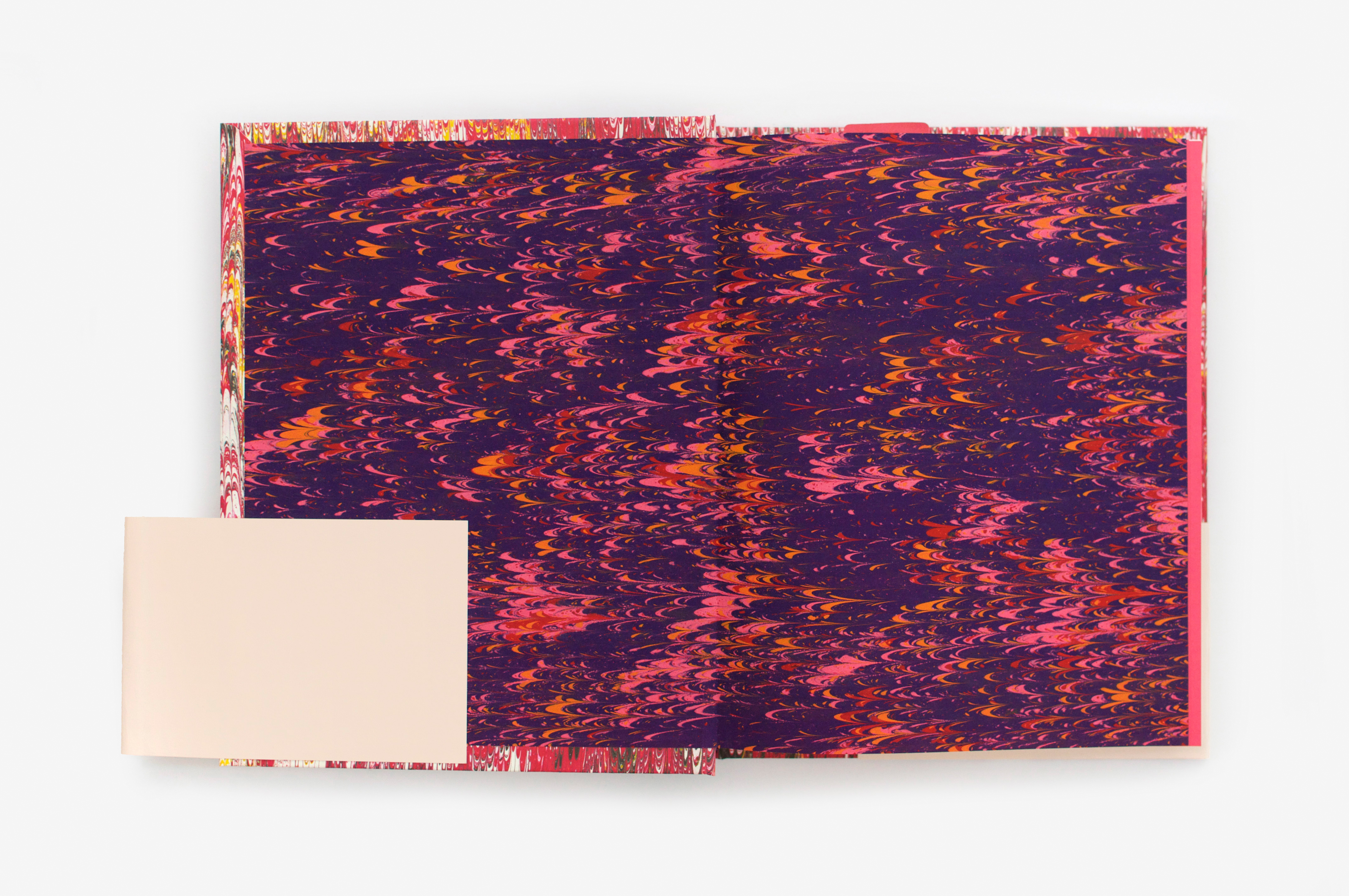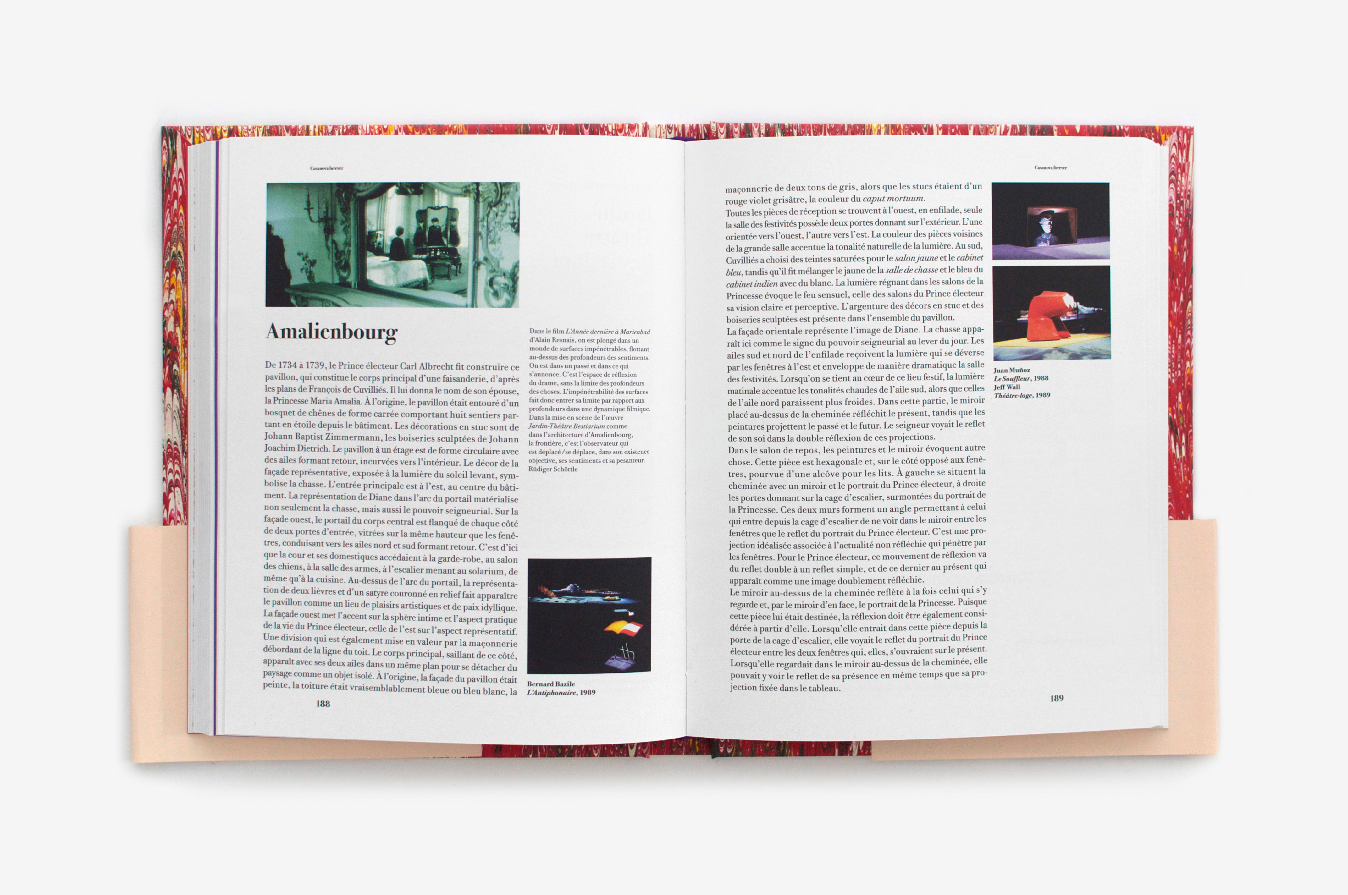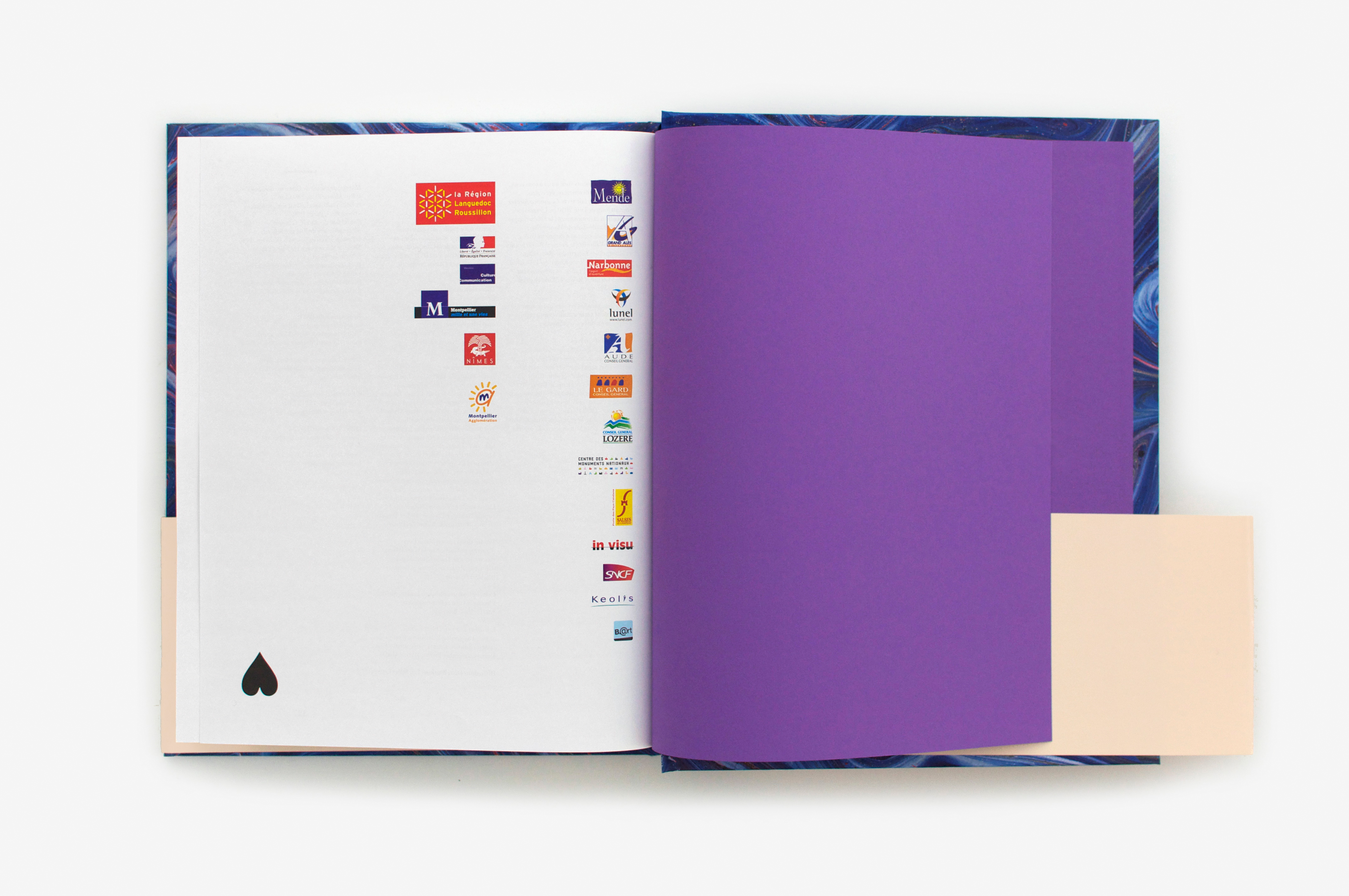 Catalogue of an event bringing together thirty contemporary art exhibitions around the figure of Casanova. The book is composed of monographic chapters on the artists, alternating with some texts written by “Casanova researchers”. Several craft marbled papers were used for the cover and endpapers. The random combinations of these make each book unique. This mix and match creates sometimes harmonious, sometimes dissonant associations, still always amazing! The choice of marbled paper, popular in the eighteenth century, is a bibliophile reference echoing Casanova’s fanciful personality, a devotee of game, fluids and unexpected pleasures. The book is entirely composed in Bodoni, and the simplicity of the layout allows this bountiful content to be organized. The purple (holy color!) emphasizes the acute presence of Casanova (purple ink for the extracts of his Mémoires, purple paper for the insert of unpublished texts, headband, etc.)